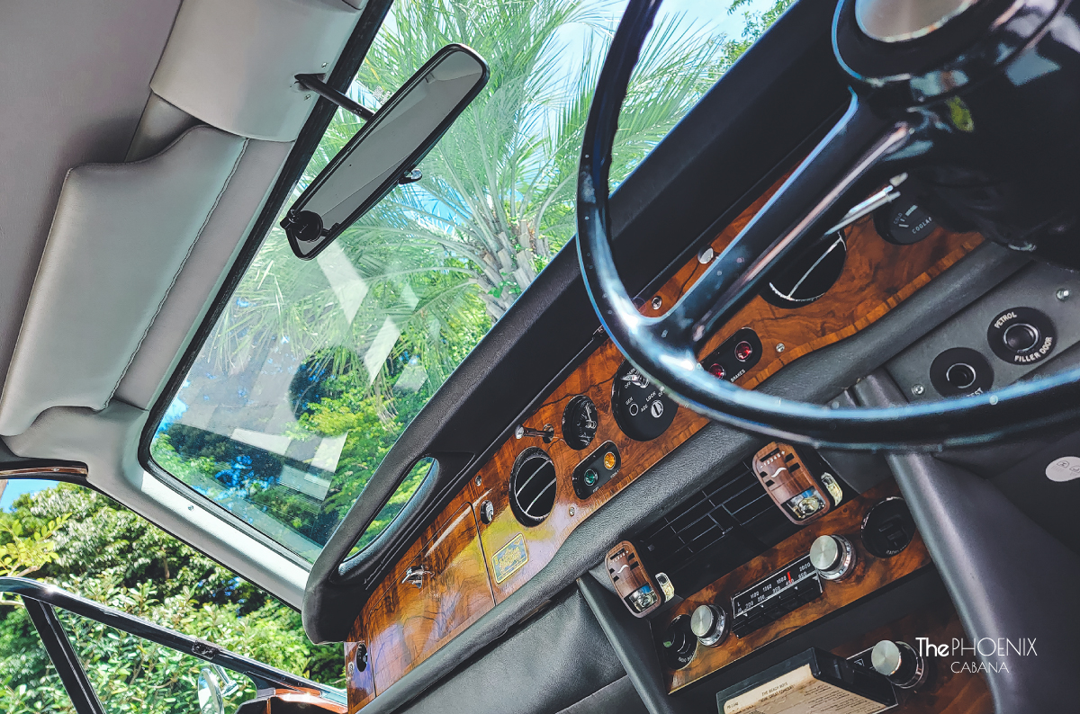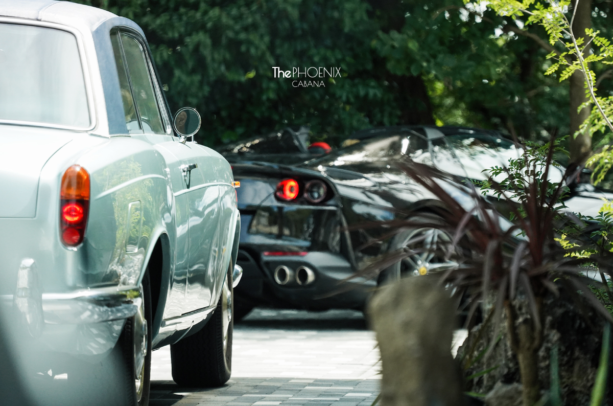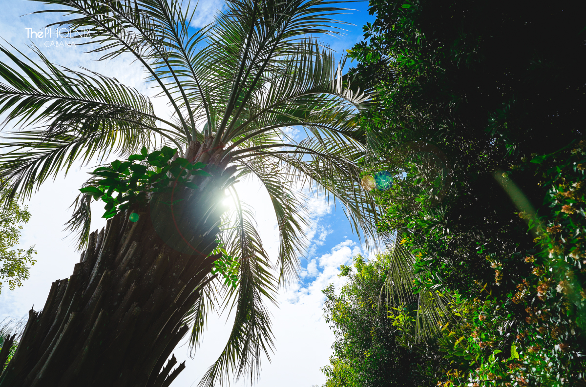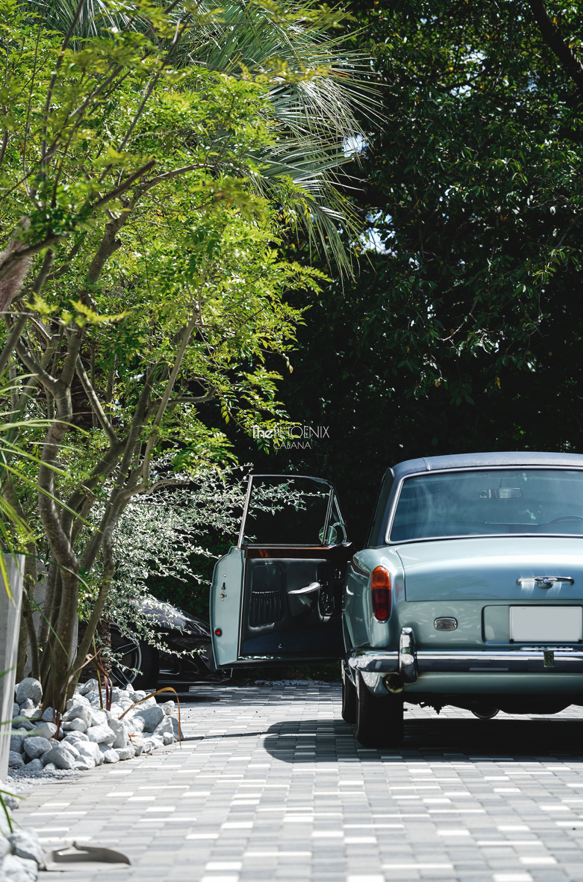 南西に開けた600坪を超えるコーナーロットの敷地は周囲の土地や道路から少し上にある砲台形状となる。そのことで周囲からの水平方向の視線を受けずプライベート感が担保されている。また、適度に風も抜け庭内の草木の生育にも良さそうだ。ガーデンには数多くのパームツリーと様々な樹種の大木が育つ、元々この敷地は大手企業の保養所の一角であったことで贅沢に木々が設えられているのだろう。樹木の足元は野芝でグランドカバーされグリーンのカーペットに木々の葉の影が落ちる姿とスイミングプールの水面がきらめくさまは何ともリッチで気分が良い。建物の周囲を巡るロータリーも素敵だ、車路の両サイドに育つ木々を眺めながらドライブスルーする感覚は植物園を巡っているようだ。
