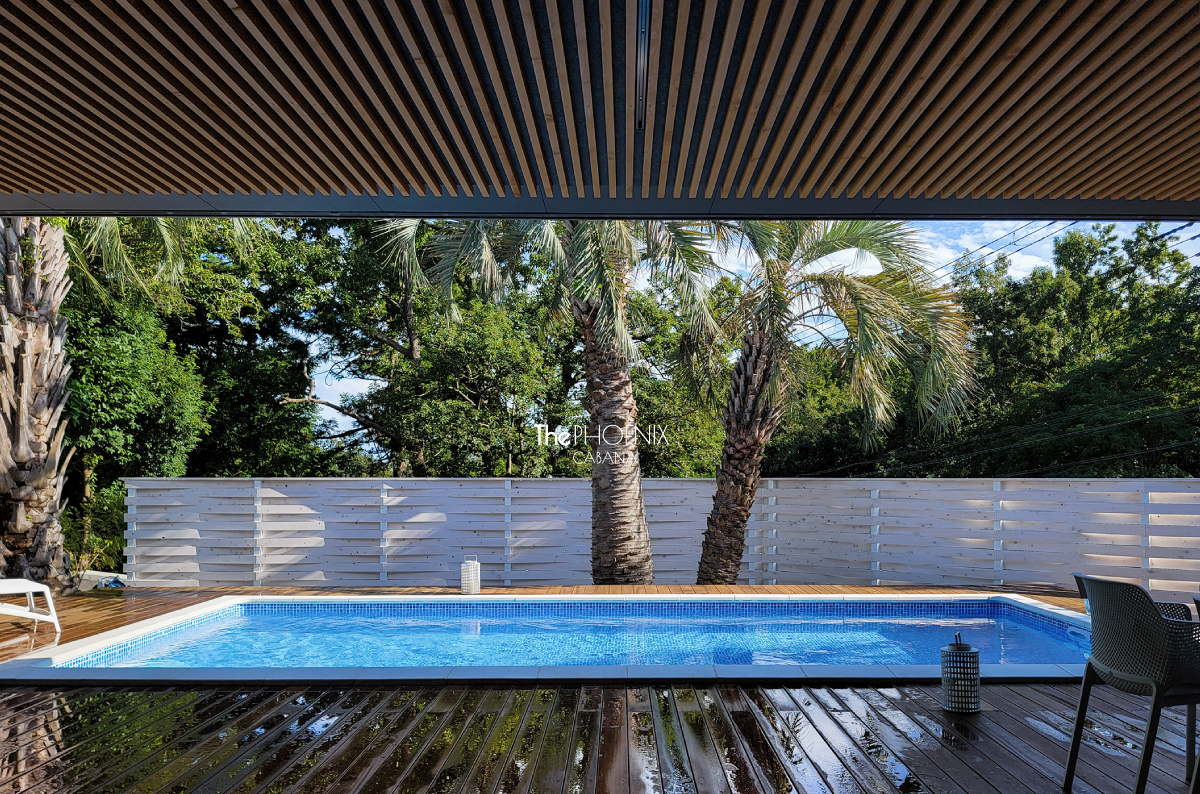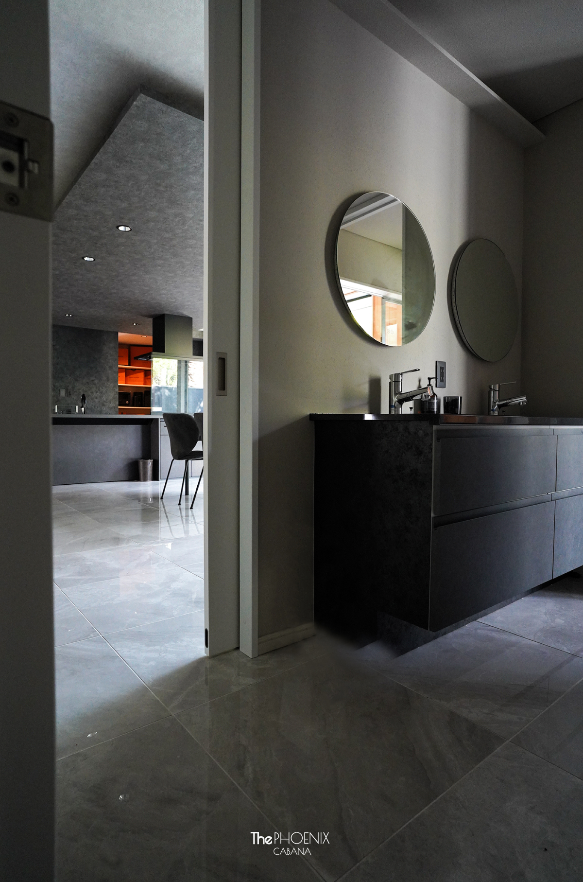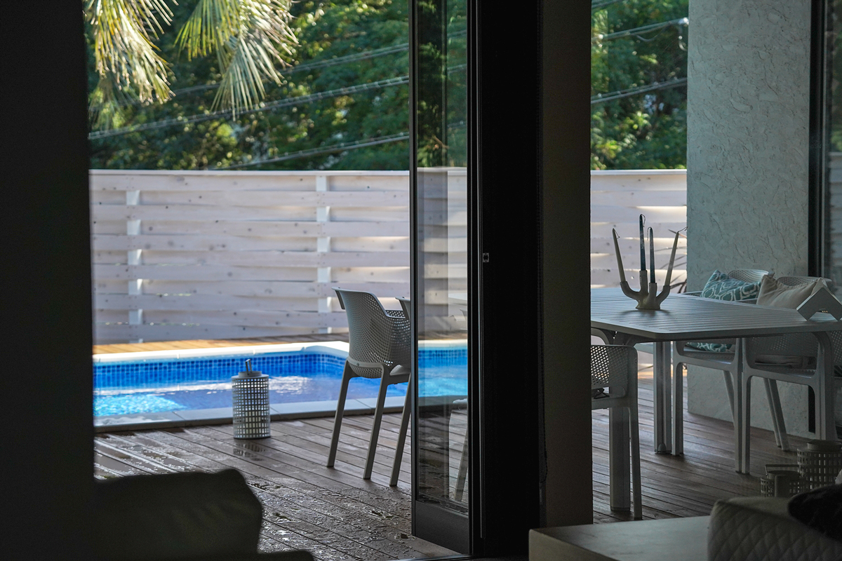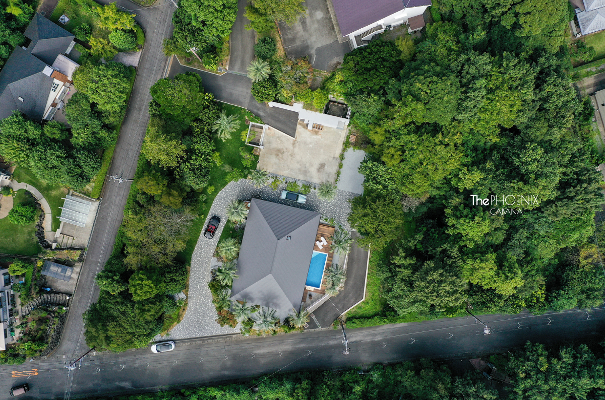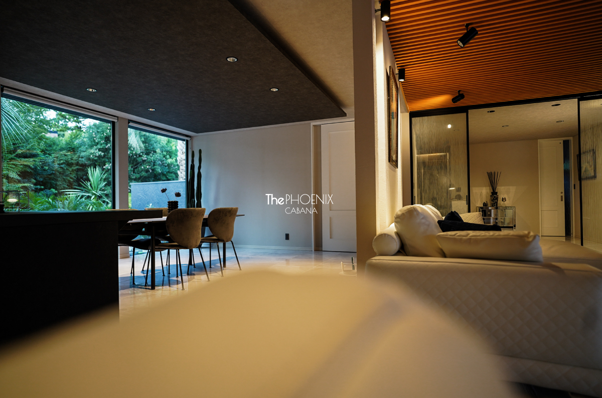 2022年8月に竣工した建物は木造平家の優雅な造りだ。エクステリアはダークカラーでまとめられ庭内の巨木の影と同化する。建物自体を主張させず周囲の自然に紛れるように在るところに美意識を感じる。インテリはホワイトとアースカラーを基調としたモダンな仕上がりで落ち着きがある。また、随所に配されたマーブルストーンの質感も良い、木々の緑や陽光が反射してモダンな雰囲気の中に瑞々しさが加わりプールのキラメキと相まって実に気持ち良い。キッチンやバスルームのファシリティも洗練されたアイテムがチョイスされイギリス車のインテリアのような上質を感じる。