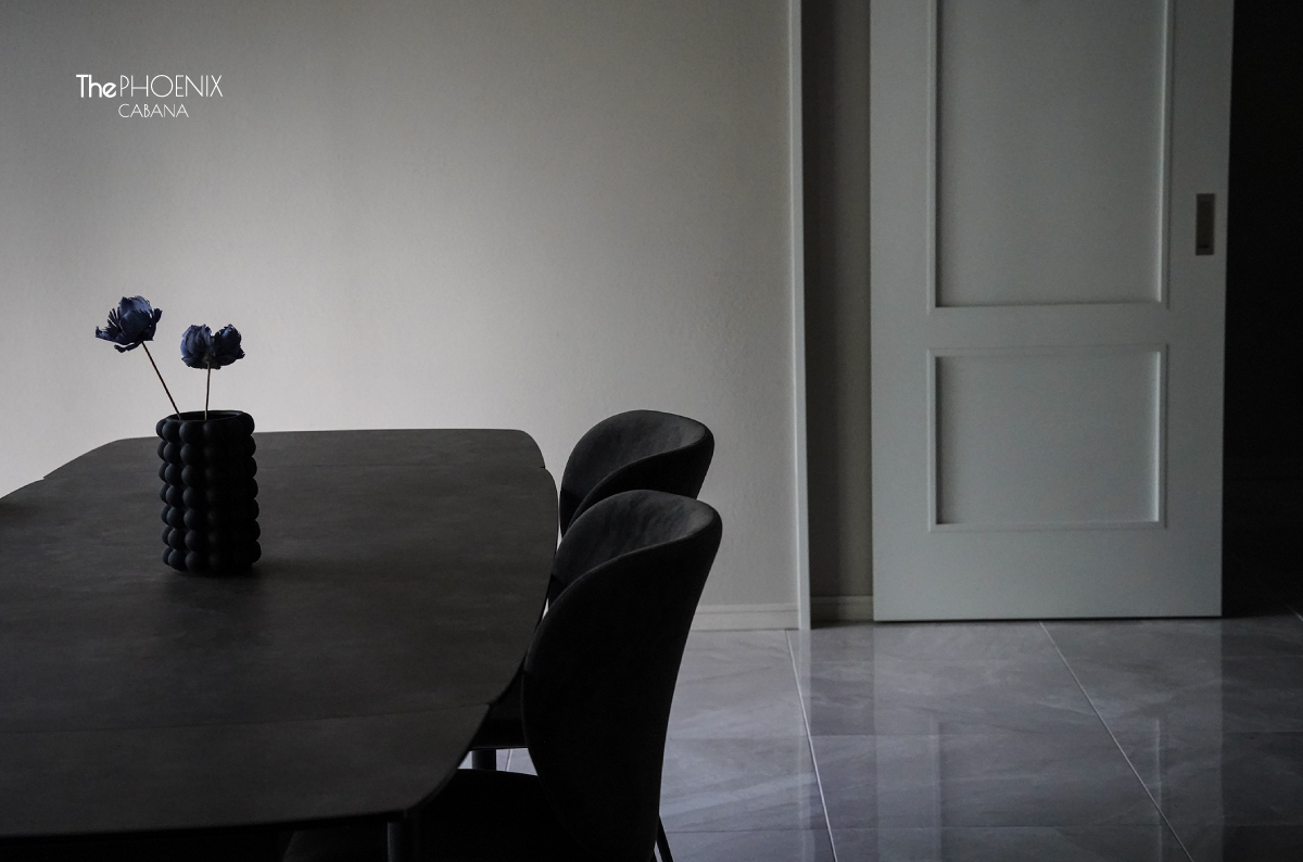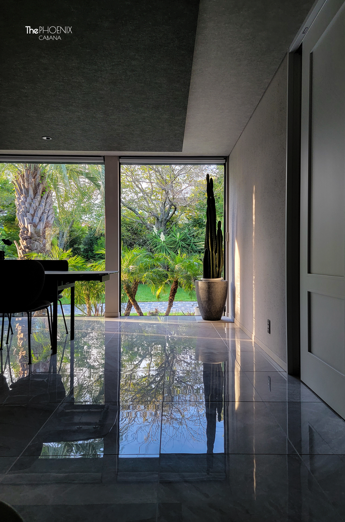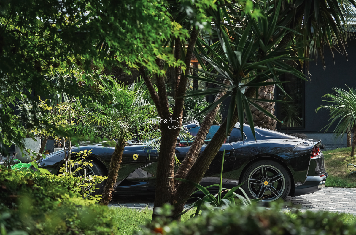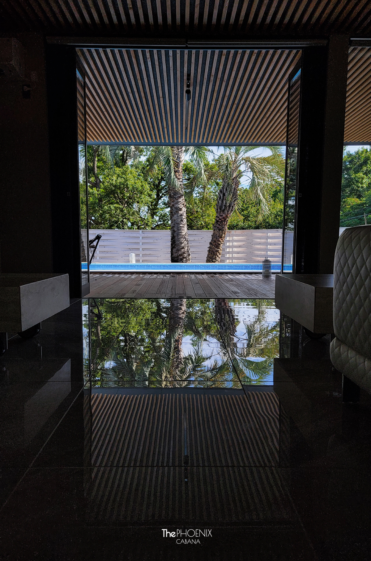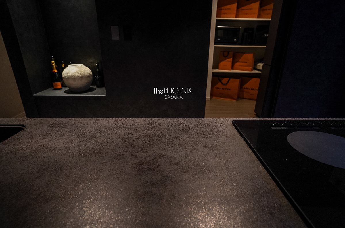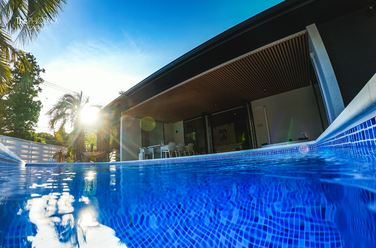 2022年8月に竣工した建物は木造平家の優雅な造りだ。エクステリアはダークカラーでまとめられ庭内の巨木の影と同化する。建物自体を主張させず周囲の自然に紛れるように在るところに美意識を感じる。インテリはホワイトとアースカラーを基調としたモダンな仕上がりで落ち着きがある。また、随所に配されたマーブルストーンの質感も良い、木々の緑や陽光が反射してモダンな雰囲気の中に瑞々しさが加わりプールのキラメキと相まって実に気持ち良い。キッチンやバスルームのファシリティも洗練されたアイテムがチョイスされイギリス車のインテリアのような上質を感じる。