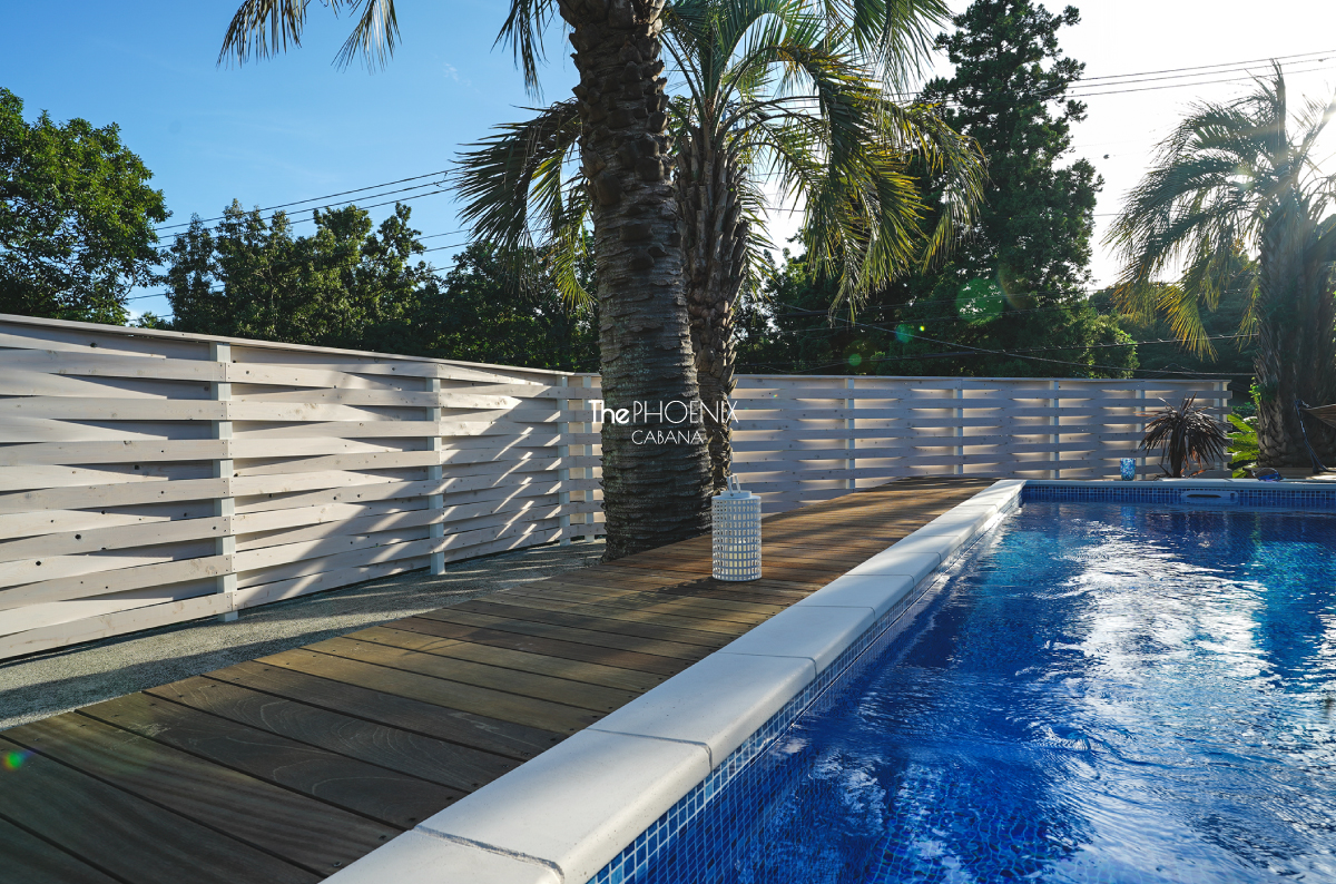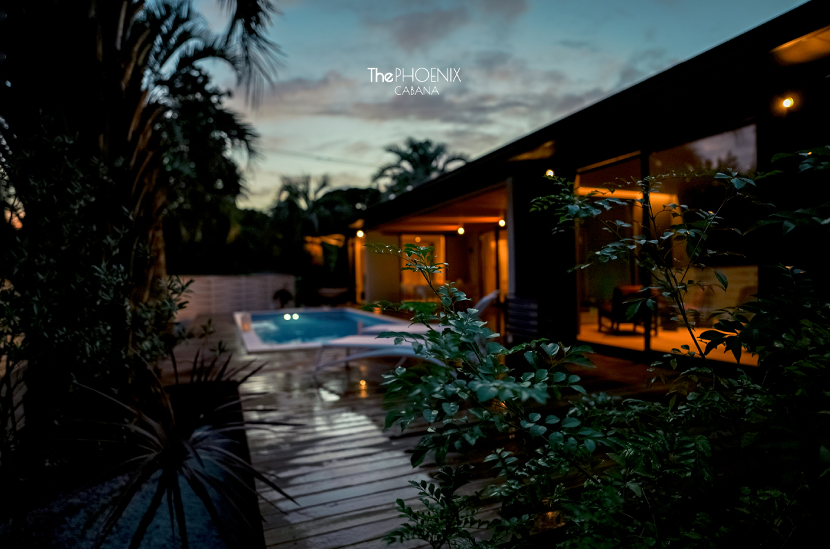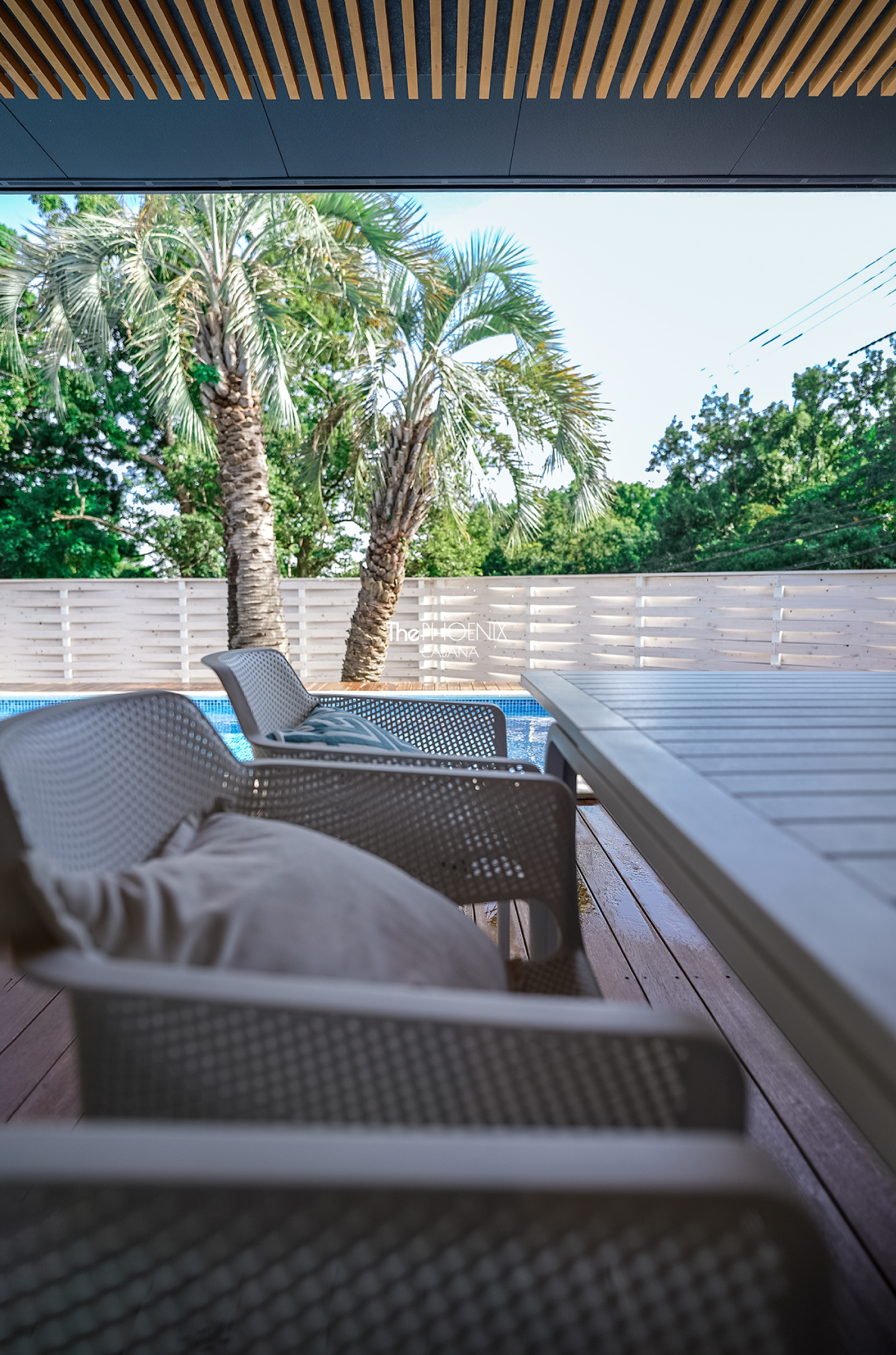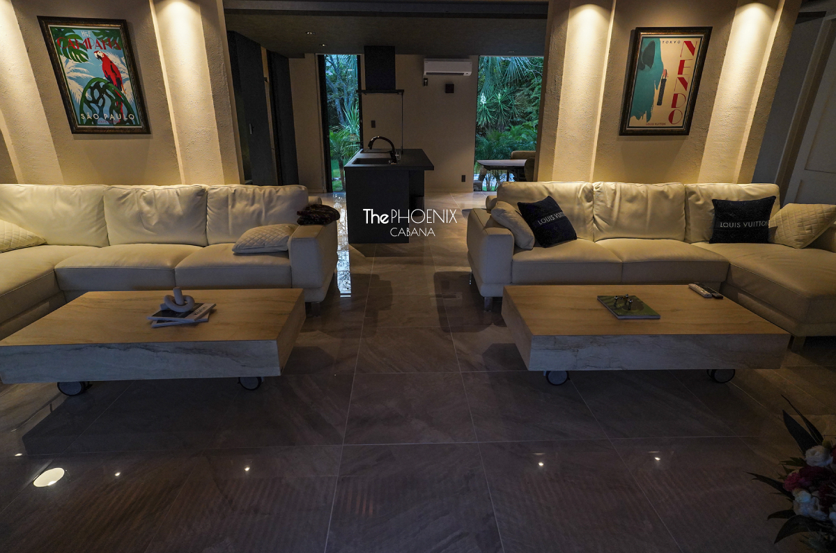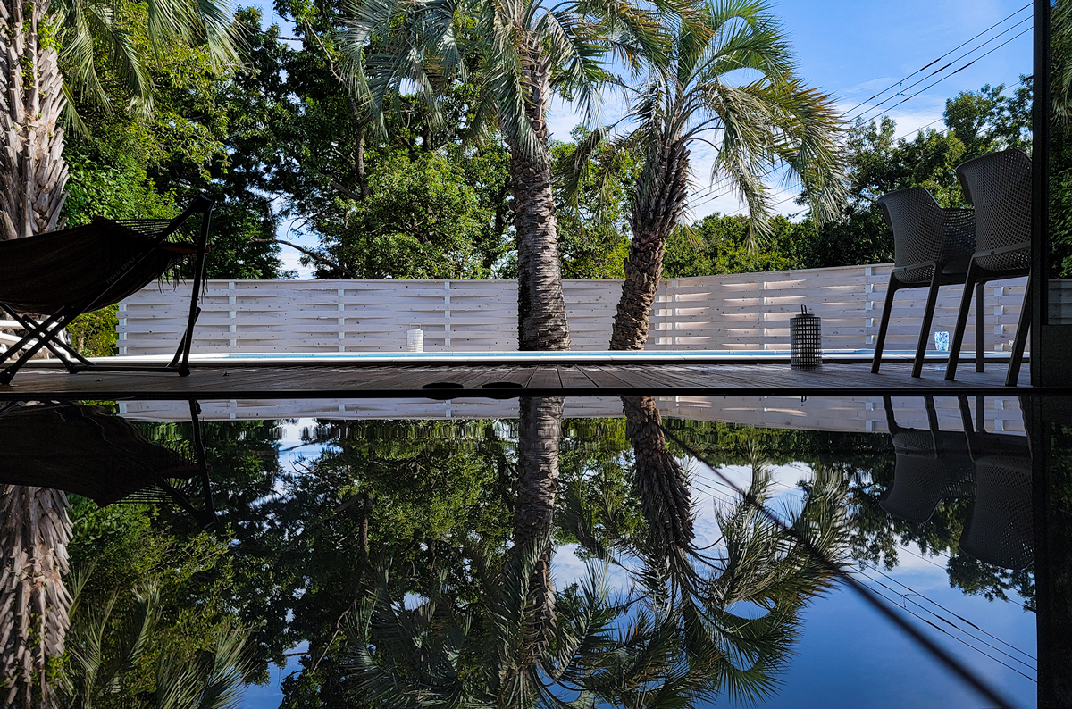 2022年8月に竣工した建物は木造平家の優雅な造りだ。エクステリアはダークカラーでまとめられ庭内の巨木の影と同化する。建物自体を主張させず周囲の自然に紛れるように在るところに美意識を感じる。インテリはホワイトとアースカラーを基調としたモダンな仕上がりで落ち着きがある。また、随所に配されたマーブルストーンの質感も良い、木々の緑や陽光が反射してモダンな雰囲気の中に瑞々しさが加わりプールのキラメキと相まって実に気持ち良い。キッチンやバスルームのファシリティも洗練されたアイテムがチョイスされイギリス車のインテリアのような上質を感じる。