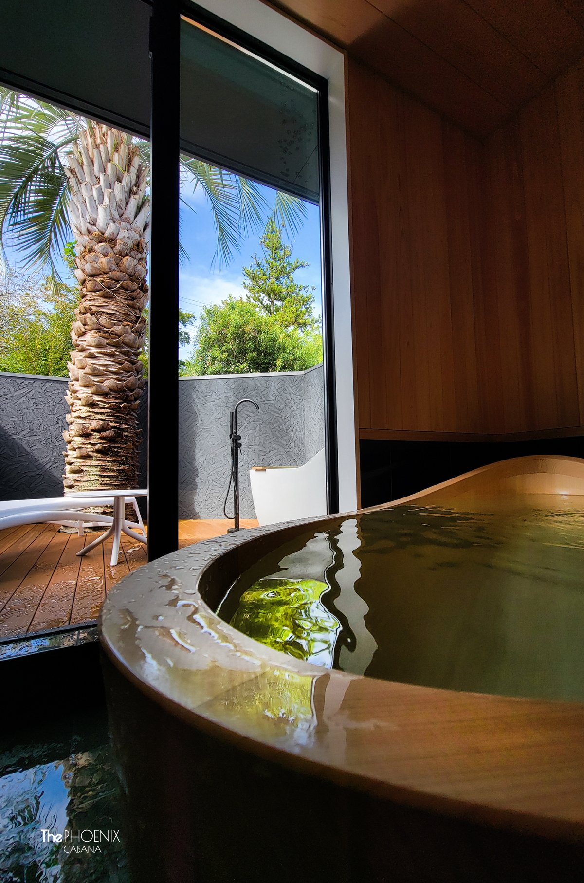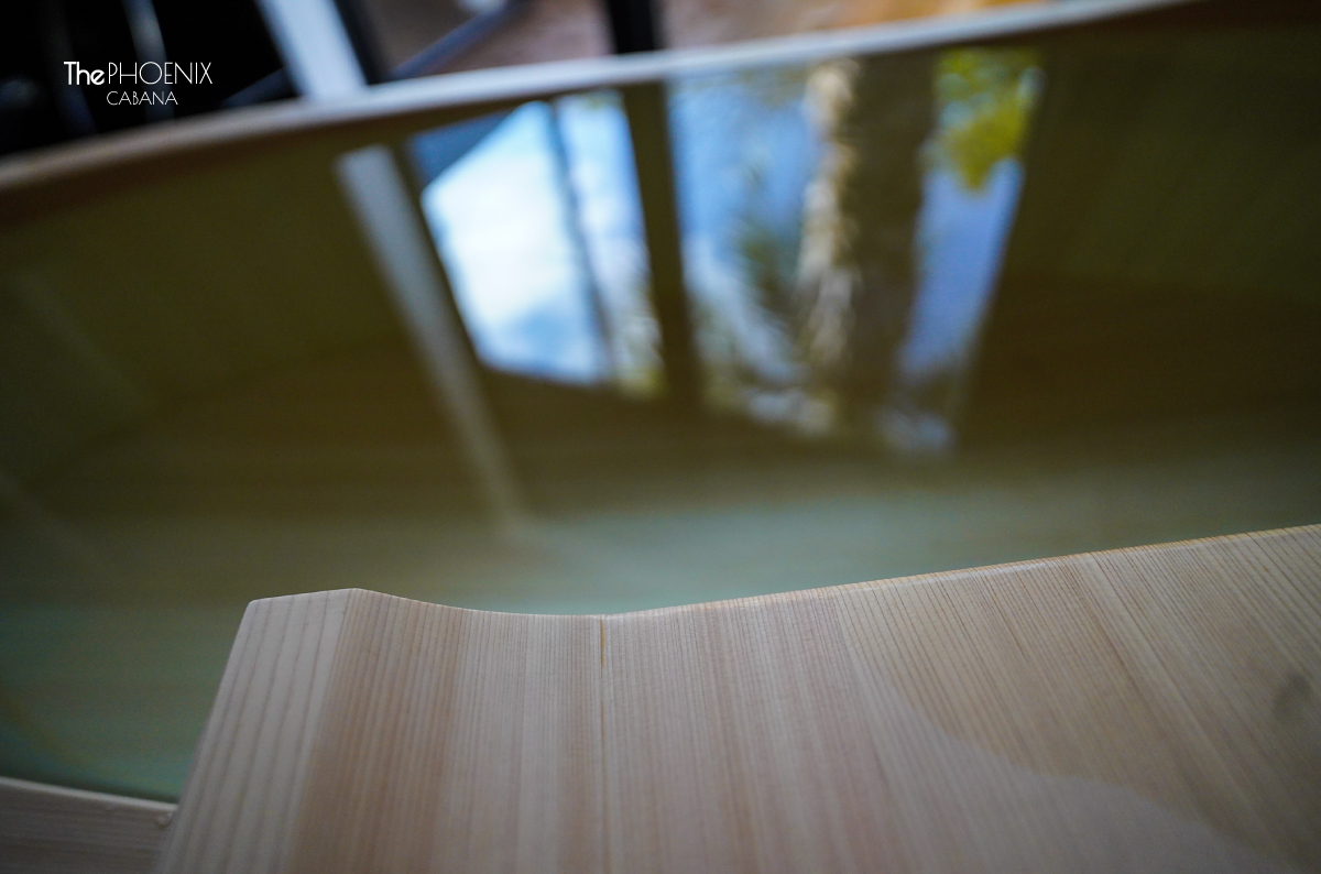 ユニットには鮮度と質の良い温泉が引き込まれる。塩化物泉は肌の角質が落とされることに加え塩分のパック効果で保湿されることから「美肌の湯」としてたたえられている。この湯が舟形の木風呂に注がれ心と身体を解きほぐしてくれる。