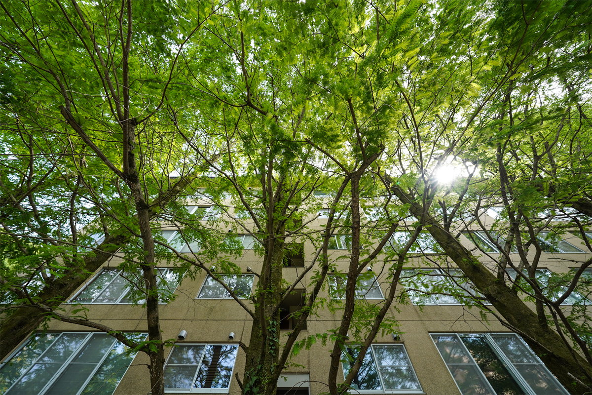 2003年竣工の本件レジデンスは総戸数20戸のコンパクトなコミュニティーとなる。東西に各1ずつエレベーターが配されていることで各住戸がエレベーターを降りるとすぐに玄関があるという共用廊下による横移動がない便利で合理的なレイアウトといえる。すべての住戸は140㎡を超える専有面積と30㎡もあるバルコニーが割り当てられ、レジデンス全体のライフバランスが均一化されている。さらに、各住戸には最大2台分の屋根付きのパーキングが用意されていることも類をみない。この贅沢な配分に収益性よりも空間の在り方を重視する本件レジデンスのコンセプトを感じる。