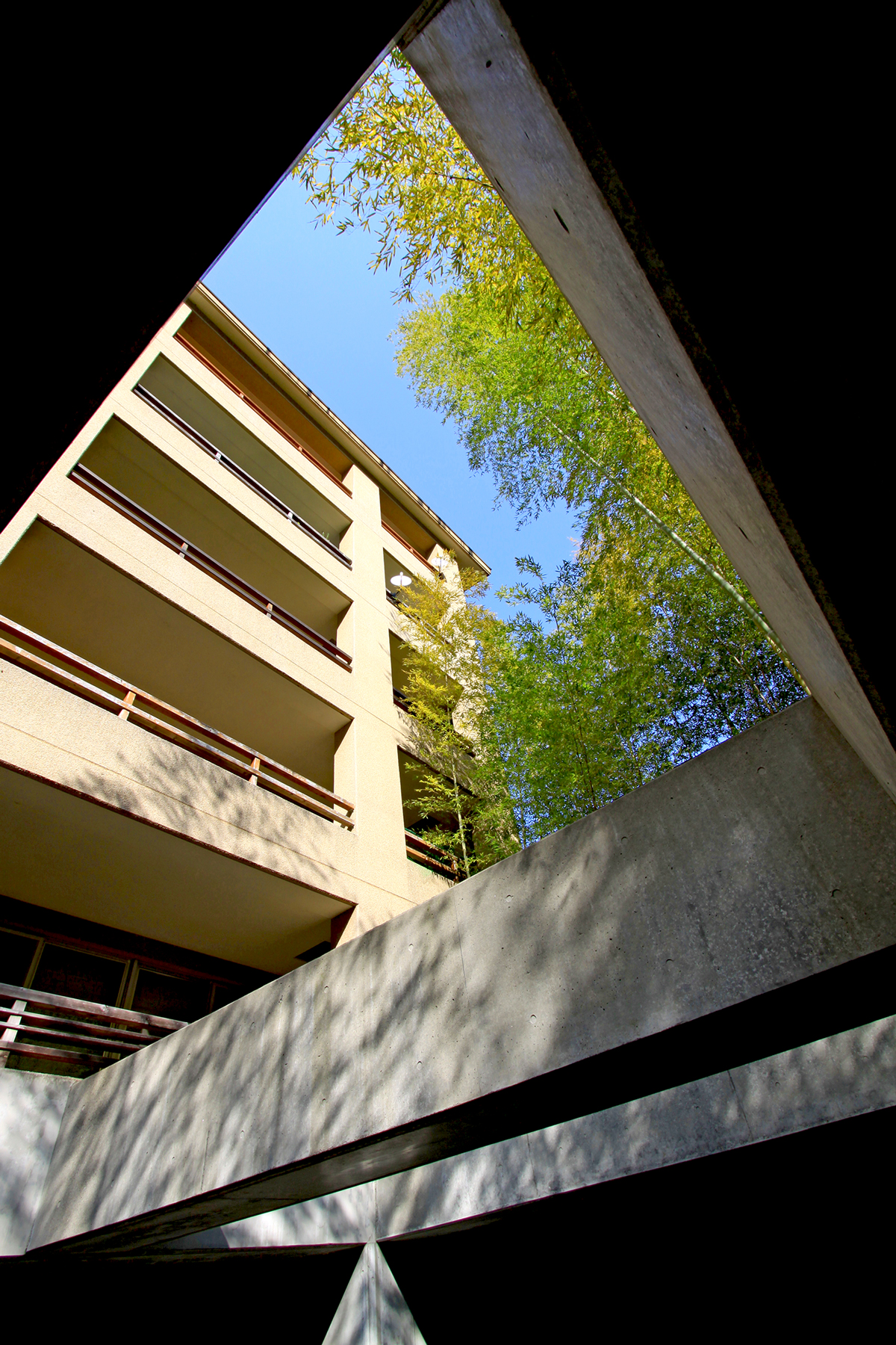 今回紹介する部屋について触れておきたい。ユニットはレジデンス中で一番最下層に位置している。一般的には上階に行くほど人気があることが多いのだが、このレジデンスについては階層ごとそれぞれに魅力がありユーザーによってその好みは分かれる。個人的にはこのレジデンスの中では本件ユニットの所在する階層が一番好みだ。まず、下階に住戸が無いことでのびのびと過ごせることは大きなメリットといえる。合わせて、この階層でしか味わえない眺めのバランスが良さを評価したい。南側の竹林の地面は部屋のフロアーに立って腰高ほどの高さにある、普段、建物の中から目にする地面は足元以下のことがほとんどだが本件はソファに腰かけてちょうど目線の高さに竹林の間に配された地被草、竹の幹の美しさ、竹を下から見上げられる角度が良く、竹林の中を散歩していているかのような情景はじつに気持ち良い。北側の眺めも正面に育つメタセコイヤの枝葉の隙間のバランスが良く、川面を近くに眺められることもすばらしい。窓を開ければその枝葉を手で触れられる近さにあるのもうれしい。次は動線的なことだが、メインエントランスやパーキングスペースからとにかく近いそれぞれから数十歩で部屋に着く距離はメリットの何物でもなくエレベーターを使うことはほぼ無いだろう。また、ベランダに出れば愛車がすぐ近くに眺められる状況もうれしい。ここにもレジデンスでありながら戸建てのような環境のあるこのユニットの魅力を感じる。ネガティブな点を挙げるとすれば日照の弱さにあるが安定した優しい自然光が入るぐらいの日照がこのユニットに似合うように思える。