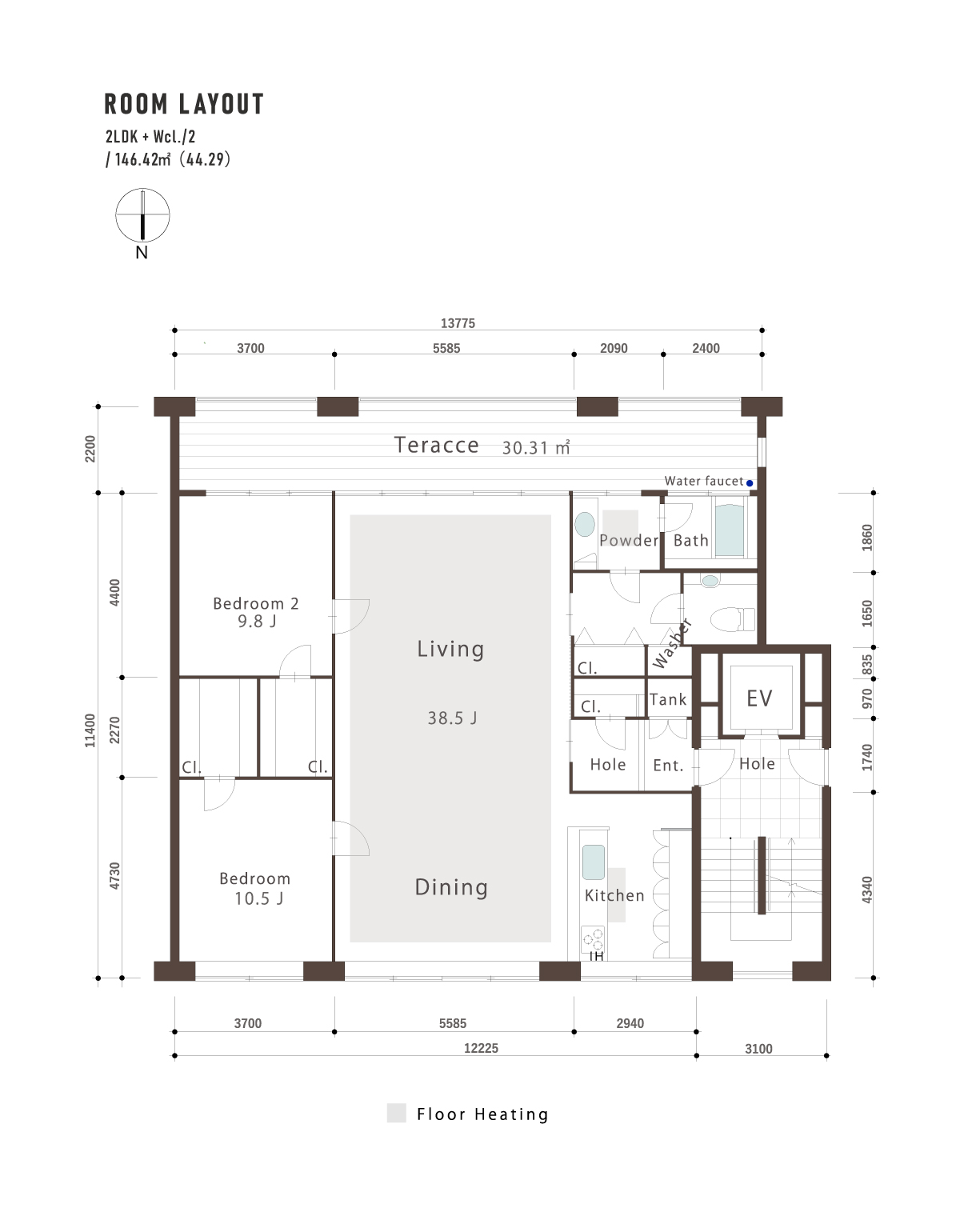 全戸に共通しているルームレイアウトは40帖大のリビングが部屋の中心にあり南北に大きな窓を配した風抜けの良い構成となる。また、リビングを軸に東西に居室と水回りが分けられ、極めてシンプルなレイアウトといえる。この空間はただ広くすれば良いということではなく、「すこやかな空間とは自由のある空間」すなわち、飾り気のない大きな四角い空間は住むひとの自由な演出を可能にするという設計者の明確な意図によるものだ。実際、このレジデンスで過去に10件近く部屋を拝見したが、それぞれの部屋は異なる家具のレイアウトや使い方がなされどの空間も個性的でありながら共通して居心地の良さと爽快さを感じた。
