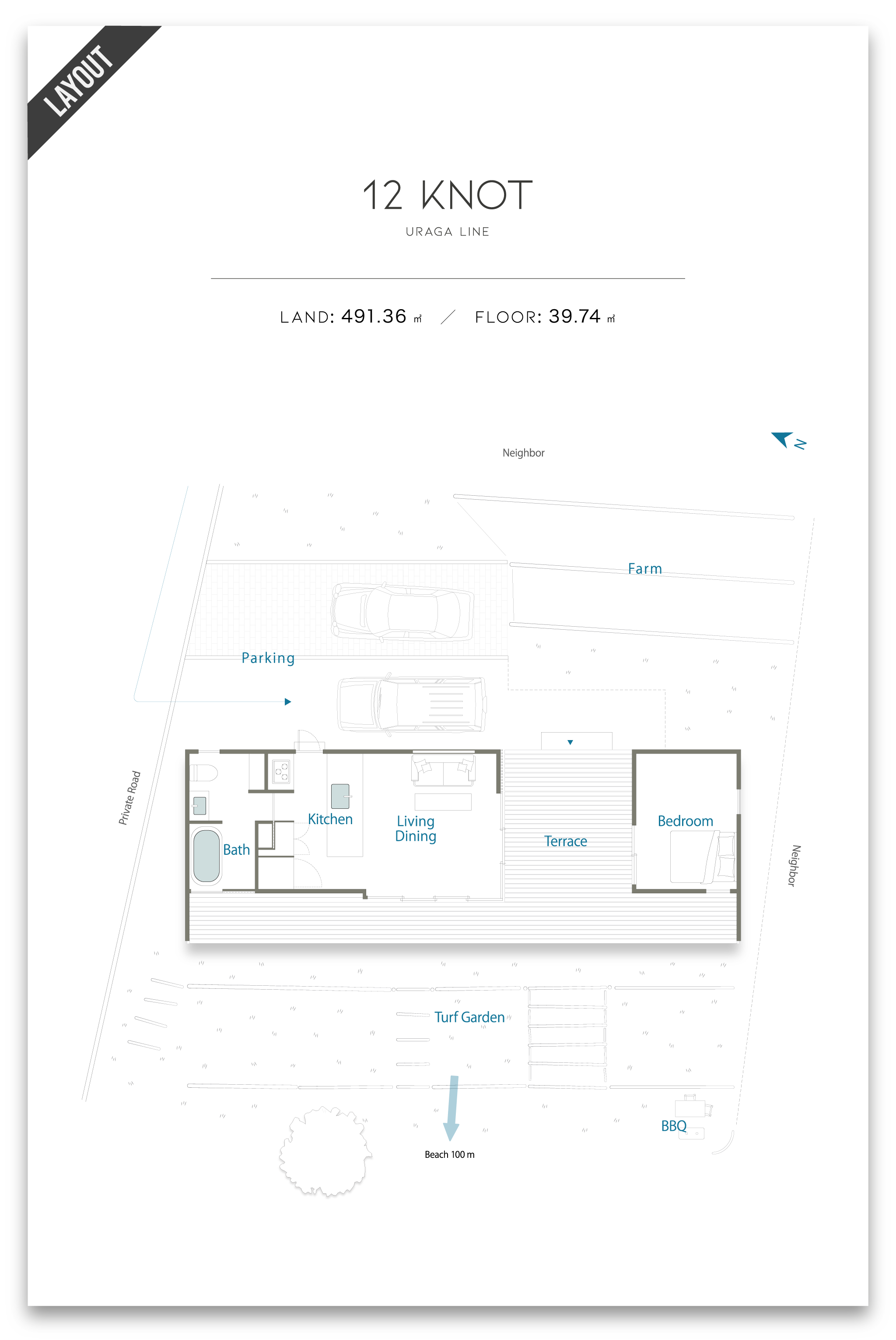 本件ユニットはオーシャンロードから少し入ったビーチに面した場所にある。周囲には点々とヴィラがあるだけで、打ち寄せる波音がクリアーに聴こえる、のどかでプライベート感のある場所でありながら、君津の町へのアクセスも良く、贅沢をいわなければ暮らしに必要なものは大抵そろう、恵まれたロケーションとなる。また、自然をフィールドにした遊びの環境が揃っていることも魅力といえリトリートを構えるにはうってつけの場所といえる。