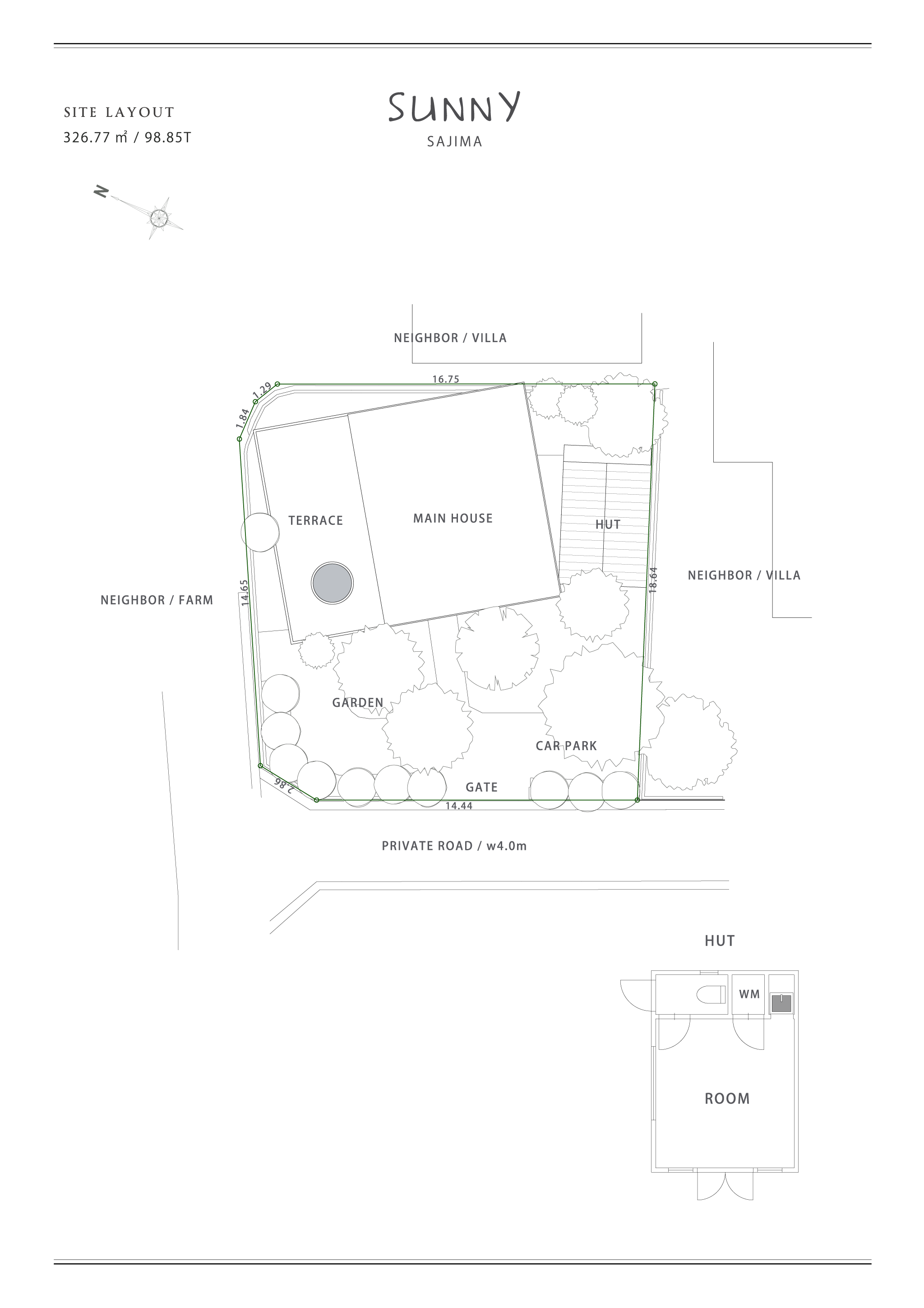 1970年に新築されたこの建物は、数回のリモデルを経て、現在の姿に至っている。その間仕切りを最小限に抑えたデザインと高い天井により開放感が得られる。この建物は、現在では1日一組限定のバケーションレンタルとして活用されている。また、2階のベッドルームは広々としたテラスに直結し大空と海の広がりを感じながら、吹き抜ける風をダイレクトに楽しむことができる。海外のヴィラに滞在しているかのような錯覚を覚える。さらに、ガーデンの一角には、シャビ―な雰囲気の小屋を改装したゲストルームがあり、コテージ的な雰囲気が非日常感を一層高めている。インテリアは、白を基調とした明るく清潔感のあるデザインで、マリンタウンにふさわしい爽やかな雰囲気を演出している。