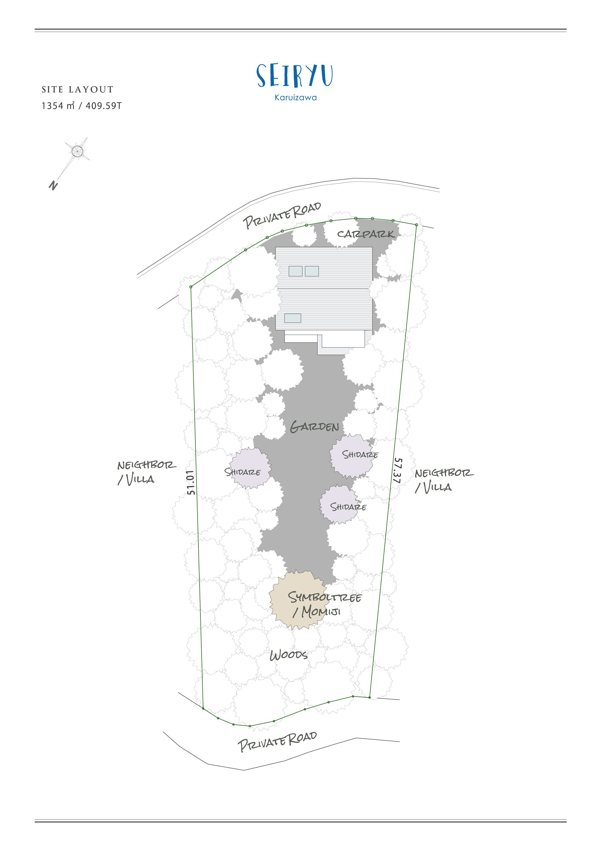 本件ユニットは軽井沢町の南端に位置するコミュニティ「丸紅南軽井沢」の一角にある。周辺一帯は遠くにある浅間山に向って北に傾斜する標高1000mの山間となり美しい木立の上下に山荘が点在し質の高いマウンテンリゾートの雰囲気が漂う、このヒルサイドの地形により野鳥のさえずりや風の音が周囲にこだまし森の営みをダイレクトに感じられる。加えて町内の平野部より涼しく避暑地としての気候を味わえるのもありがたい。また、町外からのアクセスも良く、車なら「碓井軽井沢I.C」から交通渋滞に合わずたどり着けることや、新幹線利用でも「軽井沢」駅から約7.6kmという距離もわるくない。