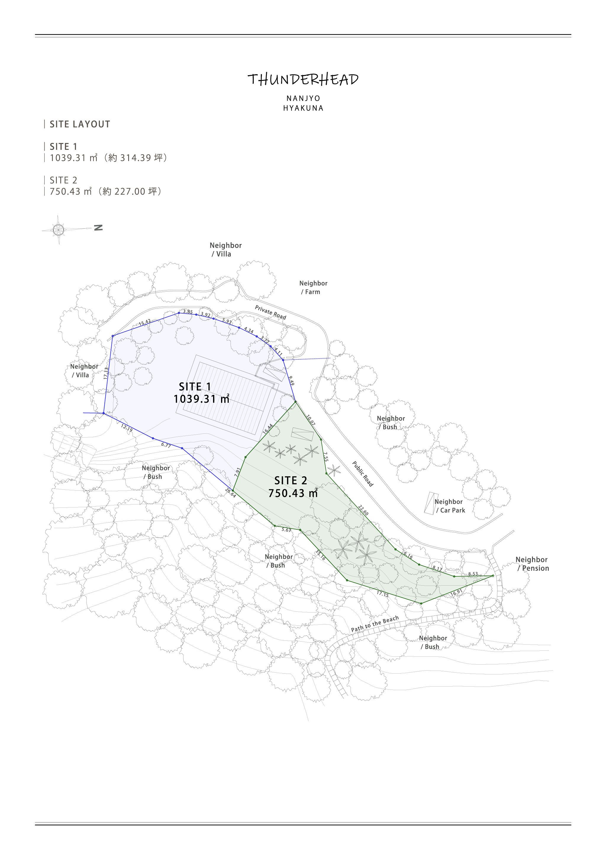 本ユニットは、百名ビーチを足元に持つ急な斜面の先端に位置し、遮るもののないパノラマビューを楽しめる贅沢な立地。さらに、敷地脇の小道を使えば、徒歩でビーチへとアクセス可能。周囲にはペンションやヴィラ、ファームが点在し、前面道路が行き止まりとなるため、静かで落ち着いた環境が保たれている。