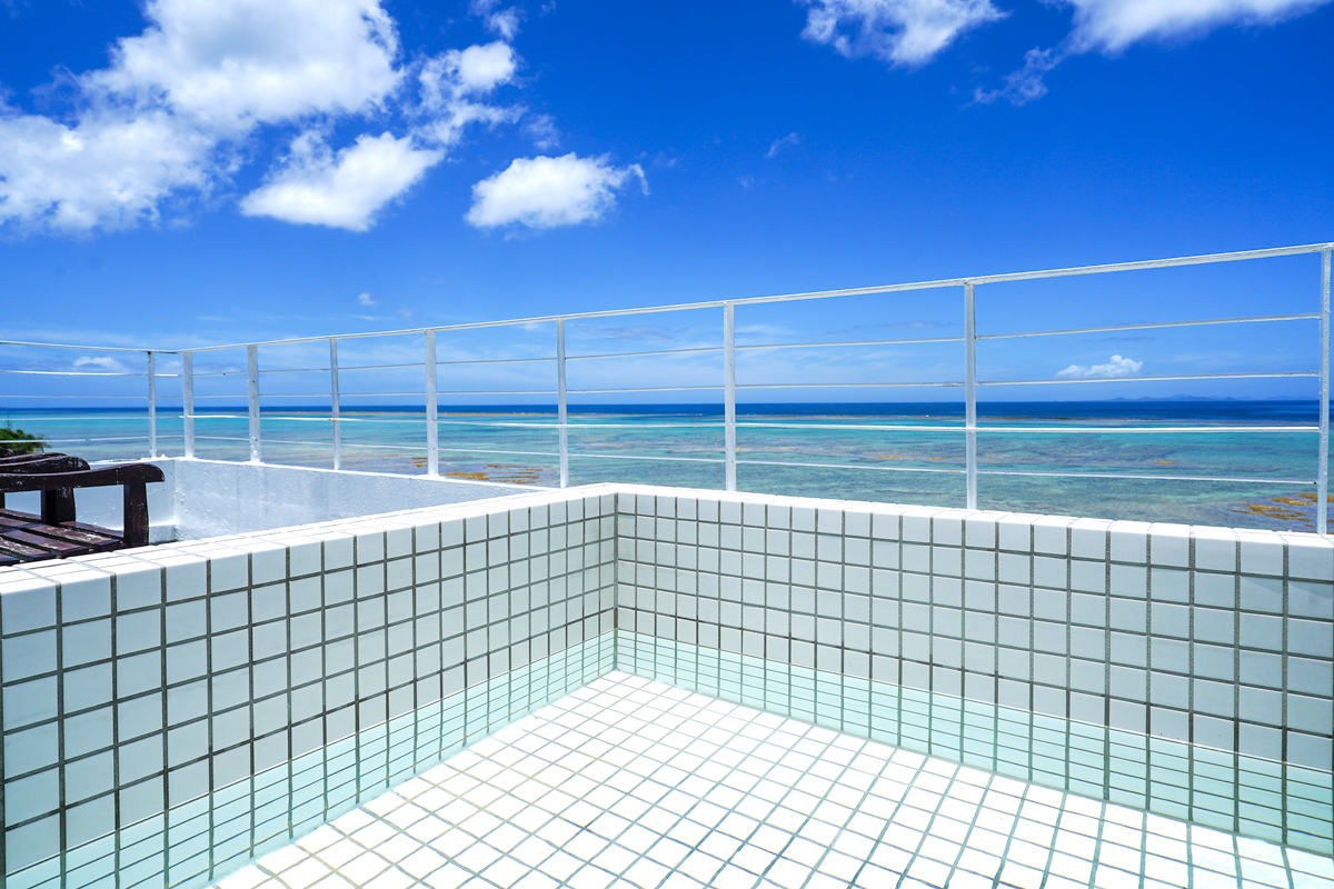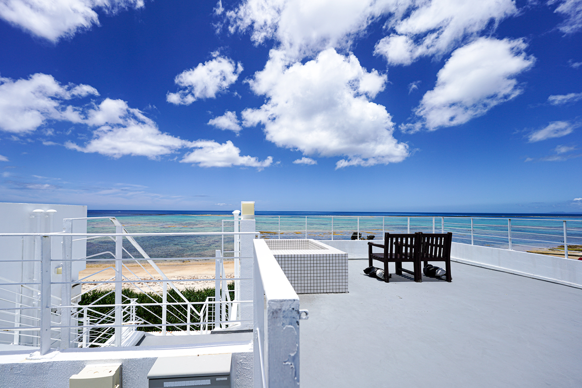 沖縄の厳しい気象に耐える鉄筋コンクリート造の建物の客室は全4室、各27㎡のゆったりとした空間。全室が海を正面に据え、テラスとアウトドアバス、ビューバスを備える仕様である。施設にはさらにショップスペース(厨房設備付き)、ルーフトップテラス、ランドリールーム、プライベートルームを併設し、多様な運用に対応できる設計となっている。