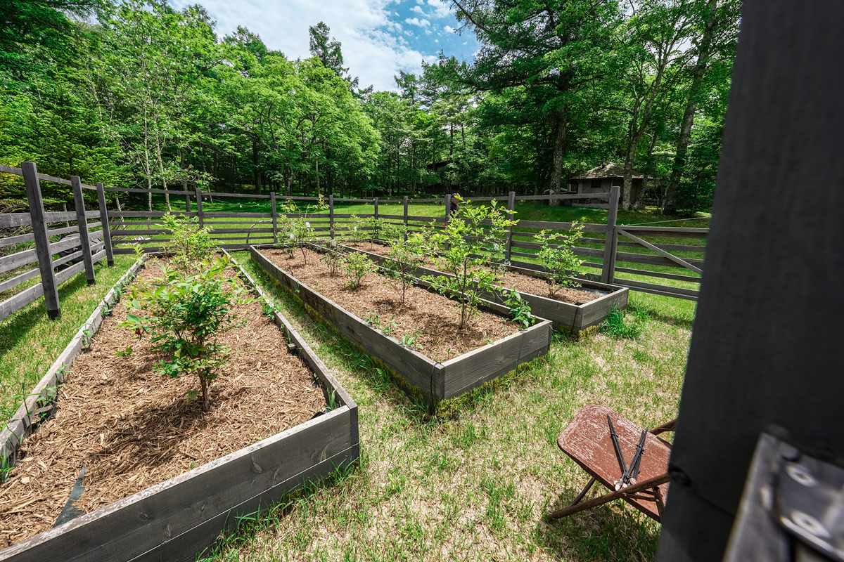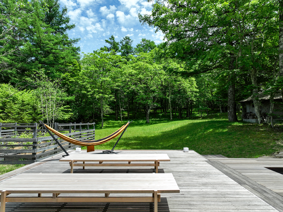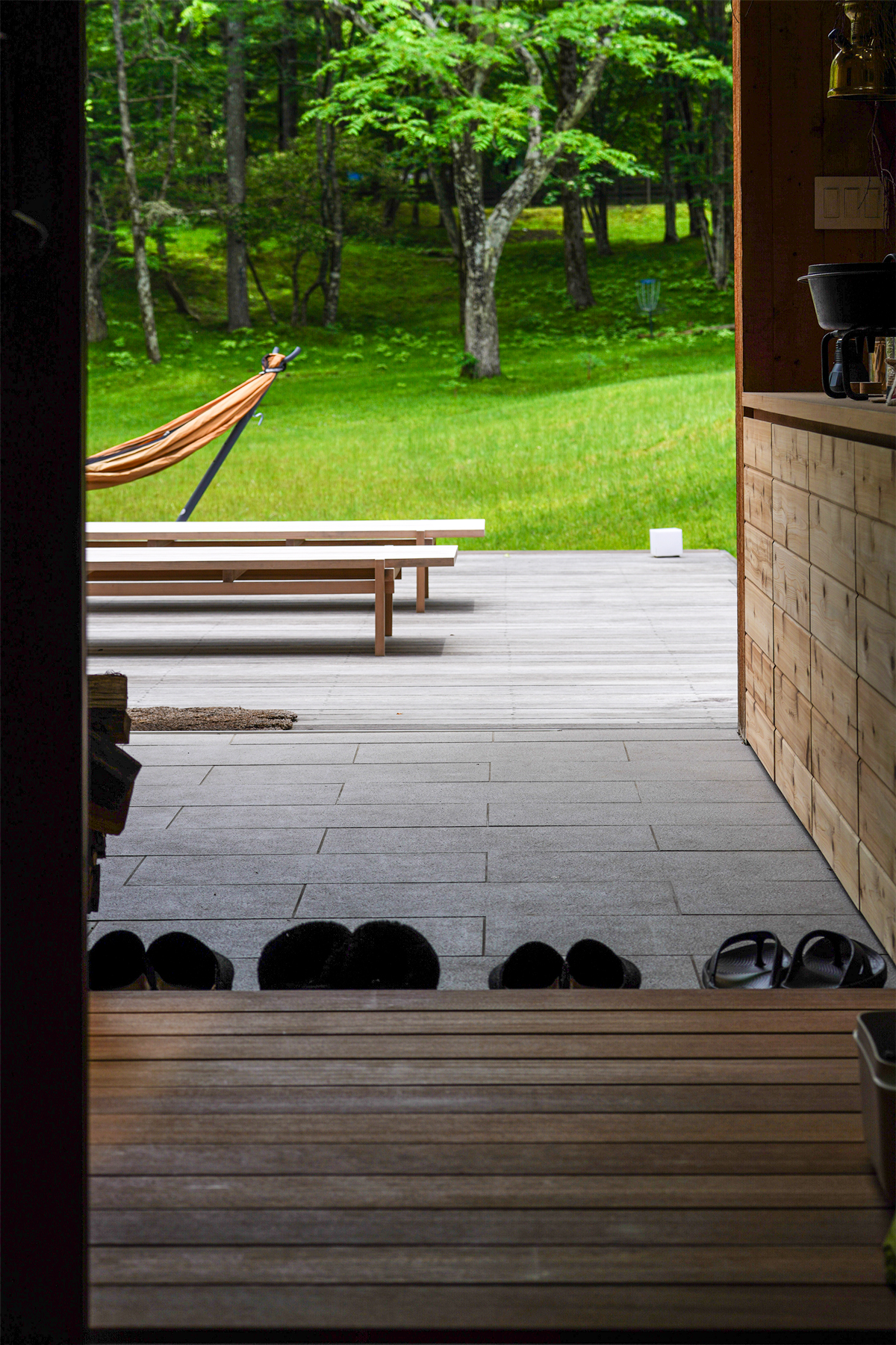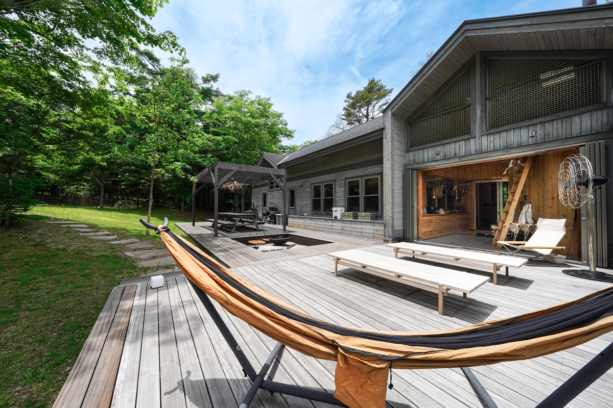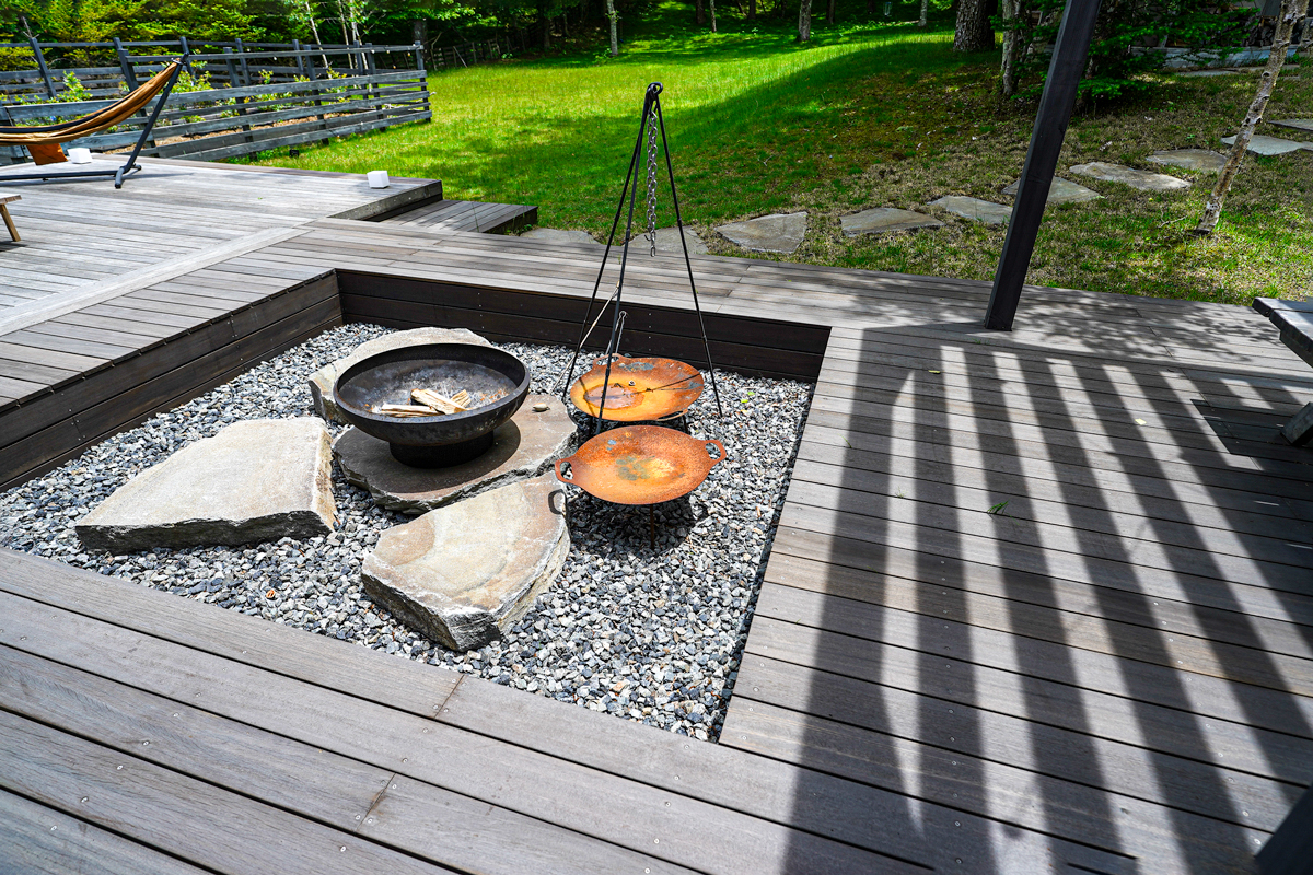 本物件の最大の魅力のひとつは、約100mの奥行きを誇り、4,700㎡超に広がる圧倒的なガーデンである。富士山麓に育つ自然林の中、芝生に木漏れ日が揺れ、日常的に二ホンジカが姿を見せるような、まさに自然と共生する環境が整っている。敷地は南東に緩やかに傾斜し、適度なアンジュレーションが生む立体的な景観も美しい。家の正面にはシンボルツリーが育ち、冬の雪景色にはライトアップやデコレーションで幻想的な演出を楽しめるだろう。その足元にはサウナハットとアルミの水風呂が用意され、雪の日にはサウナから出てすぐにクールダウンが可能だ。また、建物幅いっぱいに設けられたウッドテラスにはアウトドアダイニングや焚火場が備えられ、自然の中で過ごす豊かな時間を堪能できる。