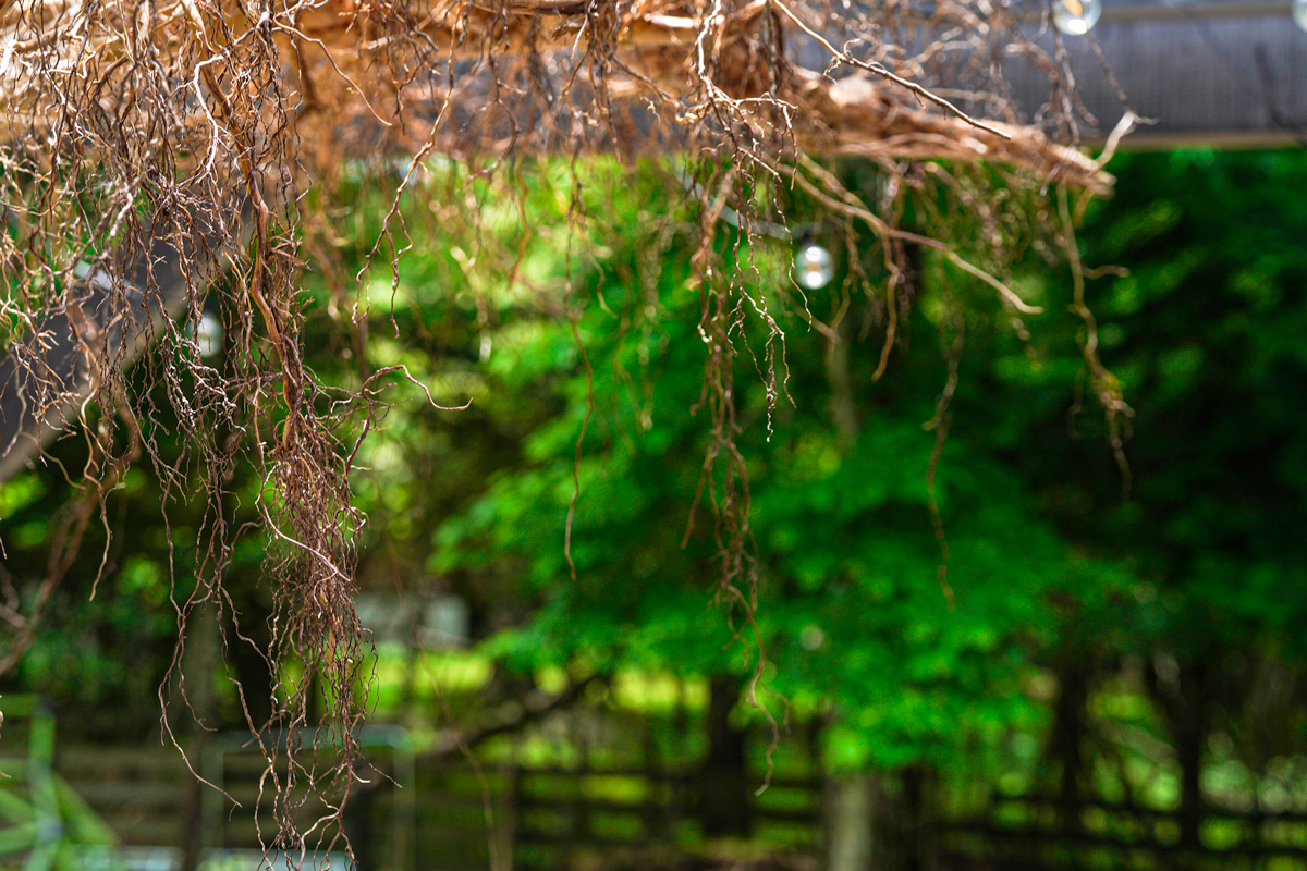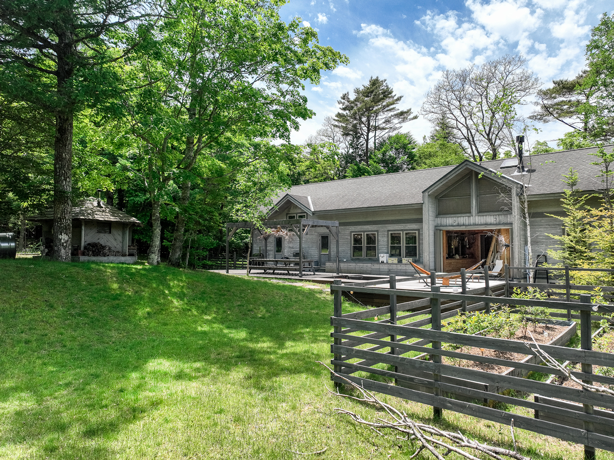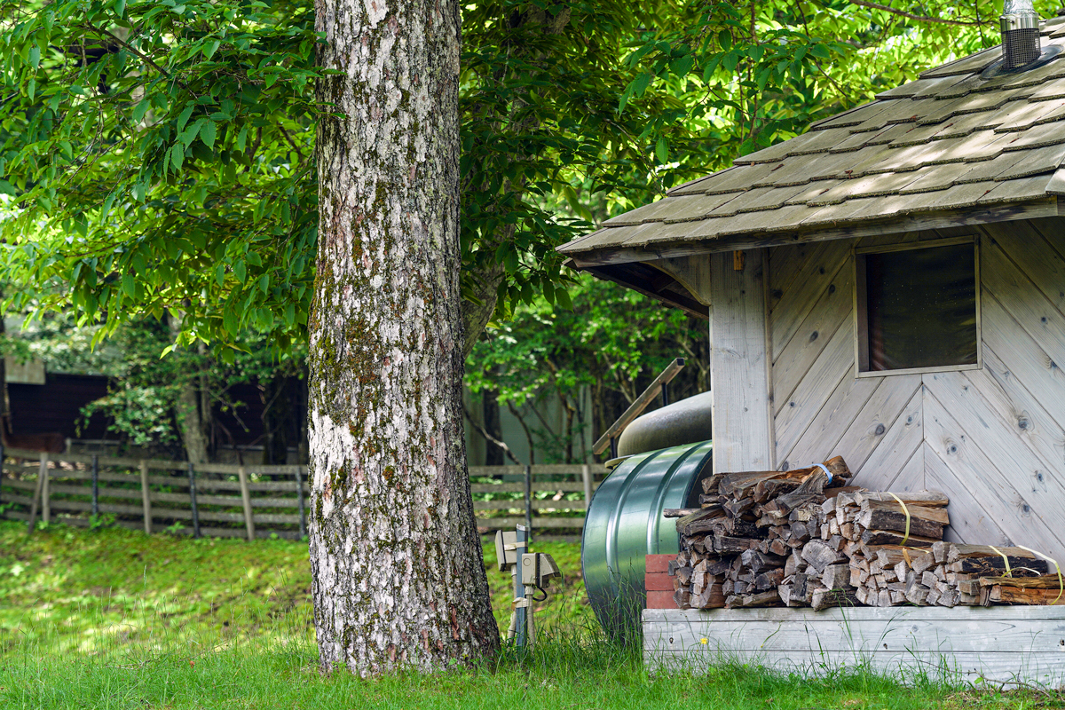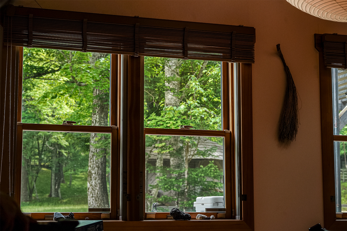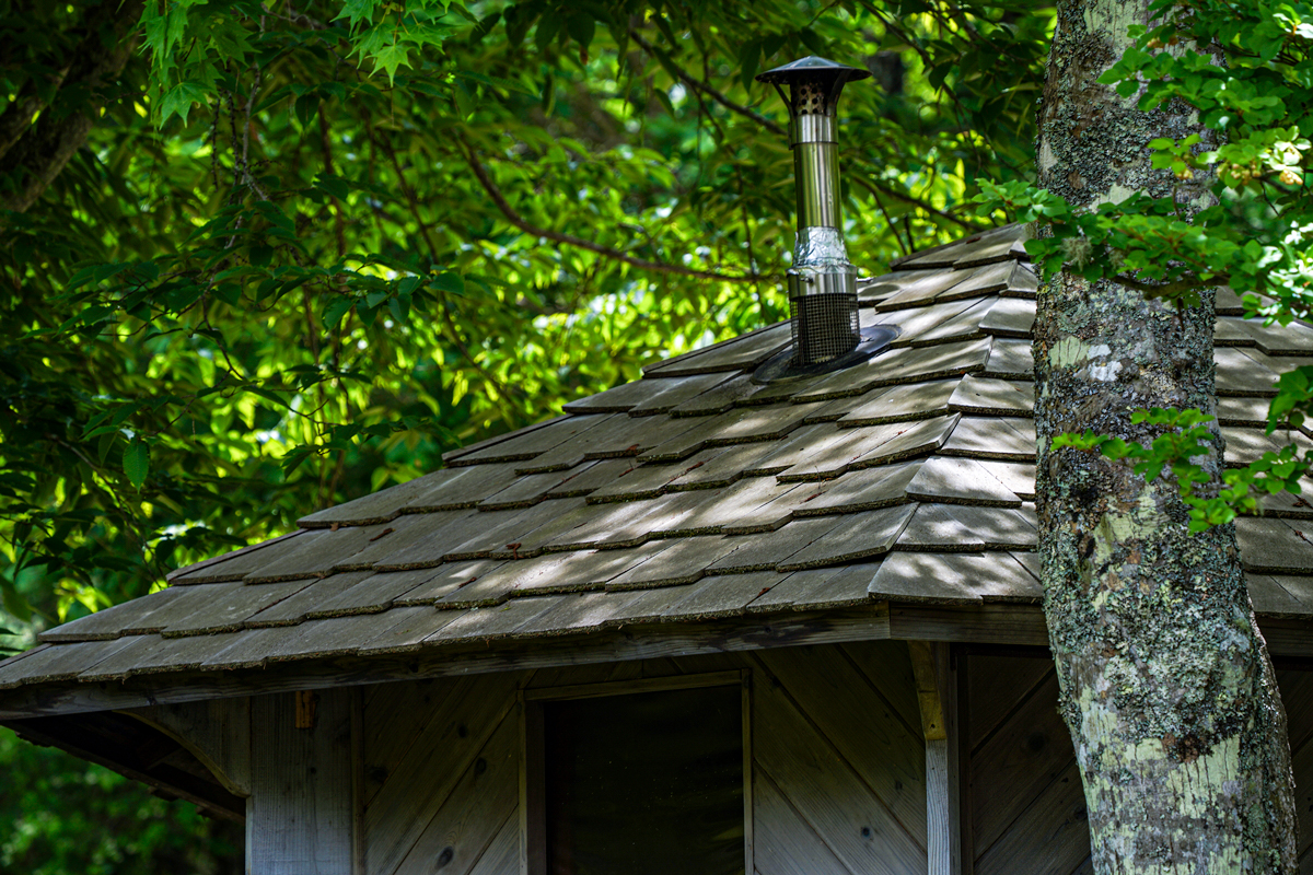 本物件の最大の魅力のひとつは、約100mの奥行きを誇り、4,700㎡超に広がる圧倒的なガーデンである。富士山麓に育つ自然林の中、芝生に木漏れ日が揺れ、日常的に二ホンジカが姿を見せるような、まさに自然と共生する環境が整っている。敷地は南東に緩やかに傾斜し、適度なアンジュレーションが生む立体的な景観も美しい。家の正面にはシンボルツリーが育ち、冬の雪景色にはライトアップやデコレーションで幻想的な演出を楽しめるだろう。その足元にはサウナハットとアルミの水風呂が用意され、雪の日にはサウナから出てすぐにクールダウンが可能だ。また、建物幅いっぱいに設けられたウッドテラスにはアウトドアダイニングや焚火場が備えられ、自然の中で過ごす豊かな時間を堪能できる。