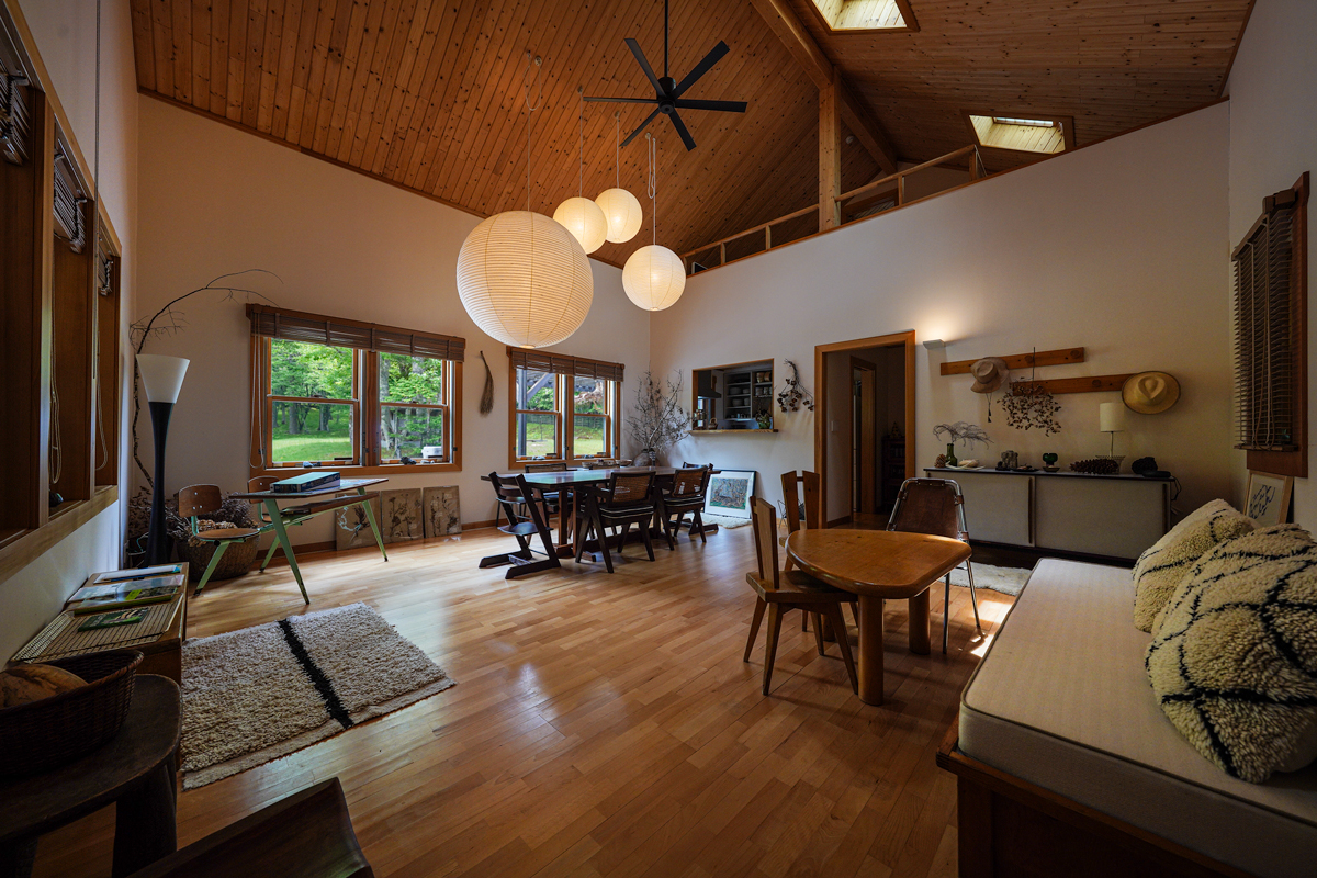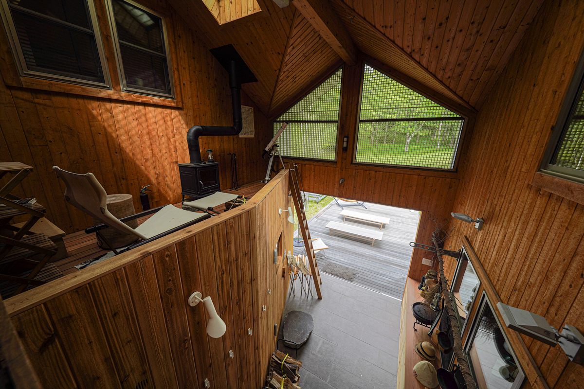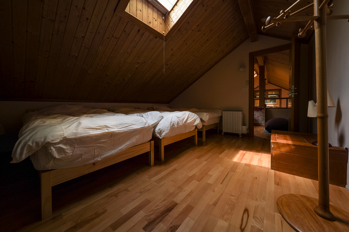 2階には吹き抜けを挟んで二つのベッドルームが配置され、勾配天井とトップライトから差し込む朝陽が格別の目覚めを与えてくれるだろう。内装はラスティックな板張りとオフホワイトの塗装が組み合わされ、重厚感とナチュラルさが共存した落ち着きのある空間に仕上がっている。