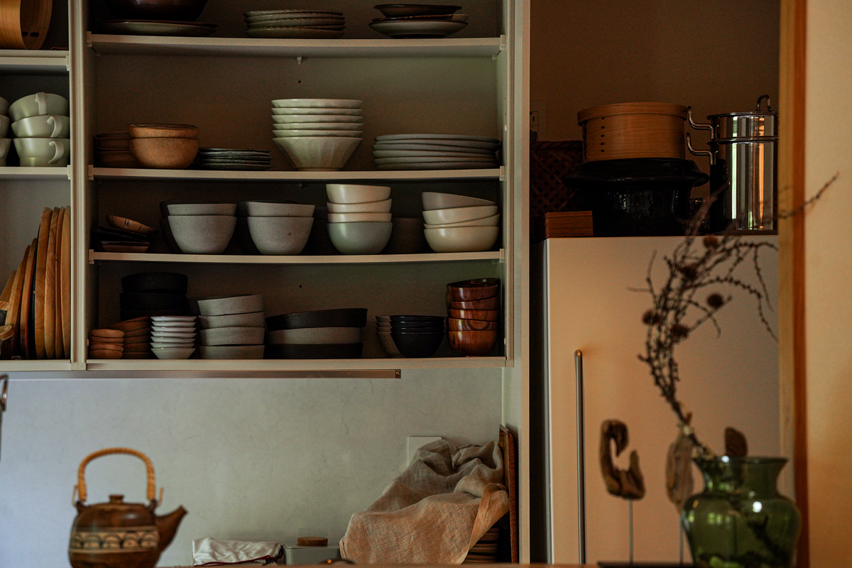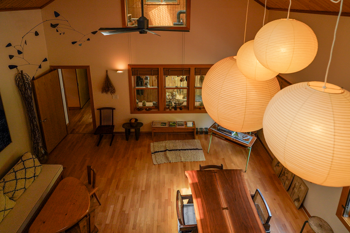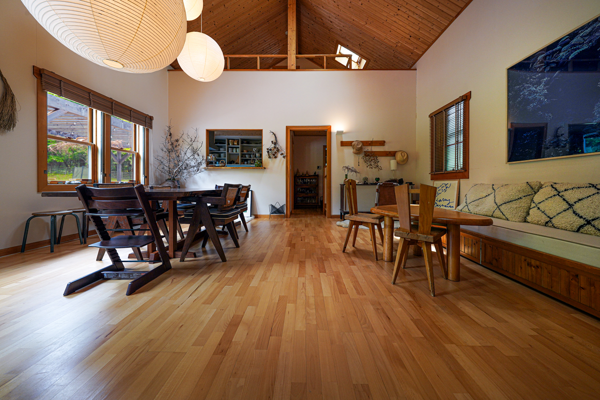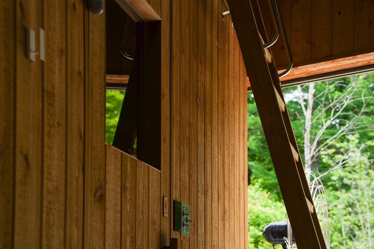 2階には吹き抜けを挟んで二つのベッドルームが配置され、勾配天井とトップライトから差し込む朝陽が格別の目覚めを与えてくれるだろう。内装はラスティックな板張りとオフホワイトの塗装が組み合わされ、重厚感とナチュラルさが共存した落ち着きのある空間に仕上がっている。