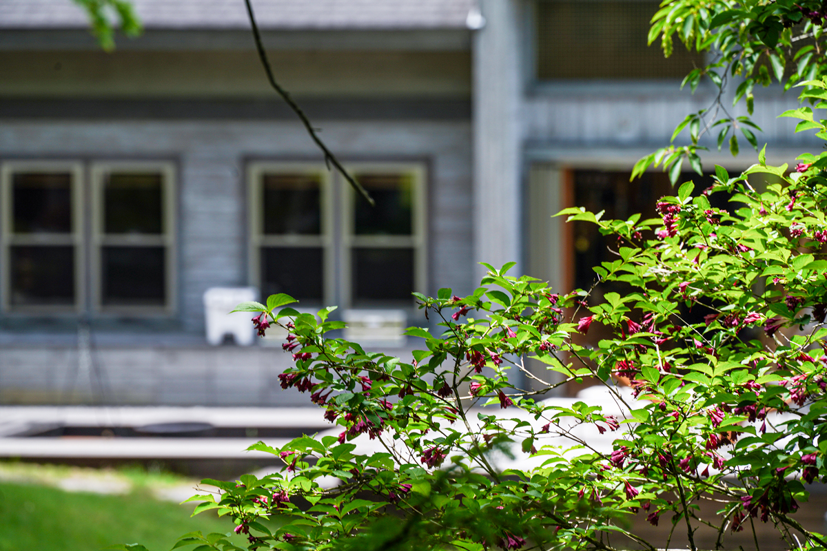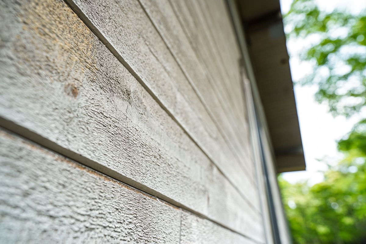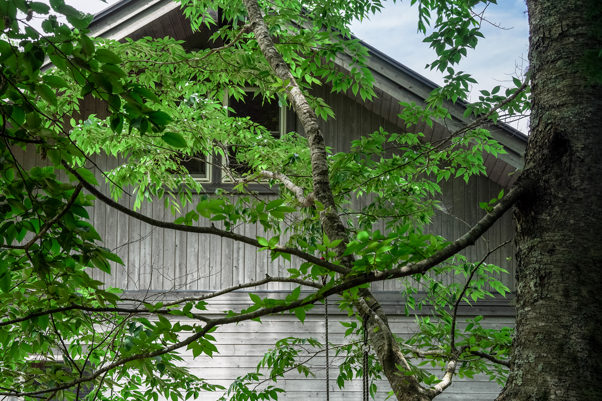 外壁はシックなブルーグレーにペイントされた板張りで、周囲の森に溶け込むようにデザインされている。ウッドケーシングの窓枠がマウンテンヴィラとしての存在感を際立たせる。