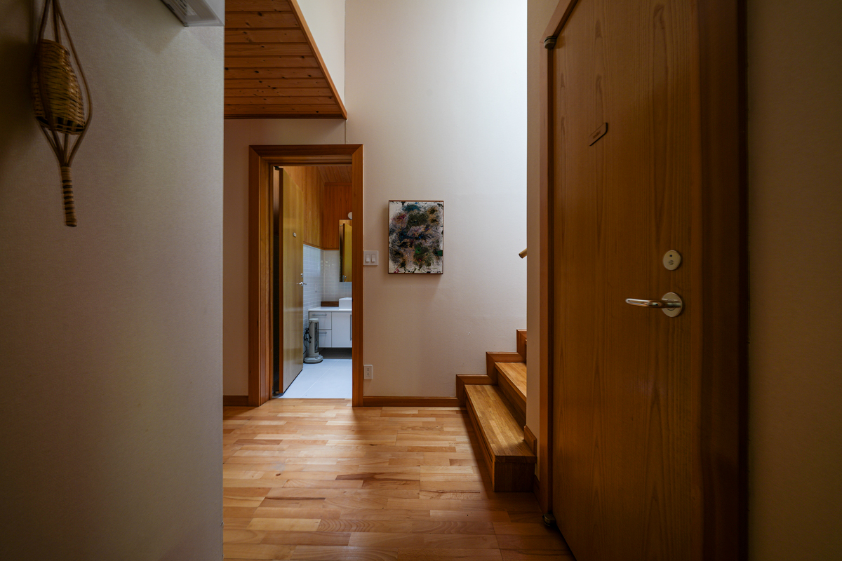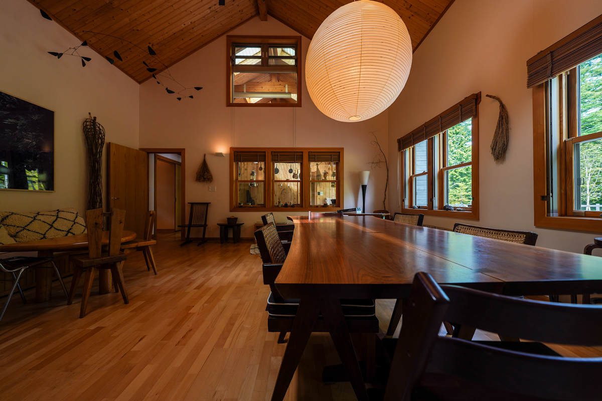 玄関ポーチは屋根付きで、雨に濡れることなく荷物の積み下ろしや遊び道具の準備ができる。1階は大きなLDKを中心に、二つのベッドルームとバスルームを両サイドに配し、平屋のように機能する動線が心地よい。LDKは吹き抜けの勾配天井が大屋根まで伸び、山荘らしい開放感を演出している。