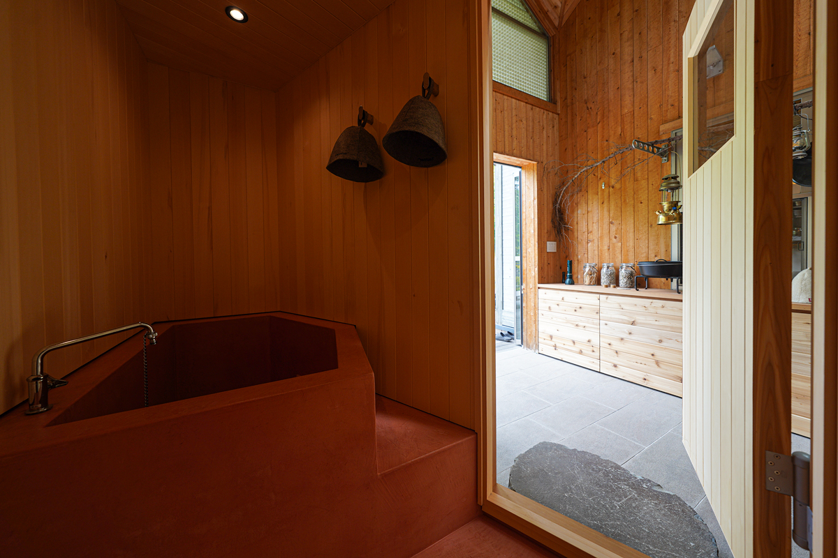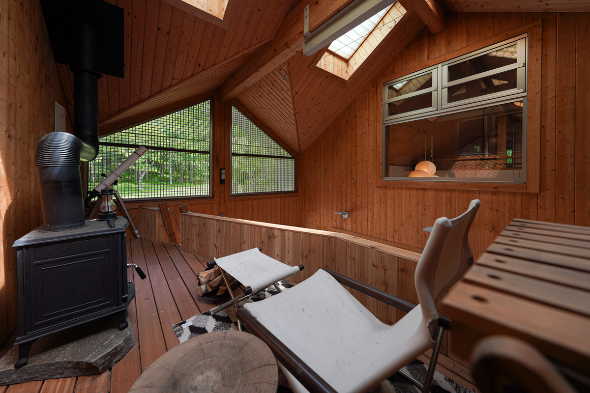 さらに、ワークスペースにはサウナと水風呂があり、そのままテラスに出て整う贅沢が味わえる。サウナ上部のロフトには薪ストーブが設置され、趣味の道具メンテナンスに没頭できる小さな隠れ家があるのも魅力である。
