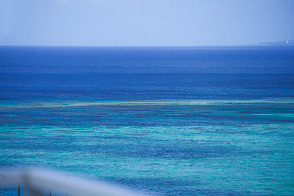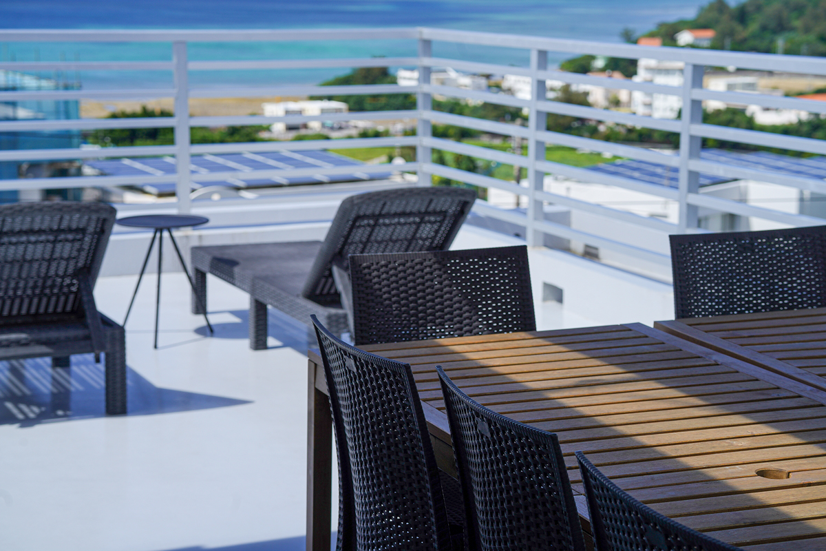 ルーフテラスからはエメラルドグリーンの入り江、その先に広がる深い青の東シナ海を望む。風に揺れるサトウキビ畑の緑がパノラマに広がり、南国沖縄ならではの景観を存分に味わうことができる。