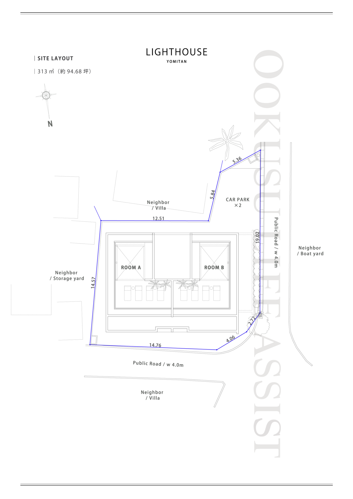 LIGHTHOUSEは、その読谷村の中でも青の洞窟で知られる真栄田岬と、ホエールウォッチングで有名な残波岬の間に位置する長浜エリアに所在する。世界遺産座喜味城跡へ車で約5分、美浜アメリカンビレッジへ約25分、美ら海水族館へも日帰りで訪れることが可能な立地であり、沖縄を代表する観光・アクティビティの拠点として優れたポジションを誇る。また、丘の上に位置することで、塩害や台風被害の影響が緩和される点も大きな魅力である。