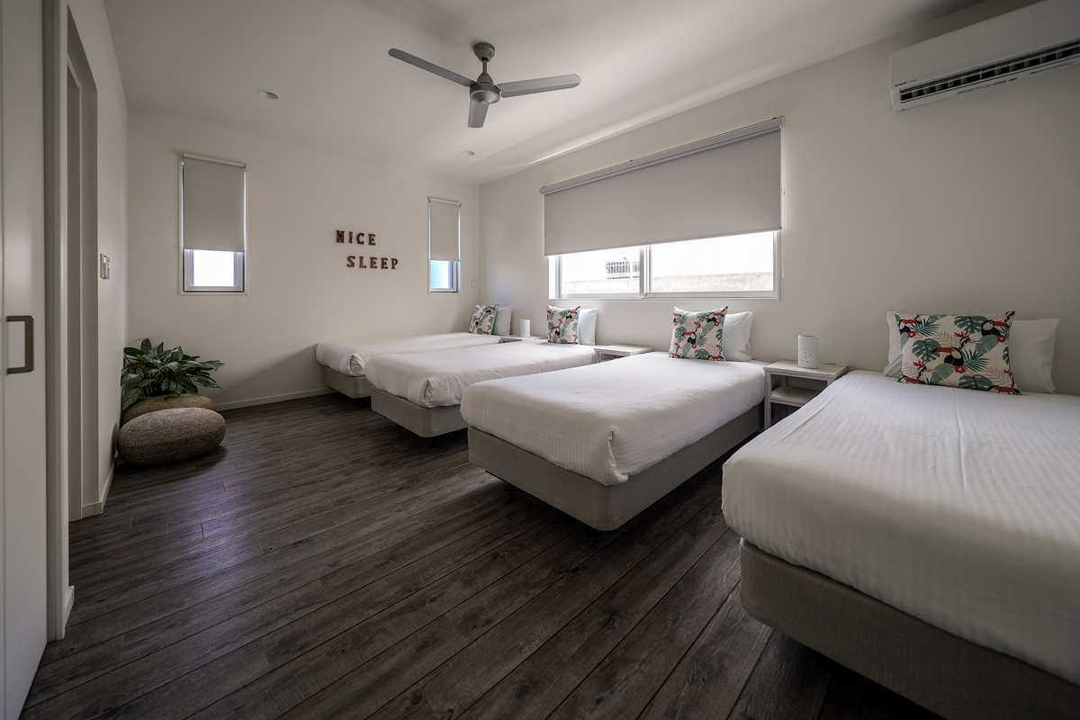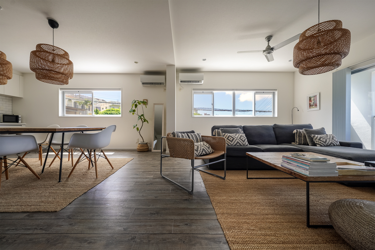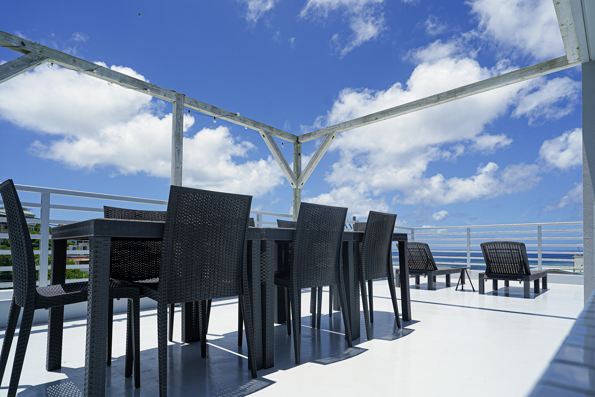 キッチンは清潔なオフホワイトで統一され、複数人が並んで調理可能な作業スペースを持ち、食洗機など機能設備も整う。屋上には長浜の海を一望できるBBQテラスとダイニングを設置。沖縄の太陽と風をダイレクトに感じながら過ごす時間は、このユニットの最大の醍醐味と言える。