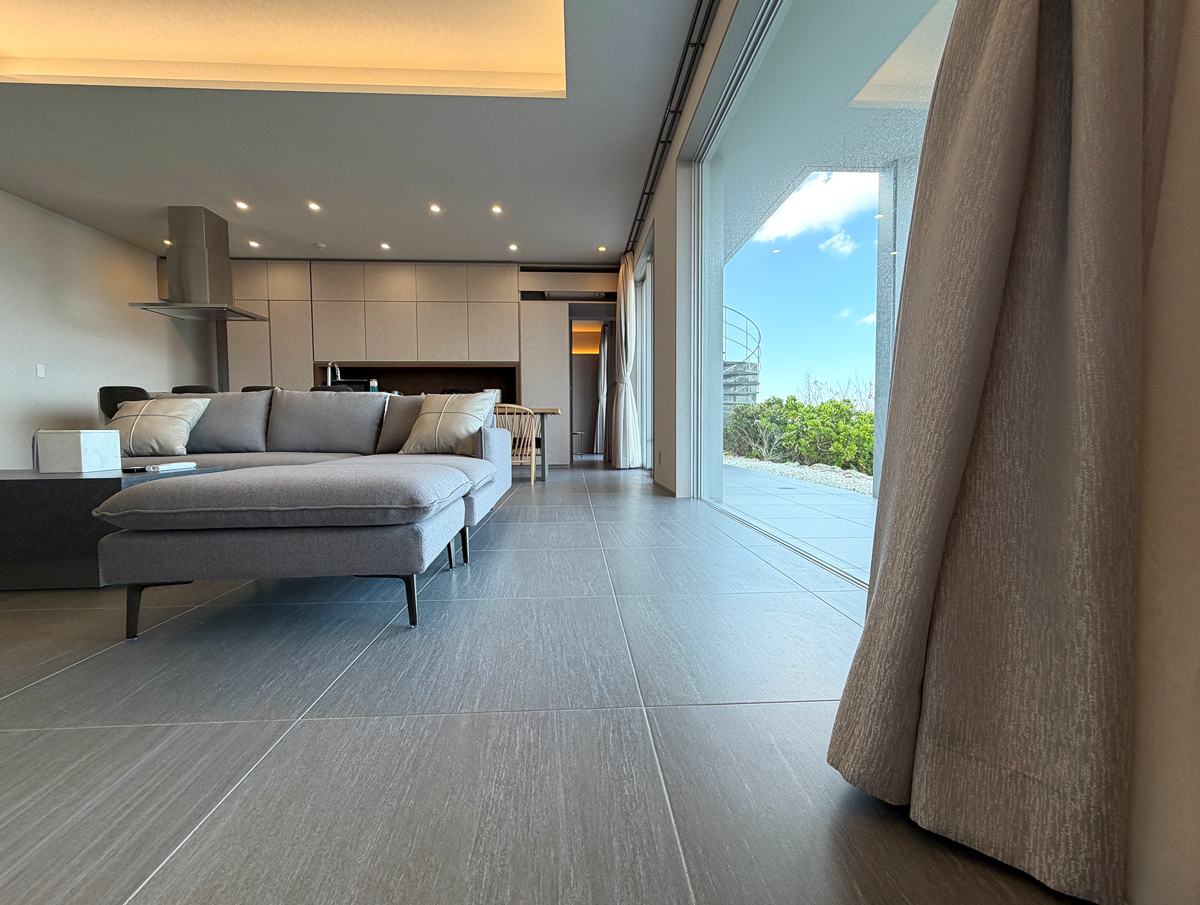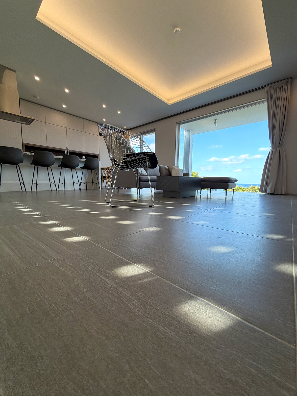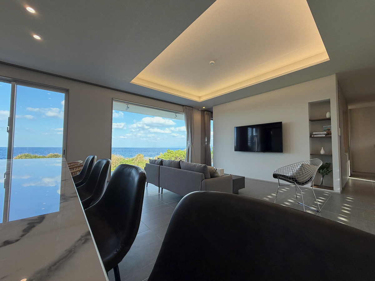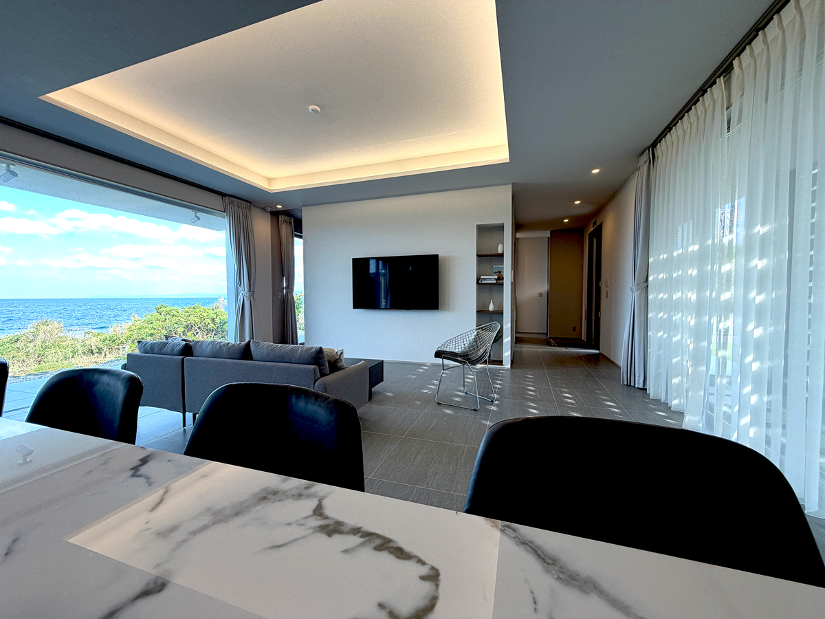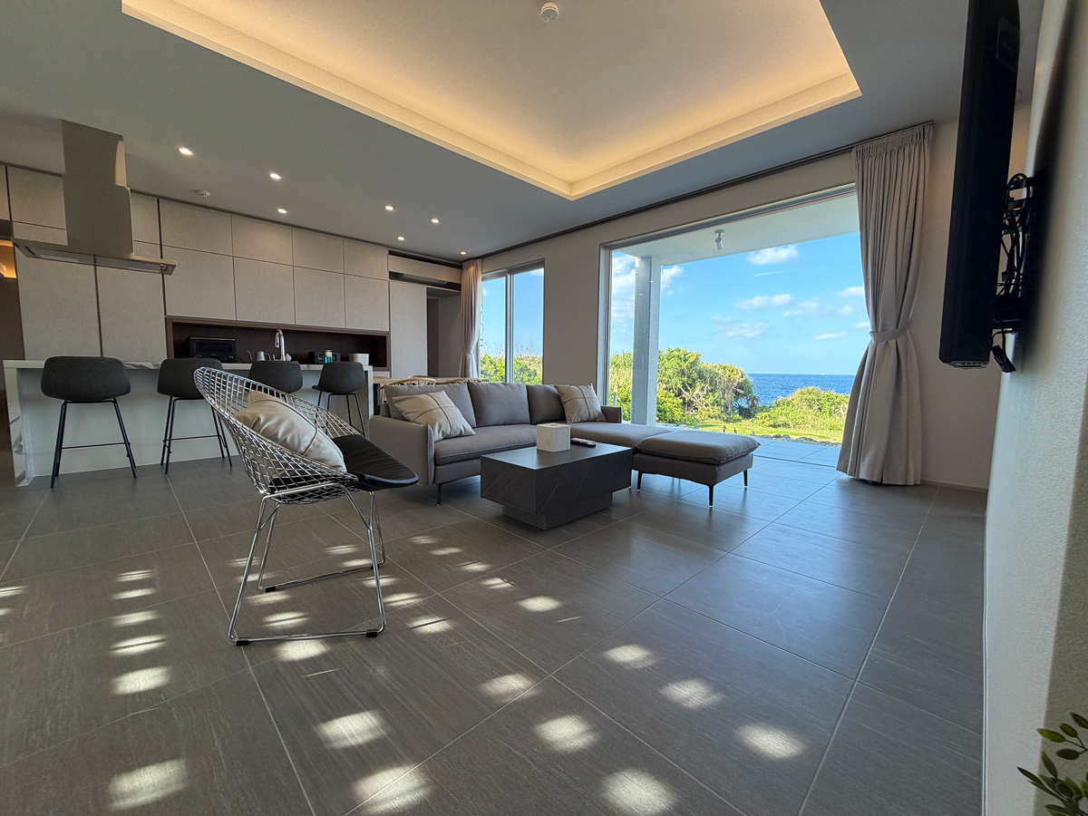 建物は2008年に建築され、2025年7月にフルリノベーションを実施。室内はすべて一新され、上質なマテリアルとミニマルなデザインが融合した現代的な空間が完成している。平屋建ての構造により、室内はすべてフラットな動線で構成されており、世代を問わず快適に過ごせる。リビングをはじめ、建物内の至るところから東シナ海の広がりを望むことができ、自然との一体感を得られる設計が施されている。大海原に向かってまるで滑空していくような、迫力あるフロアレベルが特徴であり、この土地の持つポテンシャルを最大限に引き出している。