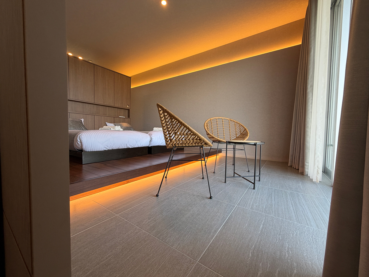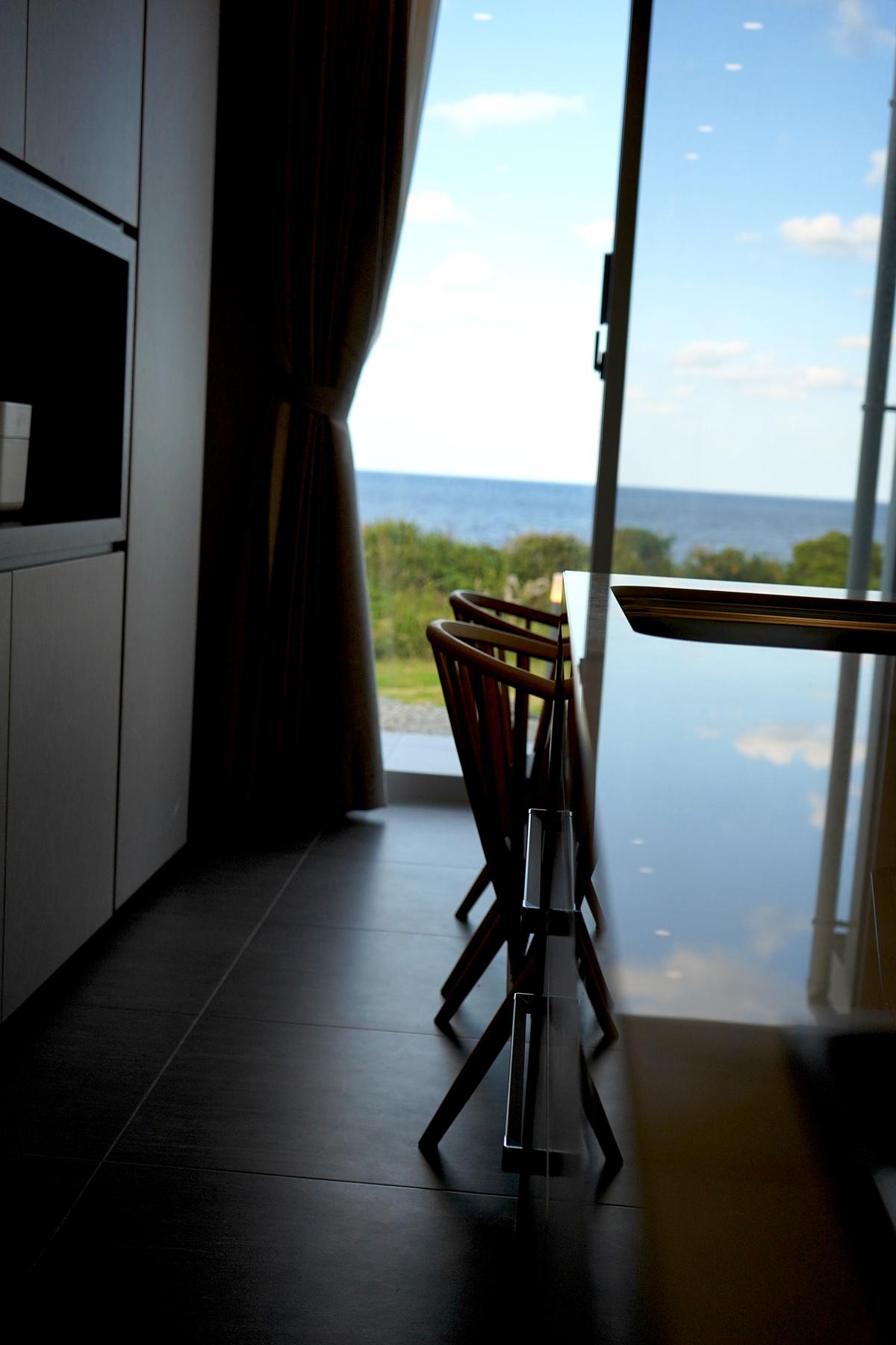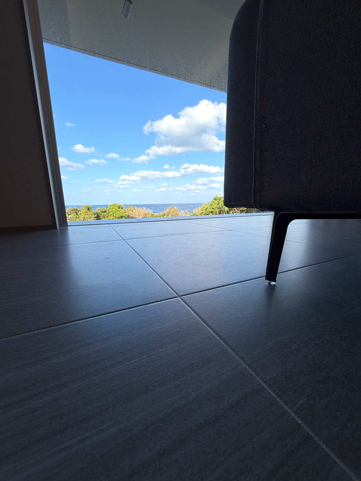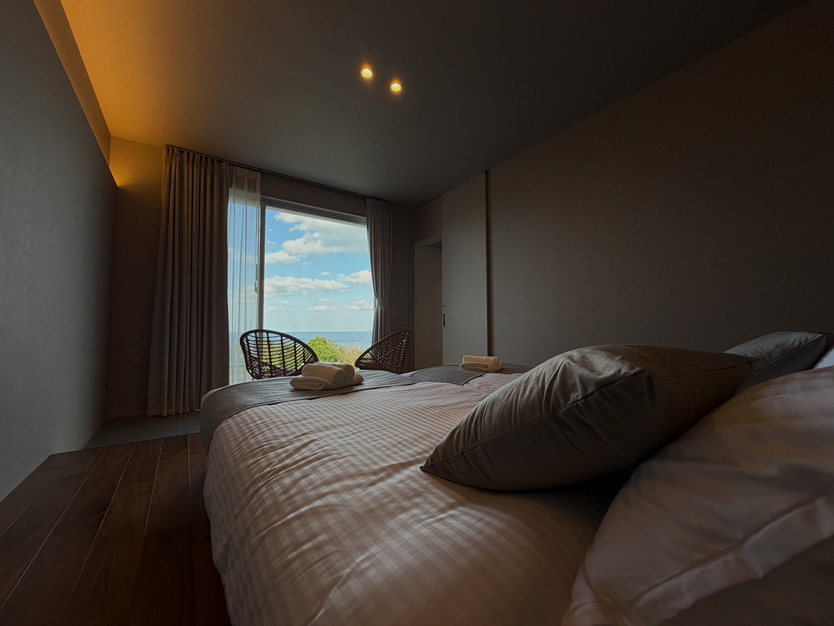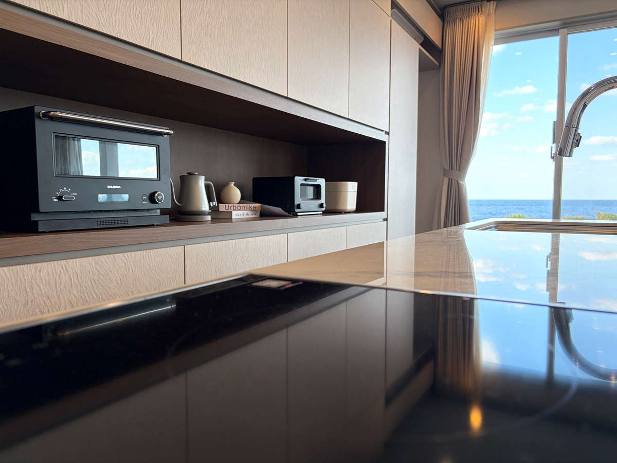 建物は2008年に建築され、2025年7月にフルリノベーションを実施。室内はすべて一新され、上質なマテリアルとミニマルなデザインが融合した現代的な空間が完成している。平屋建ての構造により、室内はすべてフラットな動線で構成されており、世代を問わず快適に過ごせる。リビングをはじめ、建物内の至るところから東シナ海の広がりを望むことができ、自然との一体感を得られる設計が施されている。大海原に向かってまるで滑空していくような、迫力あるフロアレベルが特徴であり、この土地の持つポテンシャルを最大限に引き出している。