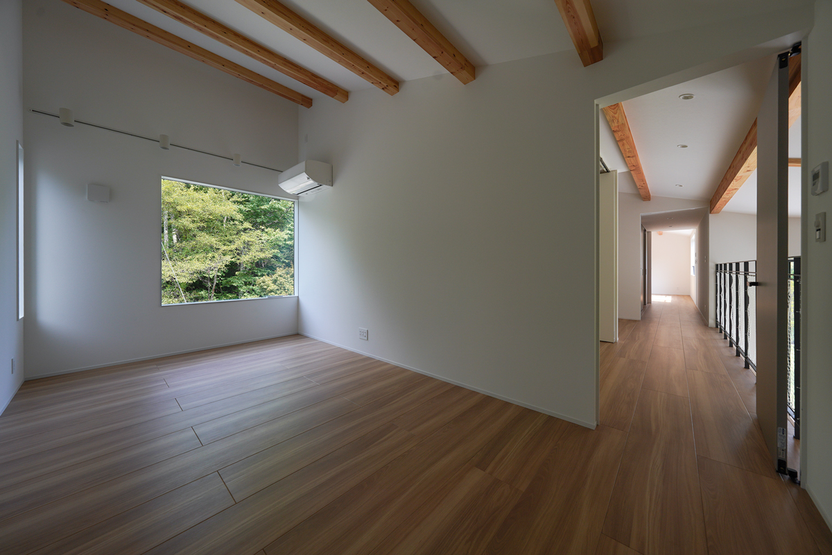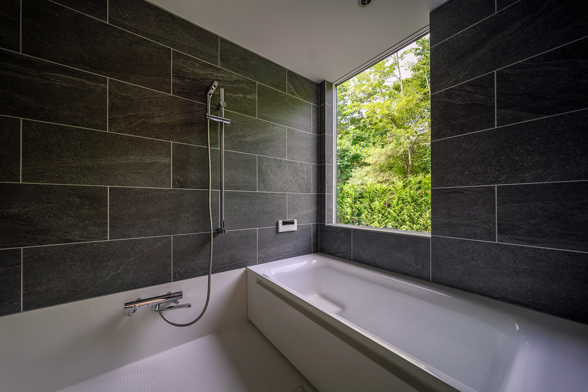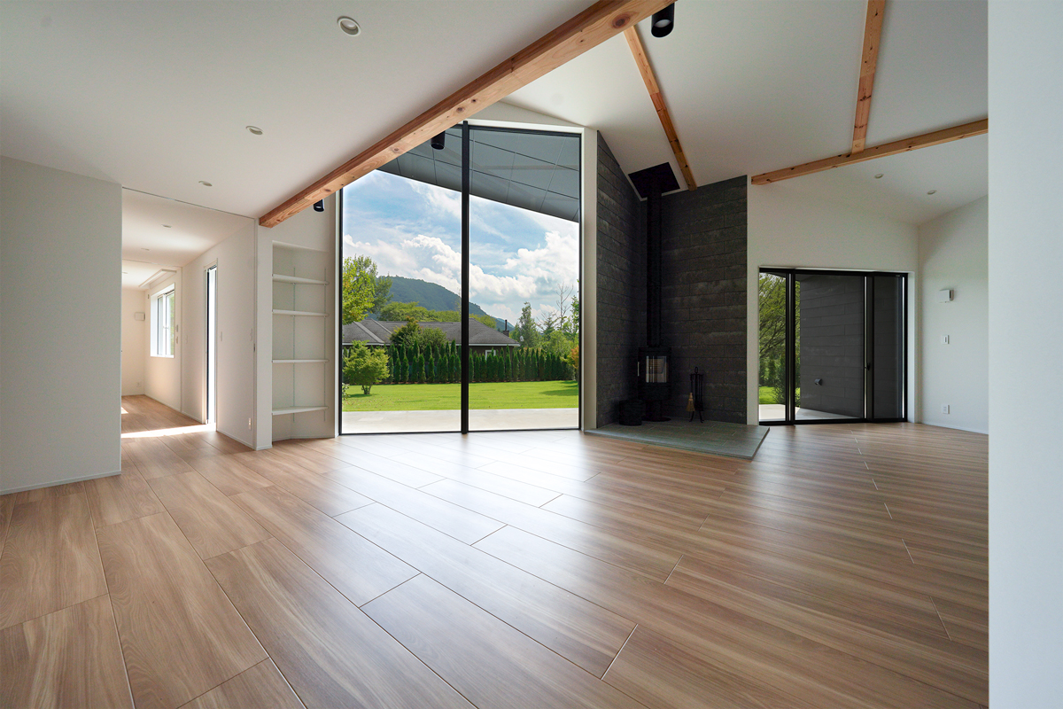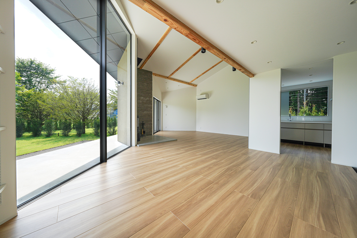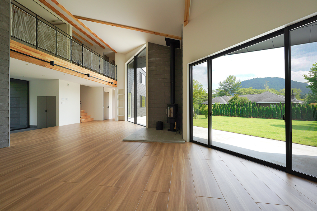 建物は、シンプルかつ洗練された空間構成を基本としながら、自然との調和を意識した設計となっている。大きな開口部からは、庭とその先に広がる山の稜線を一望でき、四季の移ろいを室内から感じることができる。