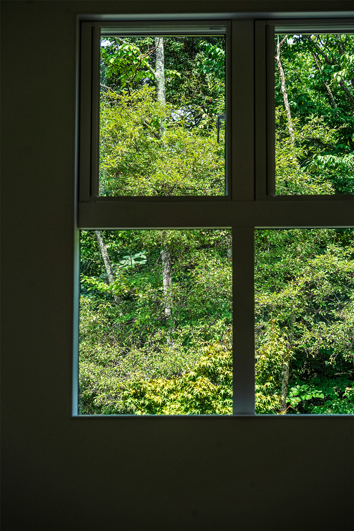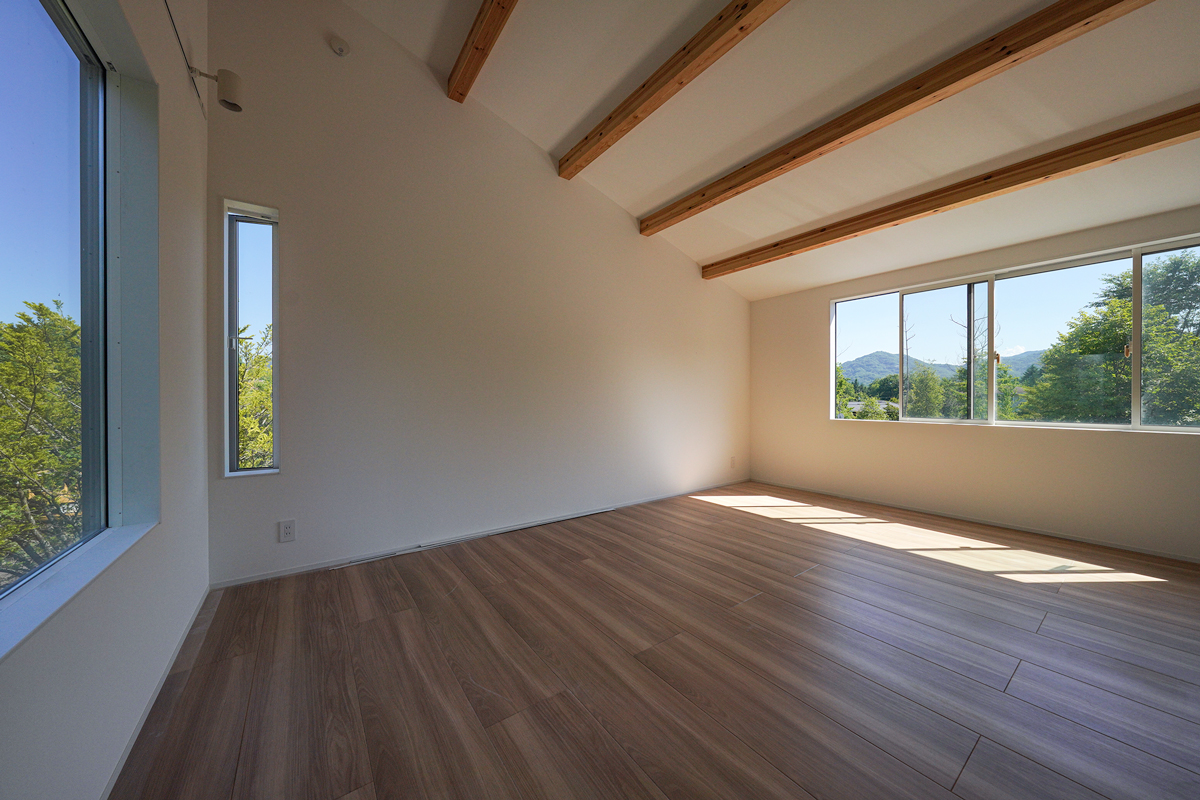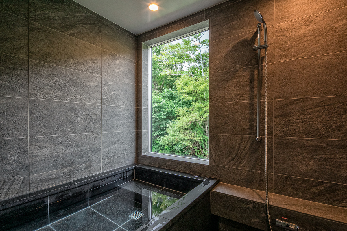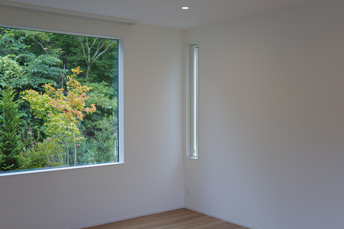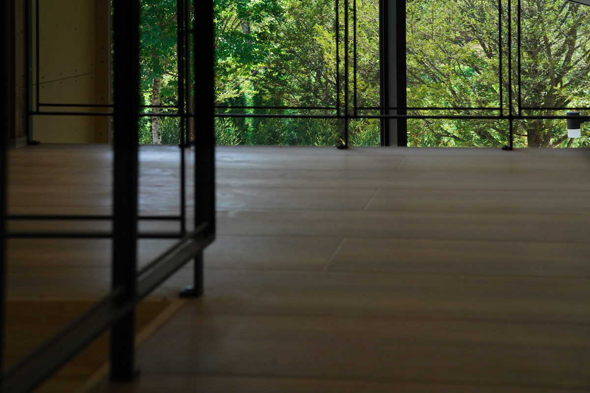 建物は、シンプルかつ洗練された空間構成を基本としながら、自然との調和を意識した設計となっている。大きな開口部からは、庭とその先に広がる山の稜線を一望でき、四季の移ろいを室内から感じることができる。