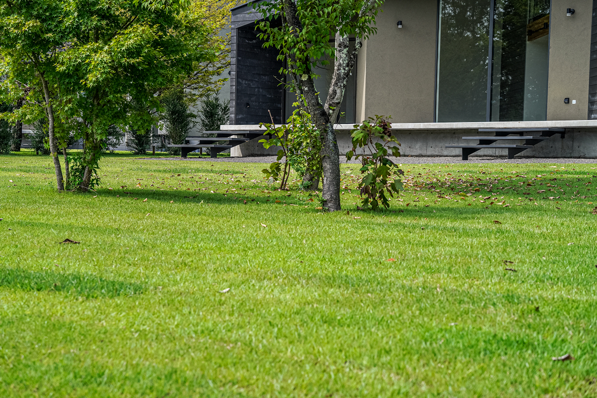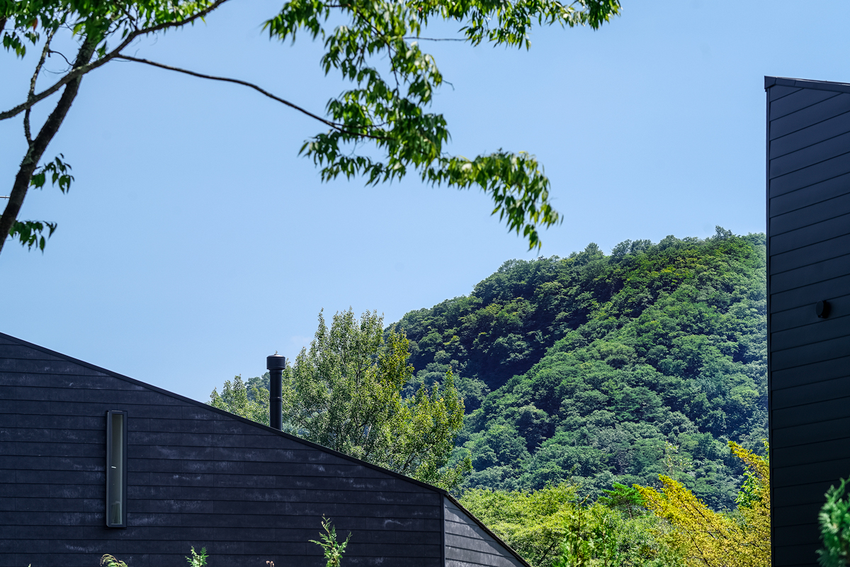 正面には雄大な山並みが広がり、静かなガーデンと融合することで、唯一無二の景観を形成している。