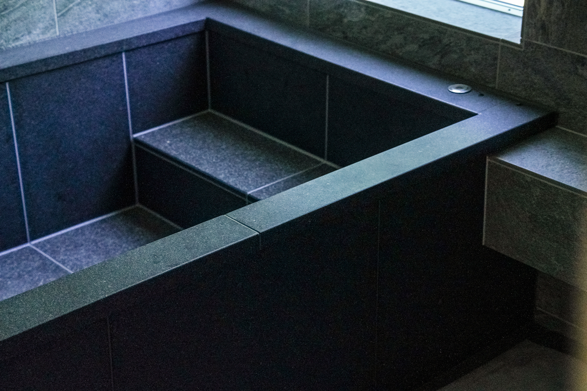 庭は、室内と一体的に考えられており、リビングからそのまま自然へとつながるような構成が印象的である。ガーデンには重厚感ある石材が施されており、空間全体に落ち着きと風格を与えている。