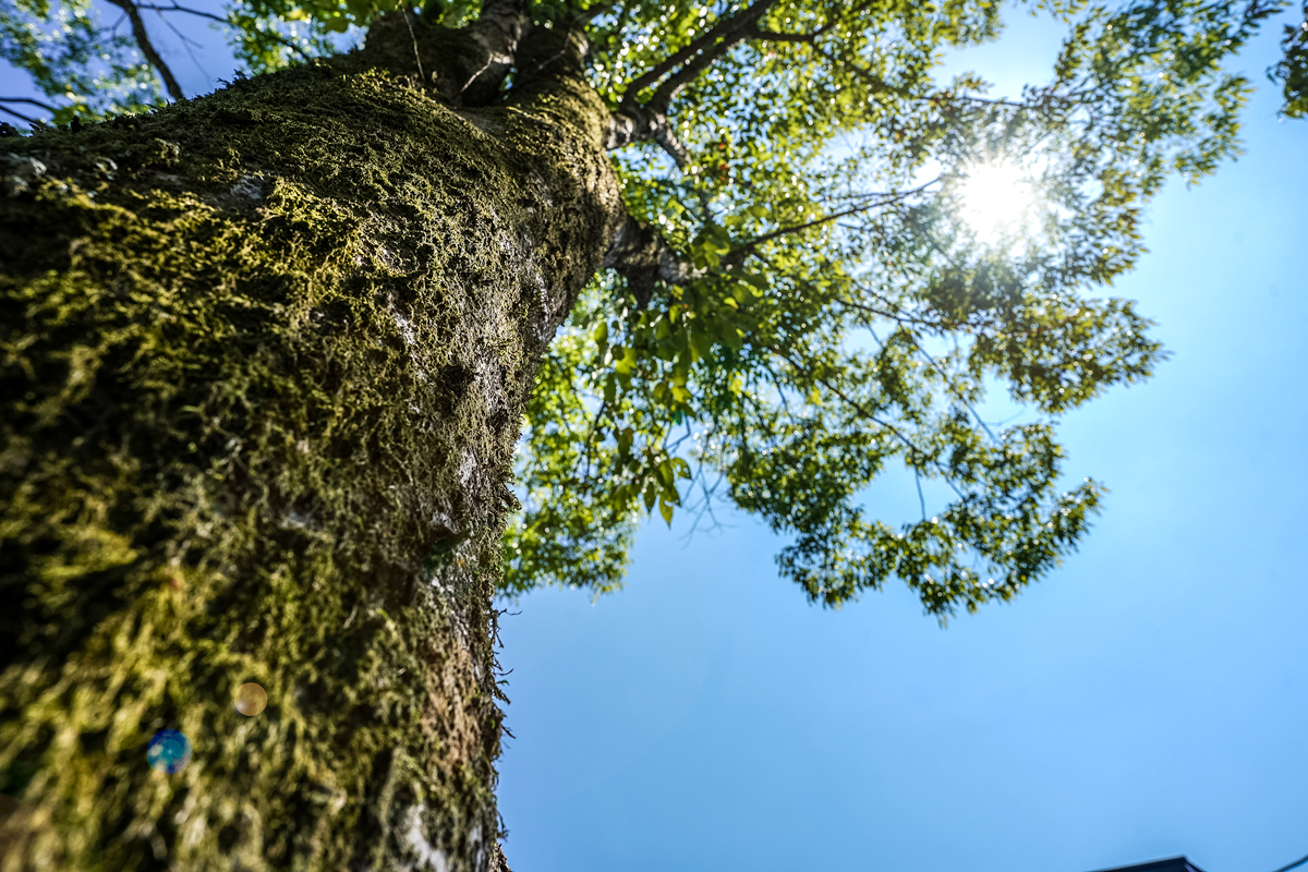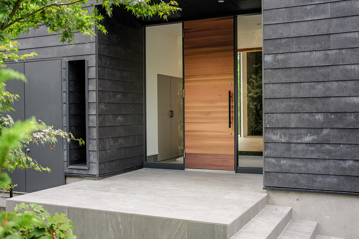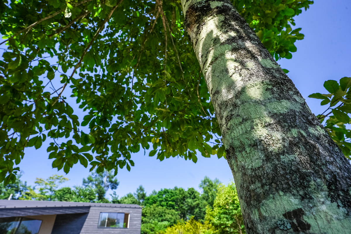 敷地内には、もともとこの地に根づいていた樹木とともに、丁寧に選ばれた植栽がバランスよく配置されており、豊かな緑が住まい全体を包み込んでいる。