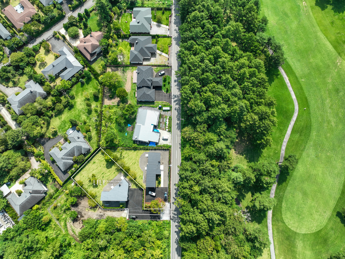 本物件の眼前には、軽井沢72ゴルフ南コースのフェアウェイが広がり、広大な景色を望む。周辺には新しいヴィラが点在し、景観とプライバシーのバランスが保たれた環境にある。日当たりの良さと空の広さを感じられる開放的な立地である。周辺施設としては、軽井沢駅(約4.6km)、碓氷軽井沢IC(約5.5km)へのアクセスが良く、都市圏との行き来も容易である。また、軽井沢プリンスショッピングプラザ(約3.8km)、ご当地スーパー「ツルヤ」(約6.0km)、地元農産物の直売所である軽井沢発地市庭(約4.7km)など、利便性と地域性を兼ね備えた施設がそろっている。