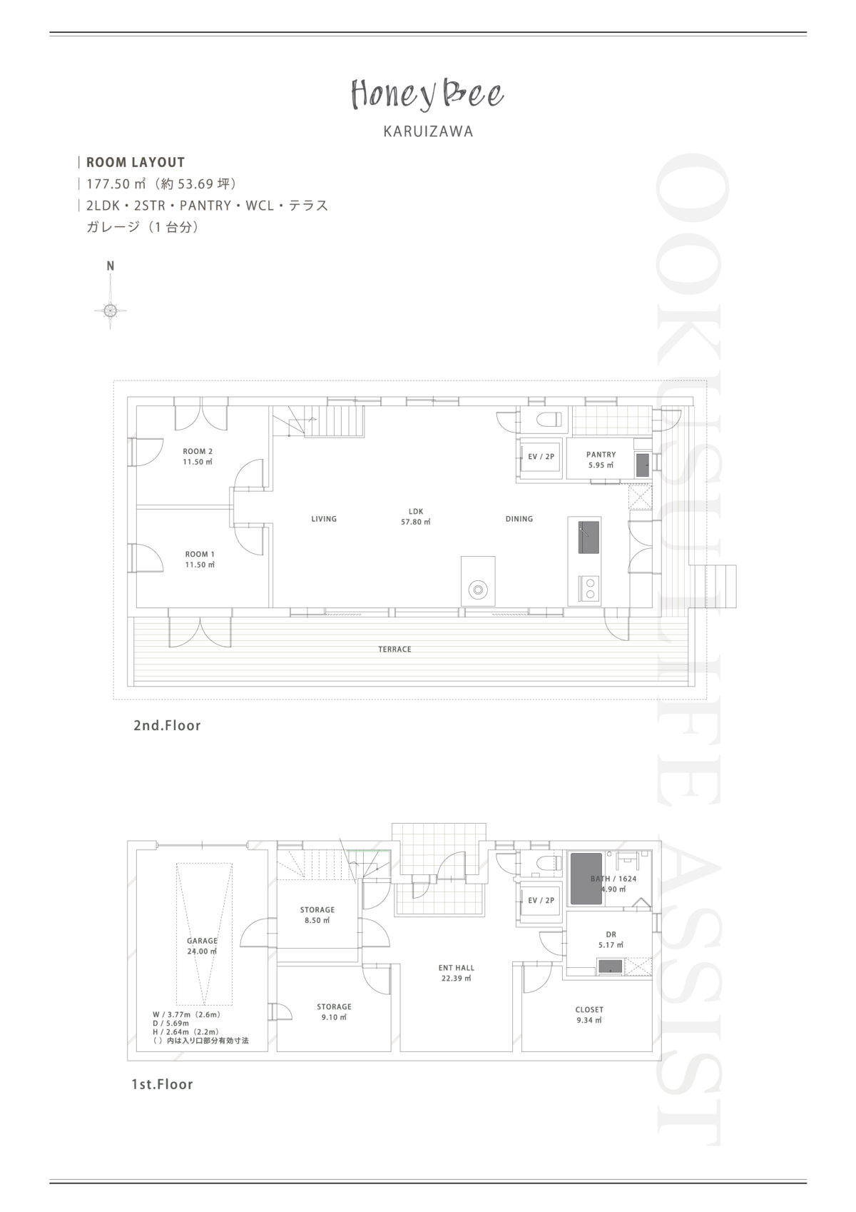 | 2F | LDK、寝室×2、バスルーム、テラス、パントリー |