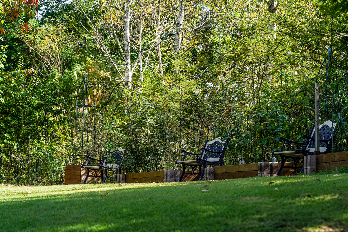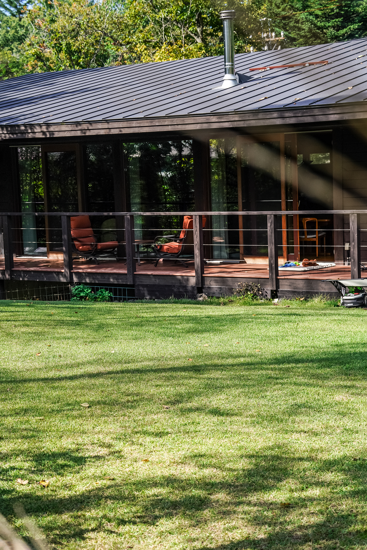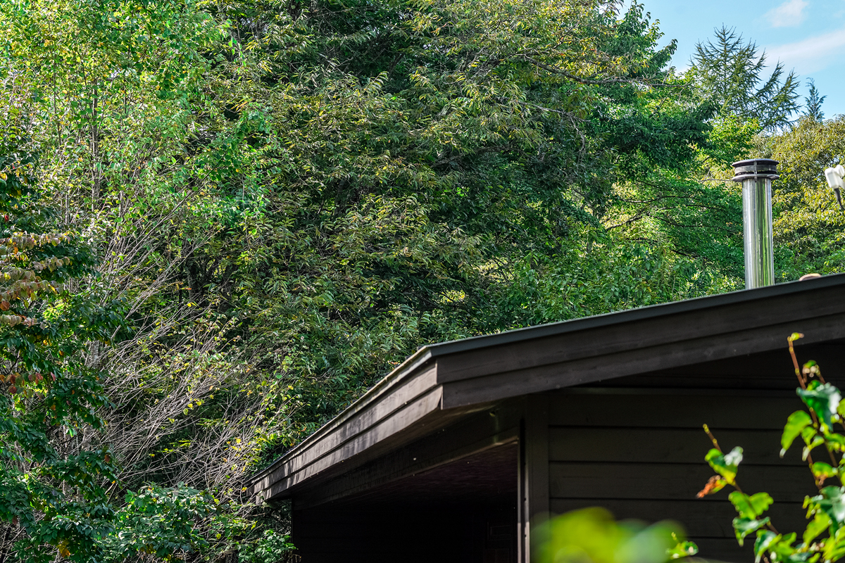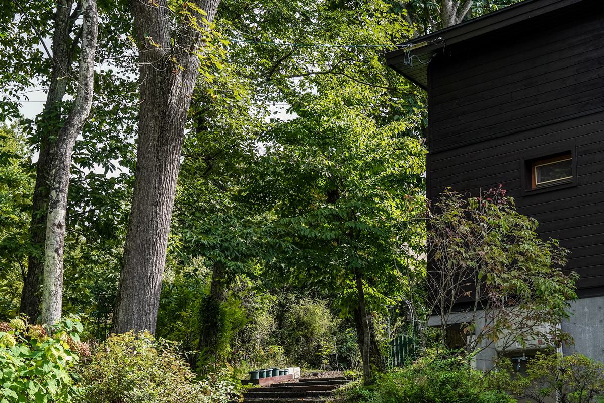 その一角には、太陽を浴びたモッコウバラのアーチ。薪小屋の脇には木洩れ日が落ちる。芝庭の上では、時折リスが跳ね、小鳥が低く舞う。建物が道路と庭のあいだに配されていることで、芝庭は森の中の隠れたリビングとなっている。風が芝を撫で、木々が揺れ、そこにいるだけで時間が緩やかになる感覚がある。