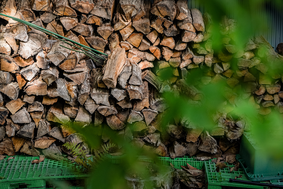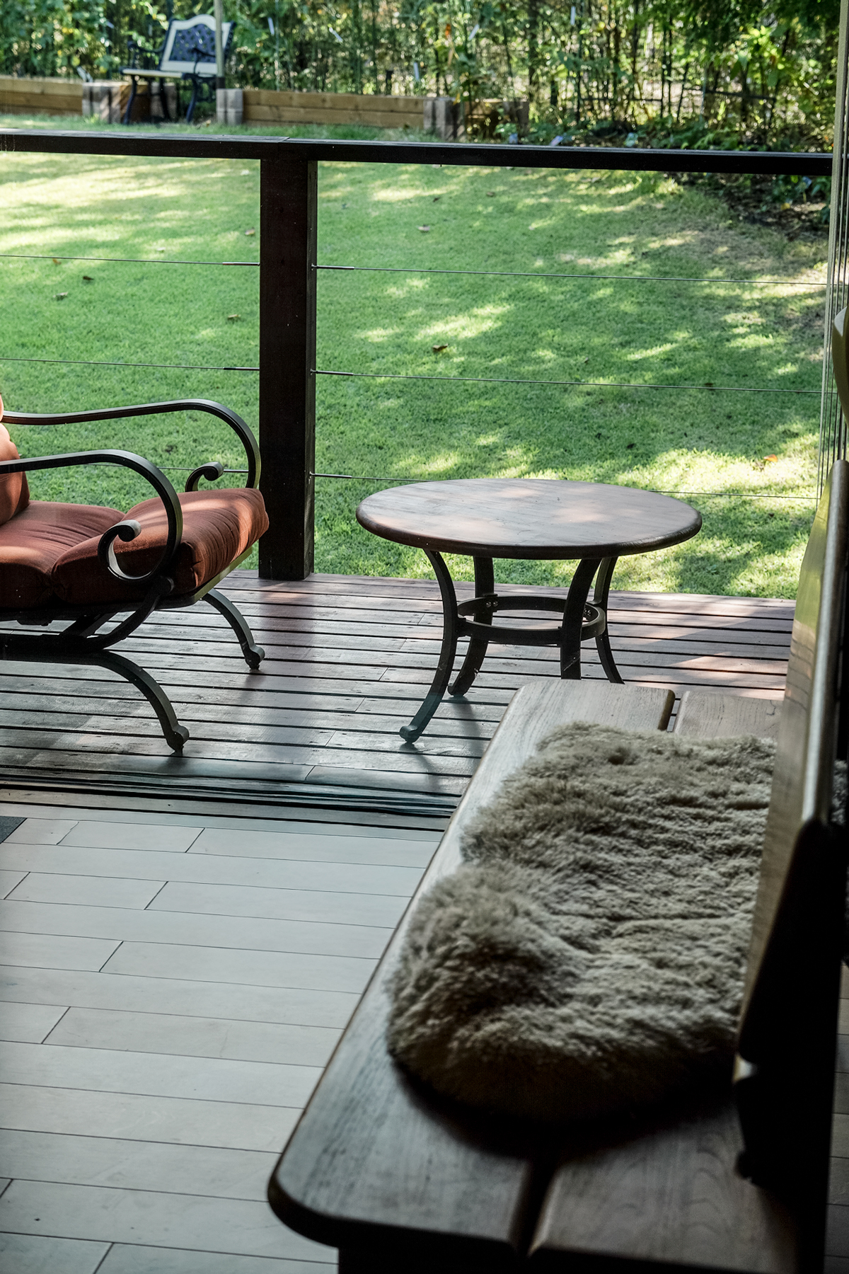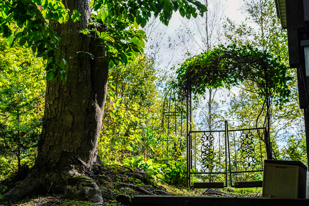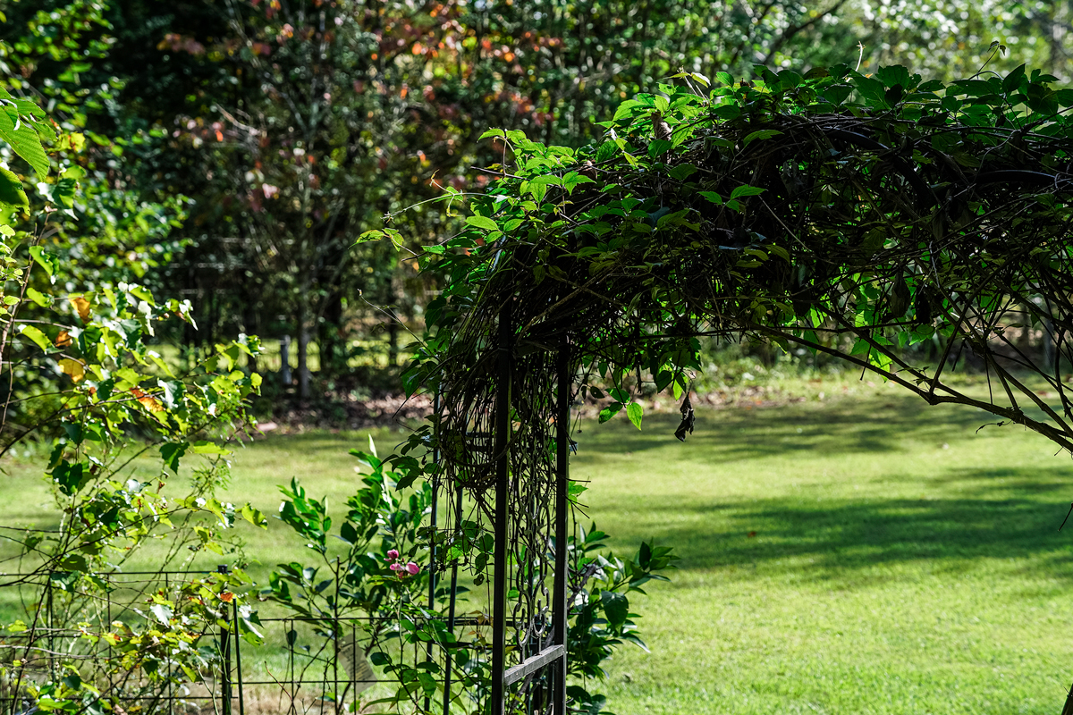 その一角には、太陽を浴びたモッコウバラのアーチ。薪小屋の脇には木洩れ日が落ちる。芝庭の上では、時折リスが跳ね、小鳥が低く舞う。建物が道路と庭のあいだに配されていることで、芝庭は森の中の隠れたリビングとなっている。風が芝を撫で、木々が揺れ、そこにいるだけで時間が緩やかになる感覚がある。