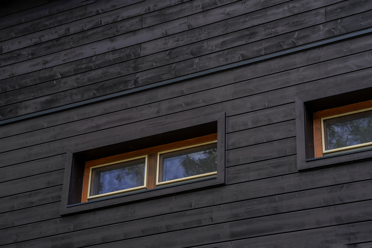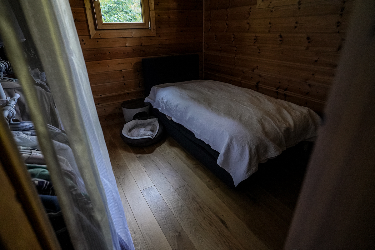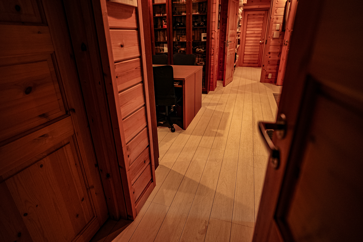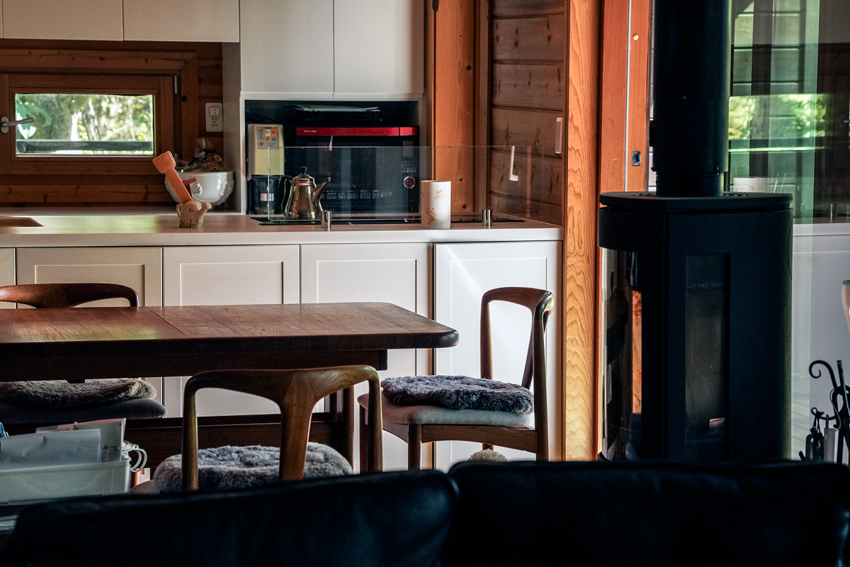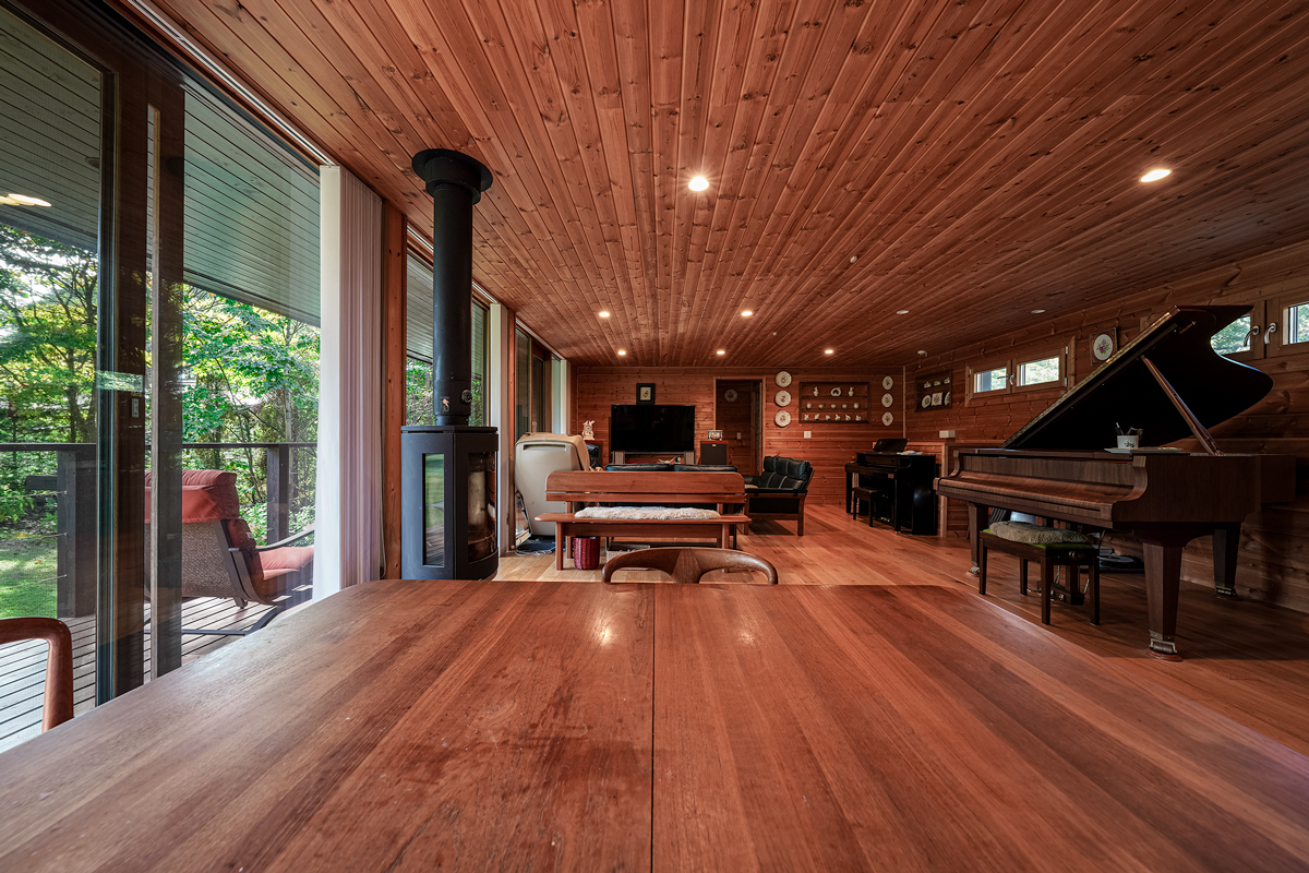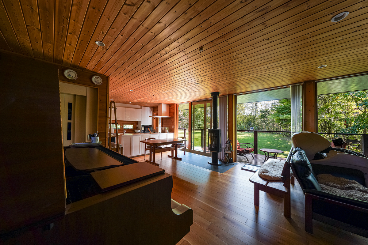 建物は、片流れ屋根と板張りの外観が印象的なマウンテンヴィラのスタイルである。2階のLDKは、ほぼ全面ガラス。芝庭とひとつながりになるような空間が広がっている。木の床に素足を乗せ、朝の光を浴びながら淹れるコーヒーが日常になる。中央にはグランドピアノ。窓の外の緑と調和しながら、木の響きを静かに空間へと伝える。冬には薪ストーブに火が入り、ぱちぱちと音を立てながら空間を包みこむ。炎の揺らぎに照らされた木の壁と天井が、まるで森の延長のようなぬくもりをつくる。