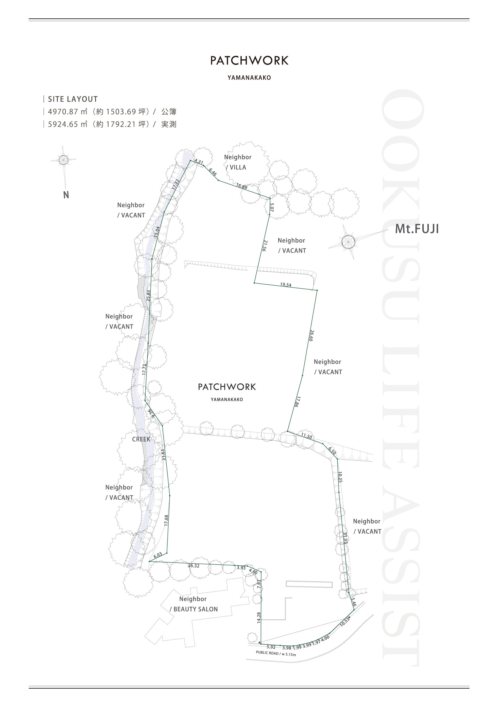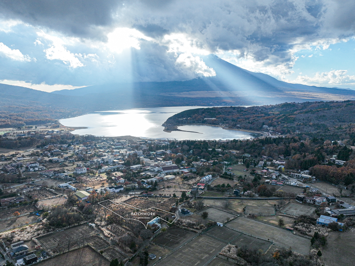 南都留郡山中湖村平野に位置する売地「PATCHWORK」は、敷地の正面に富士山の雄姿を捉える希少なロケーションを備えた開発ポテンシャルの高い物件である敷地の実測面積は約5,924㎡(約1,792坪)と、宿泊施設やショップを併設する商業計画にも十分に対応するスケールを誇る。東富士五湖道路「山中湖IC」から車で約14分と、ツーリスト導線に自然と組み込まれる利便性を持つ。山中湖の外輪山に囲まれた穏やかな環境と、富士山を真正面に据える絶好の眺望が揃うことで、多彩なアイデアを縫い合わせる“パッチワーク”の名にふさわしい創造性あふれるフィールドとなっている。