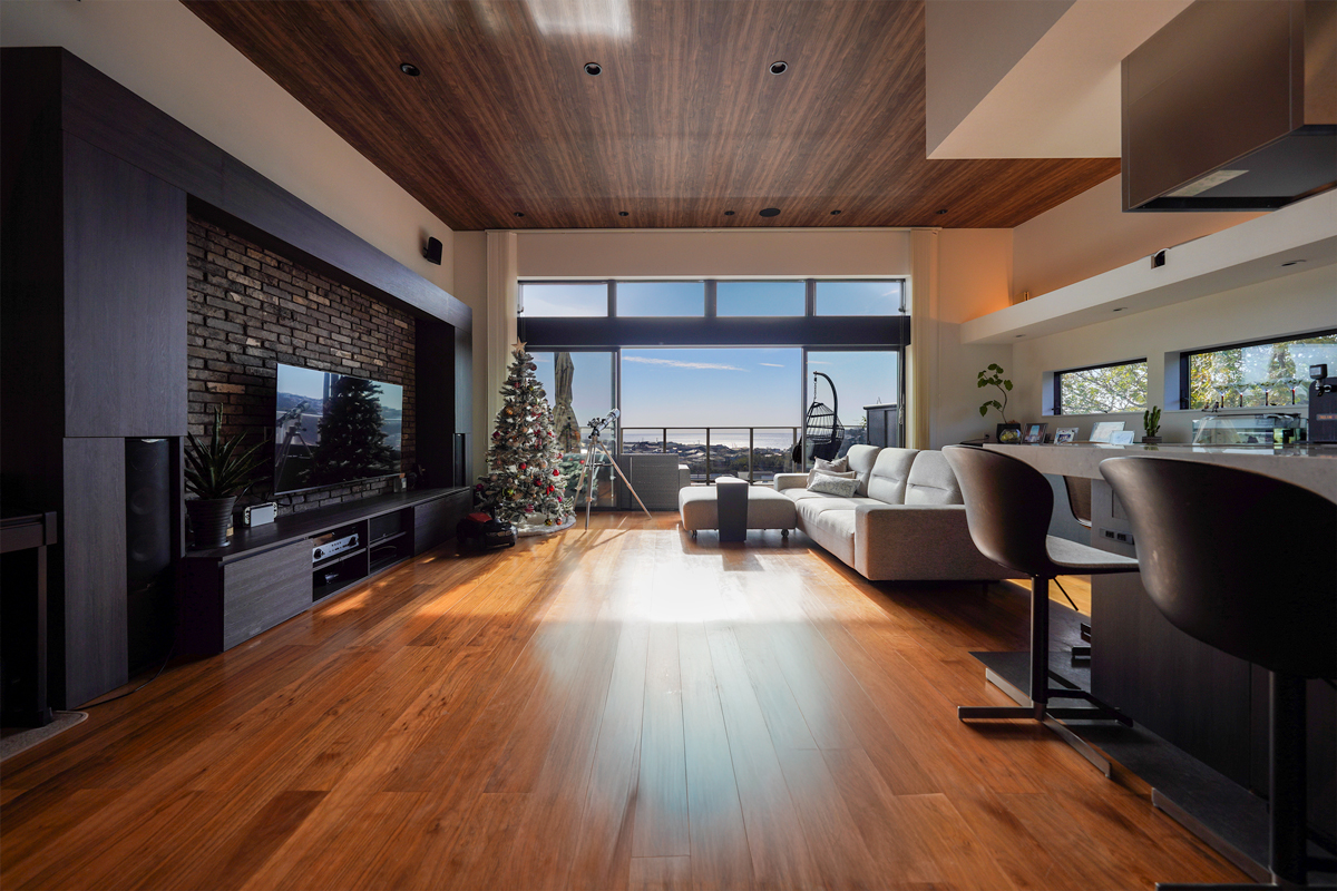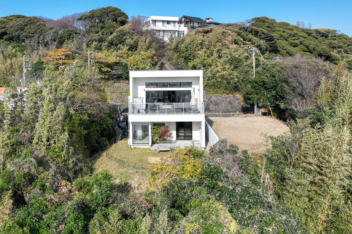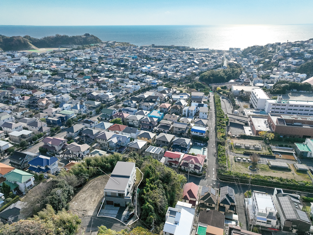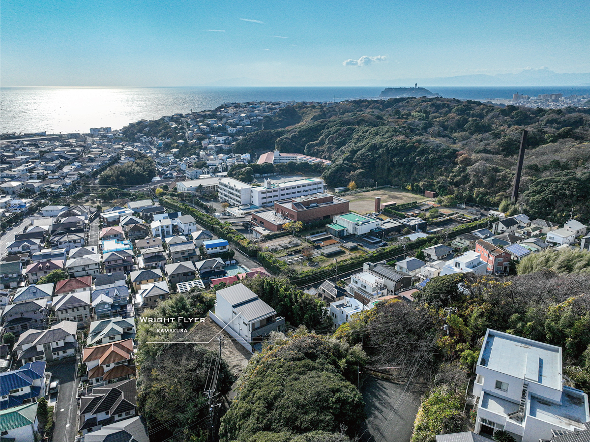 七里ガ浜の尾根、その先端という限られた場所に、この邸宅は佇んでいる。視界を遮るものはなく、空と相模湾が一体となって広がる。ここにあるのは、賑わいでも喧騒でもない静かな開放感である。WRIGHT FLYERは、単なる家ではない。眺望、建築、時間、そのすべてを私有するための、完成度の高い一邸である。