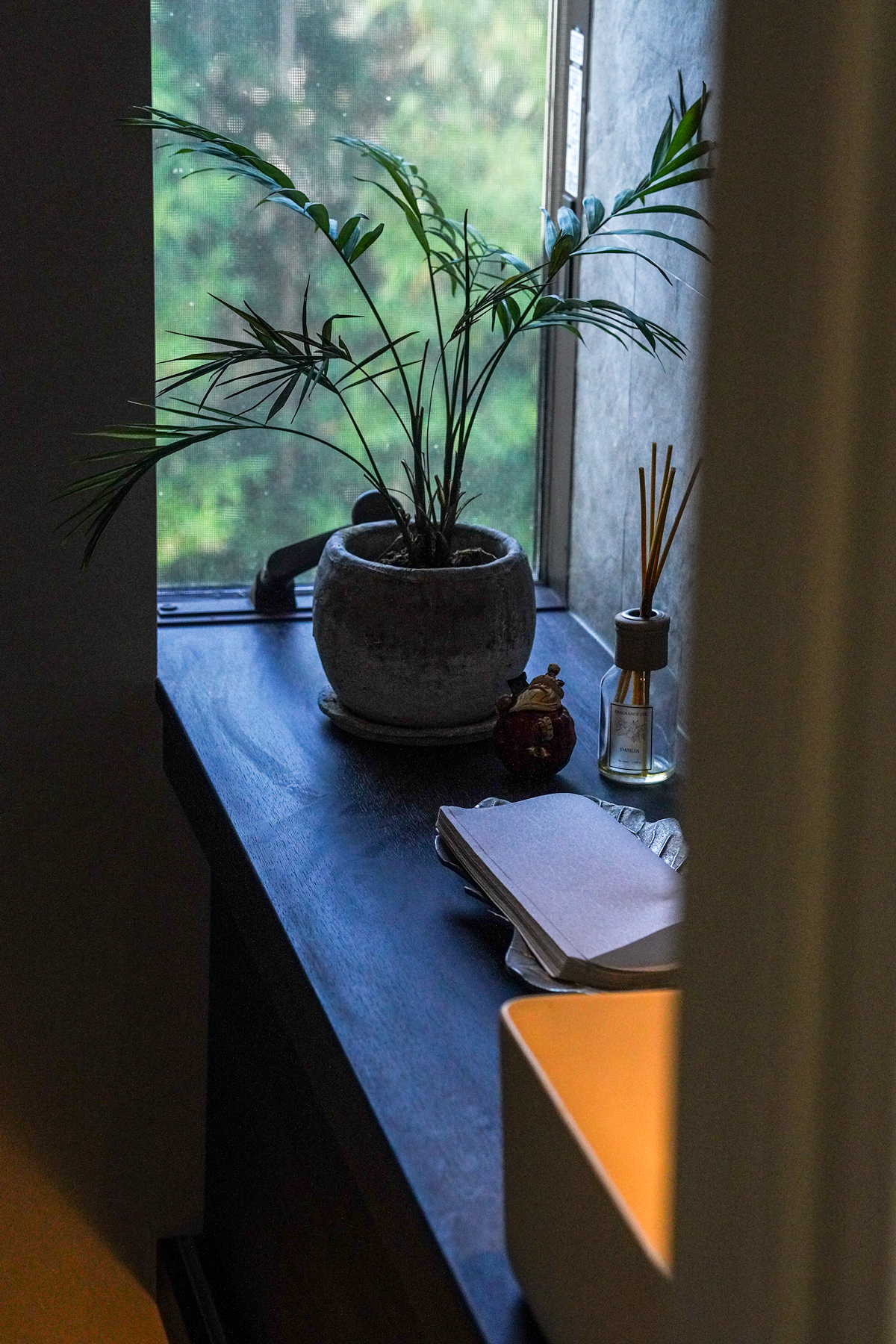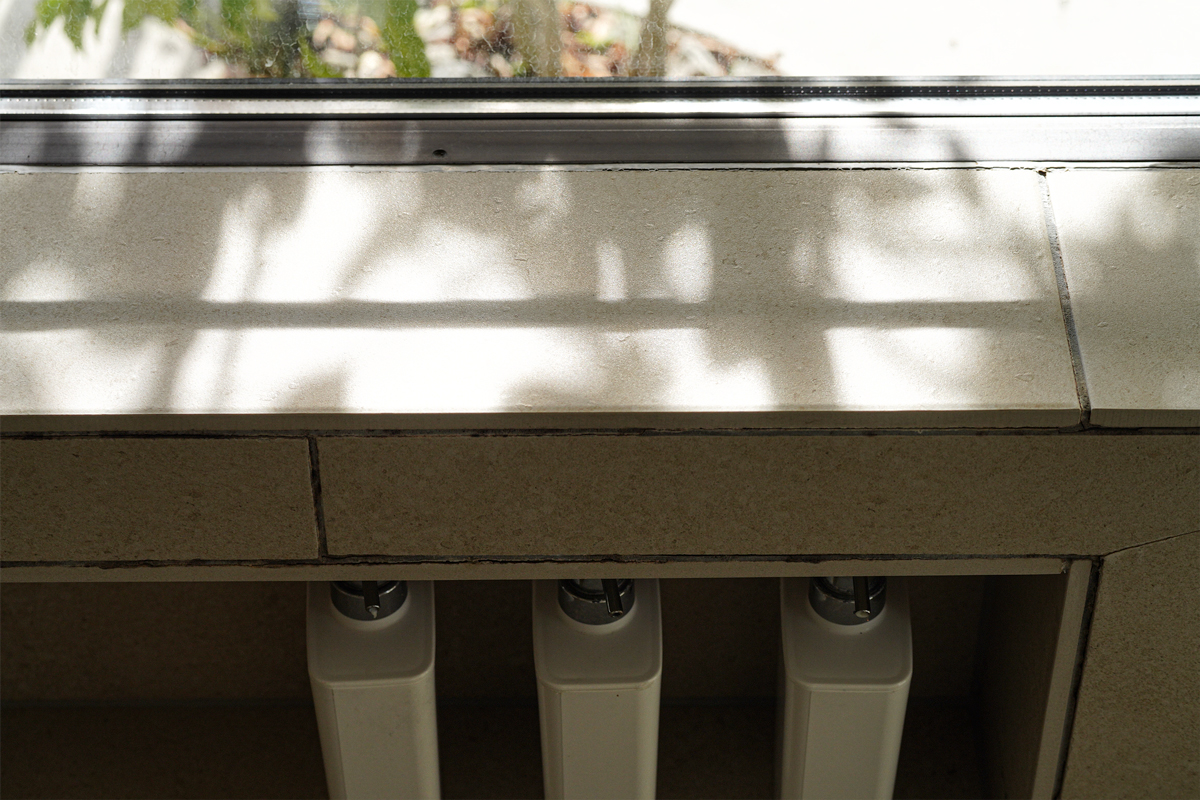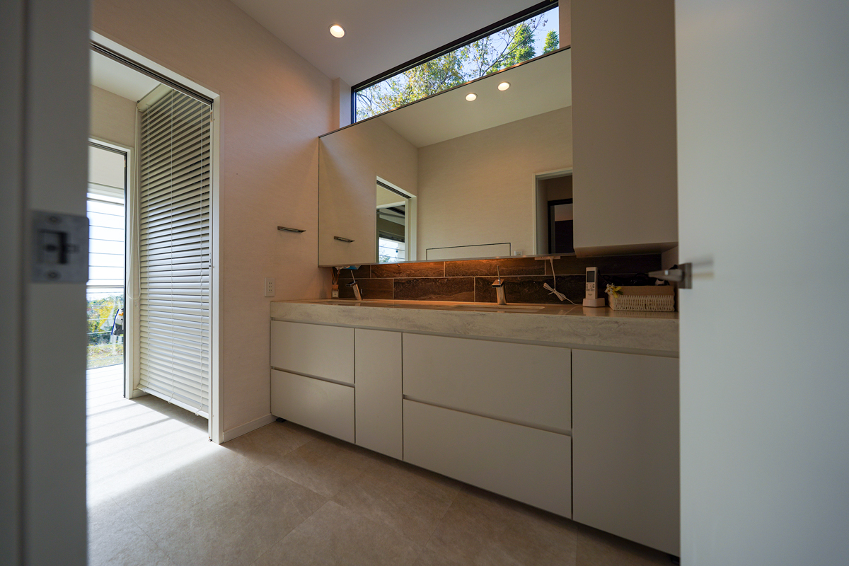 洗面室は庭に面し、視線の先に緑を配する。その奥にはガラス張りのサンルームを設け、潮風を気にすることなく採光と通風を確保している。造作浴室は大きな窓を備え、入浴という行為を、風景と向き合う贅沢な時間へと昇華させる。機能と情緒、その両立が丁寧に図られている。