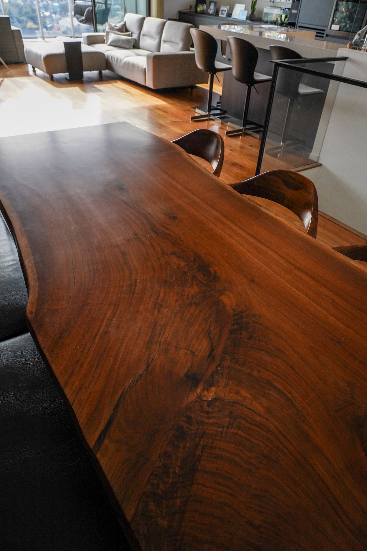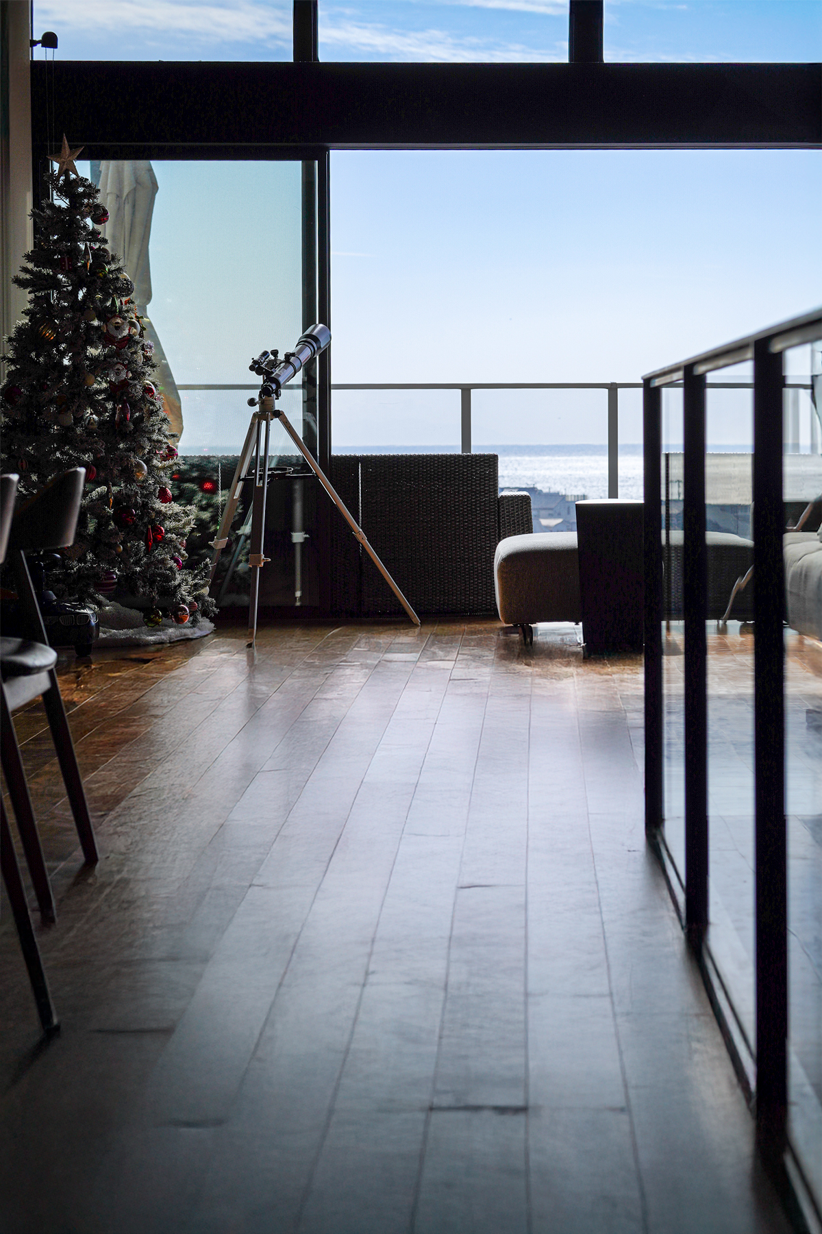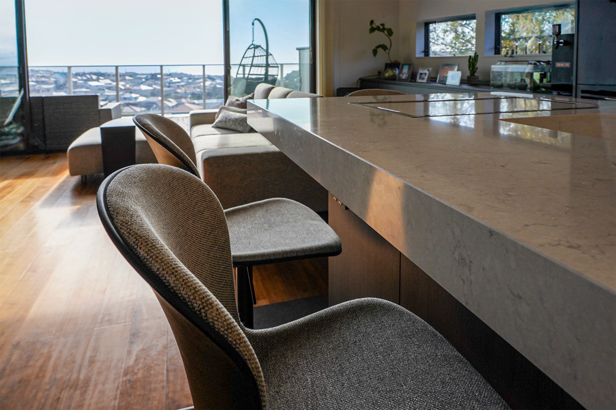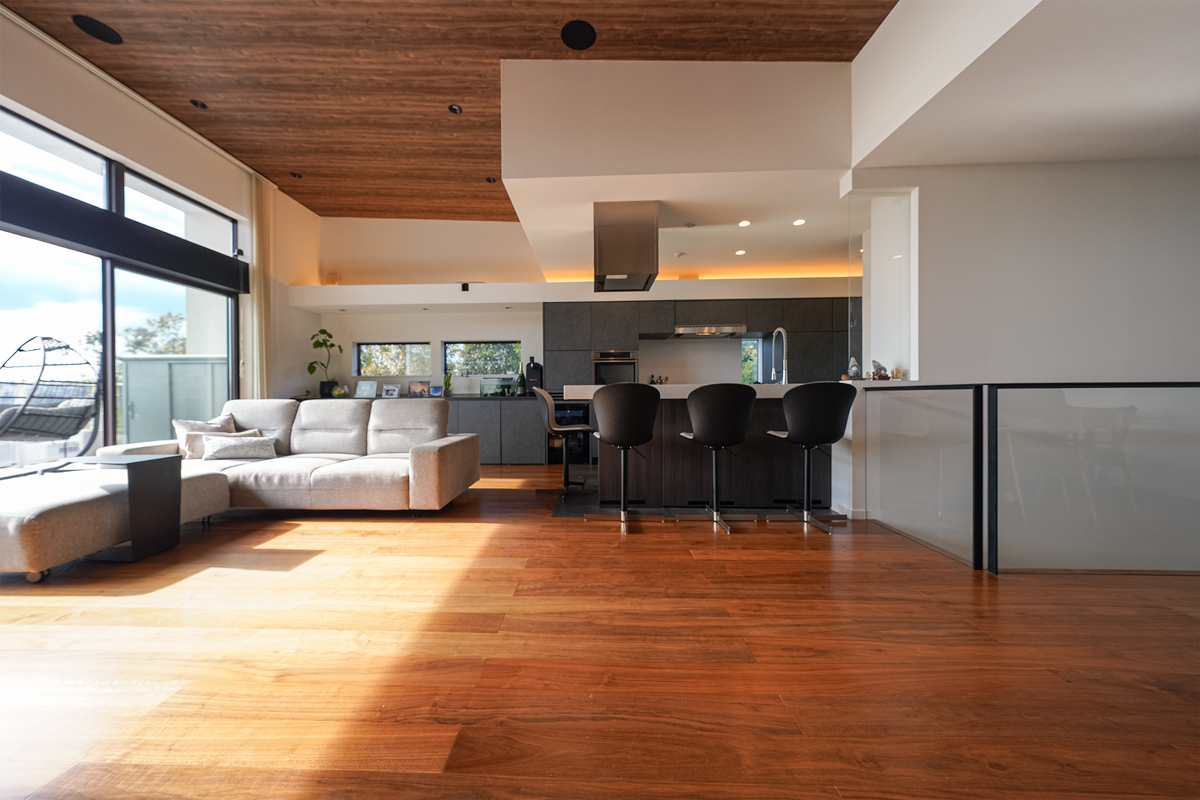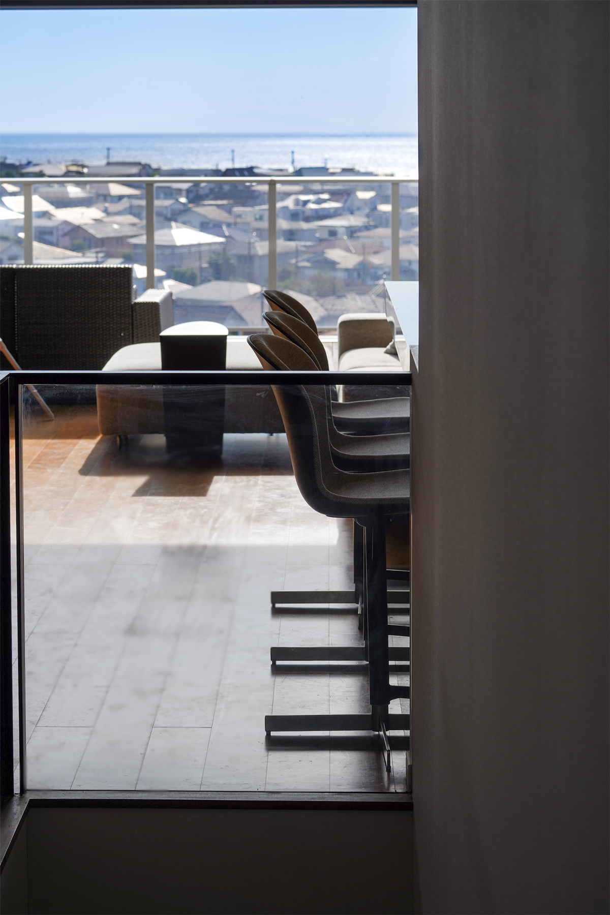 邸宅の中心となるリビングダイニングは、この家で最も美しい視点に据えられている。大開口の先に広がる水平線は、時間とともに表情を変え、室内に静かな緊張感をもたらす。奥行きのあるバルコニーは、室内と連続するアウトドアリビングとして機能する。昼は光と風を招き入れ、夜は月明かりと静寂を受け止める。内と外の境界は意図的に曖昧にされ、空間には浮遊感が生まれている。