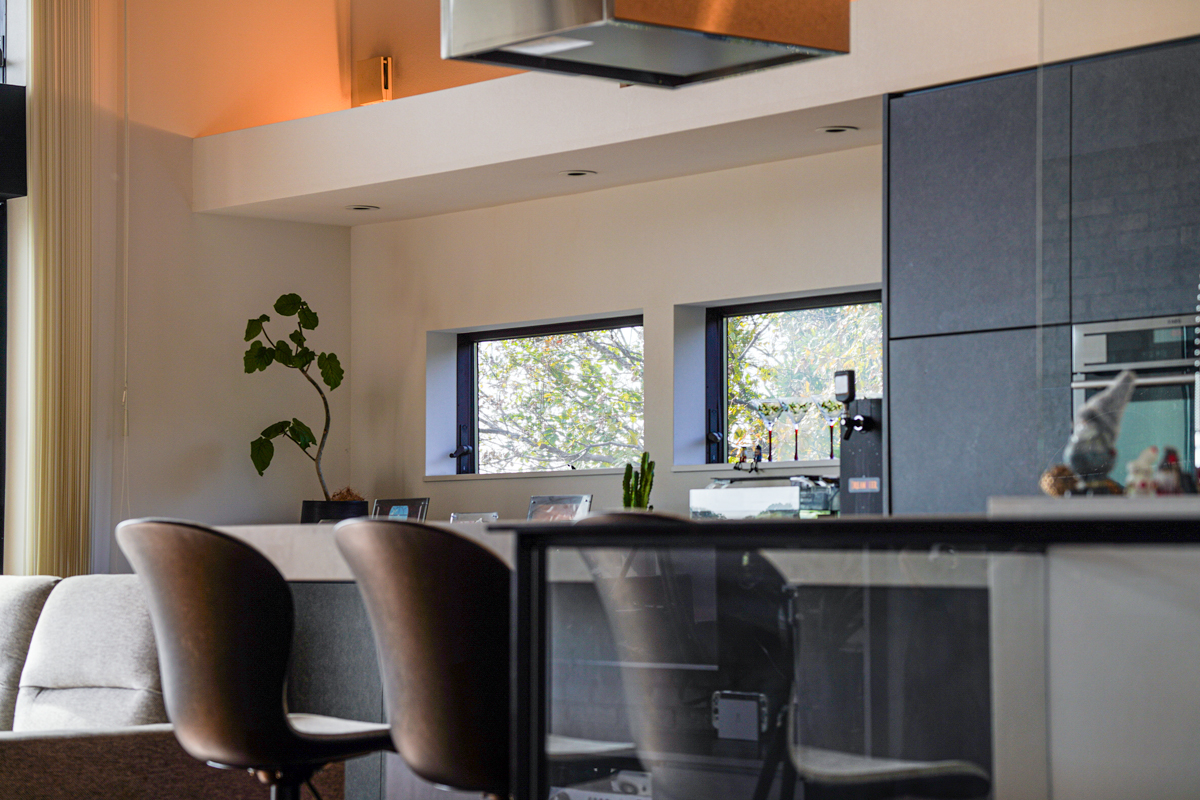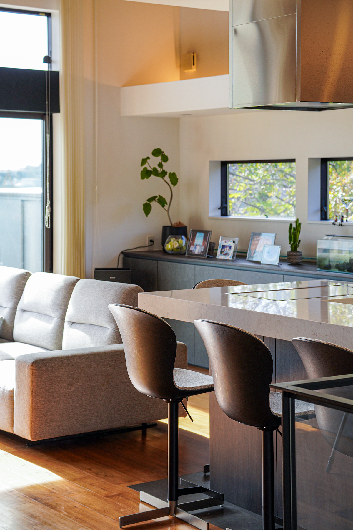 キッチンはLIVING PRODUCTSによるフルオーダー。壁一面の収納と一体化した端正なラインが、空間全体を引き締める。鉄板付きのカウンターは、料理を「見せる行為」へと変える。別荘における食事の時間を、単なる日常から、記憶に残る体験へと導く設えである。