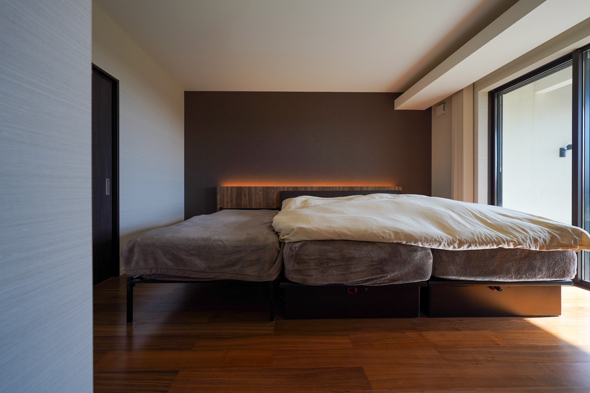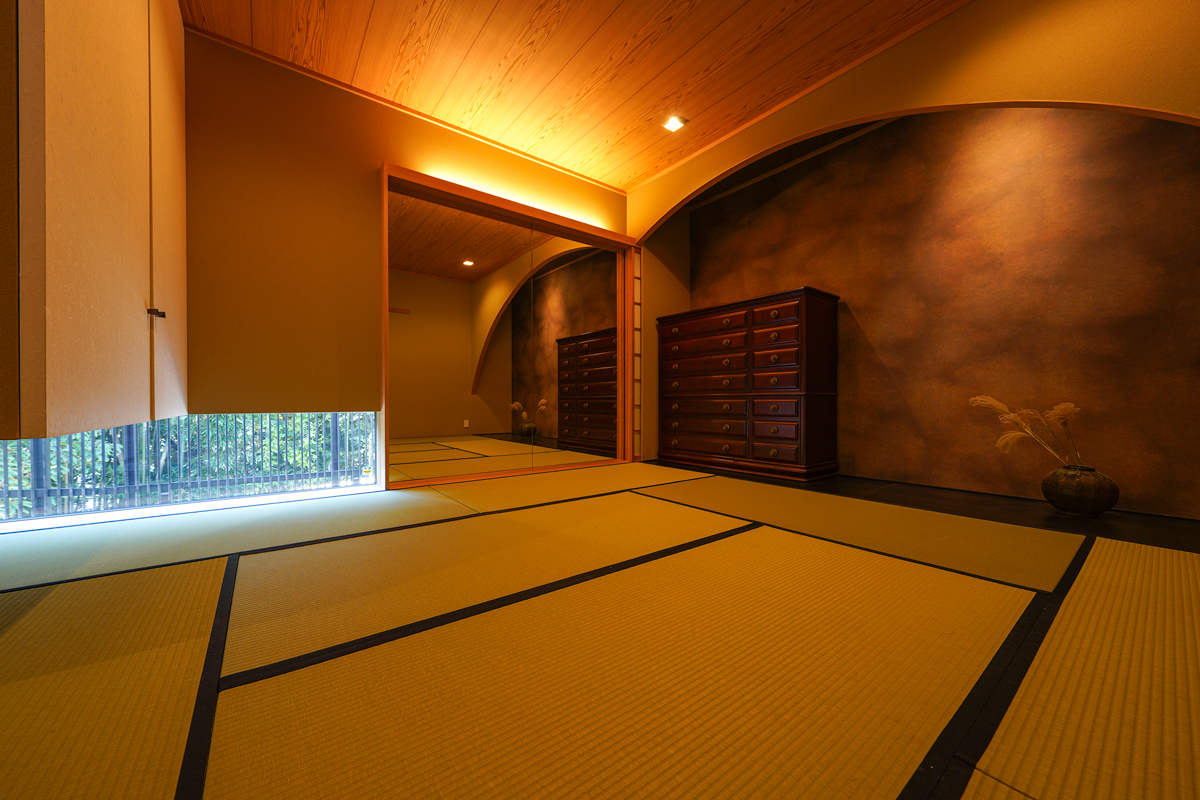 寝室やスタディは、眺望を確保しつつも、過度な主張を抑えた設計である。柔らかく制御された光が、深い安らぎをもたらす。本格的な設えの和室は、客間としての品格を備える。着付けを想定した大きなミラーと地窓からの採光が、静かで整った空間をつくり出している。