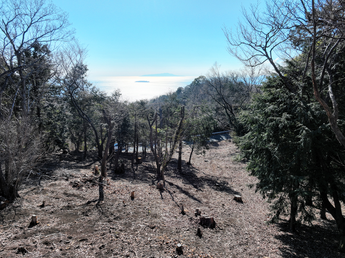 相模湾の先に初島と伊豆大島が浮かび、伊豆の岬郡が海へ沈み込むように伸びる。海面から立ち上がる水蒸気が光を含み、景色は刻々と表情を変える。伊豆山の森を前景に、海面に影を落としてゆっくり移動する雲を、目線の高さで眺める。眺望とは“絵”ではなく、時間の流れそのものだと実感できる場所である。