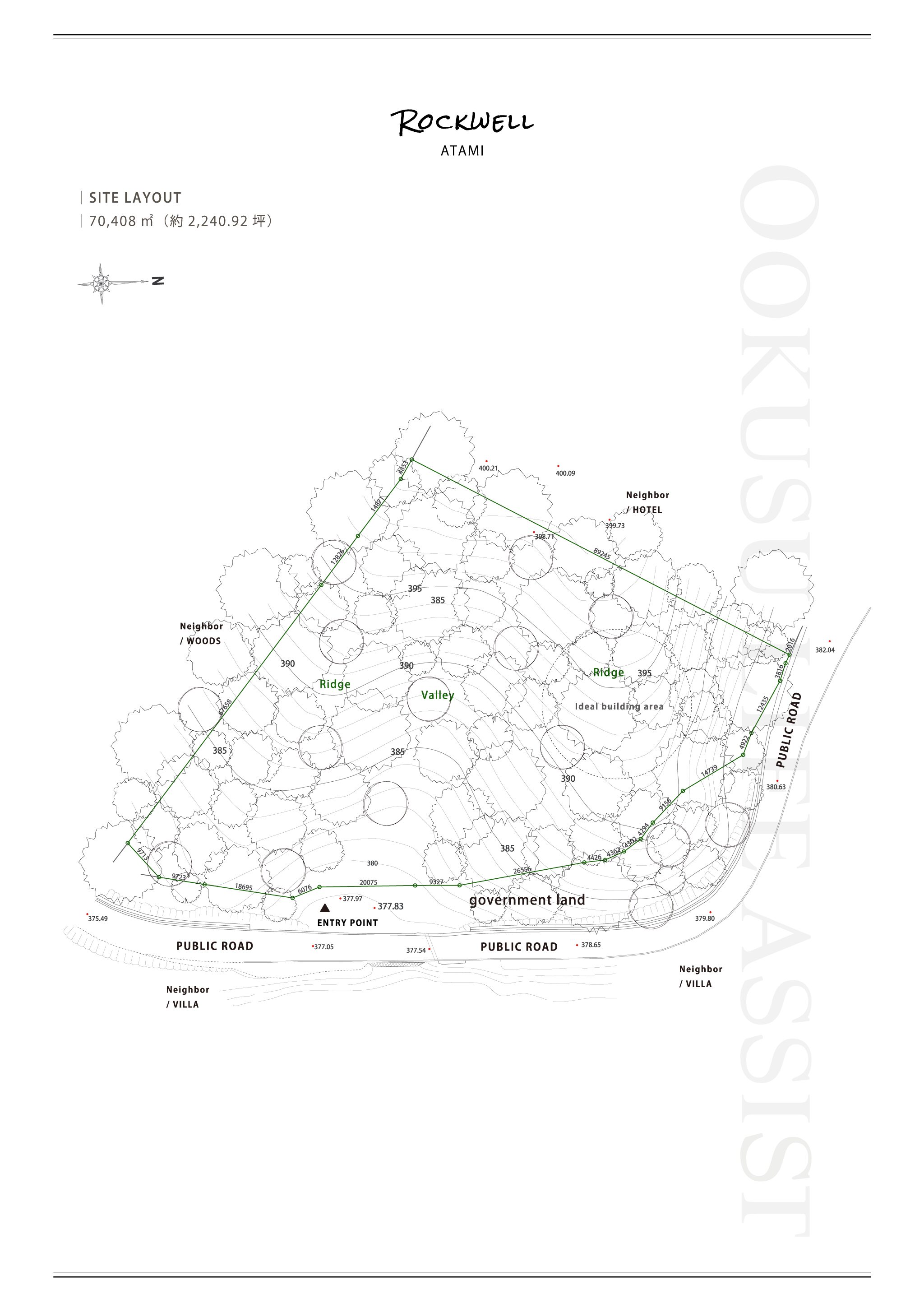 周囲には、壮大な眺めを望むヴィラや、広大な森の中に佇む大手企業の保養施設が点在する。大型ロットの分譲地であり、環境の密度が低いことが価値となる。