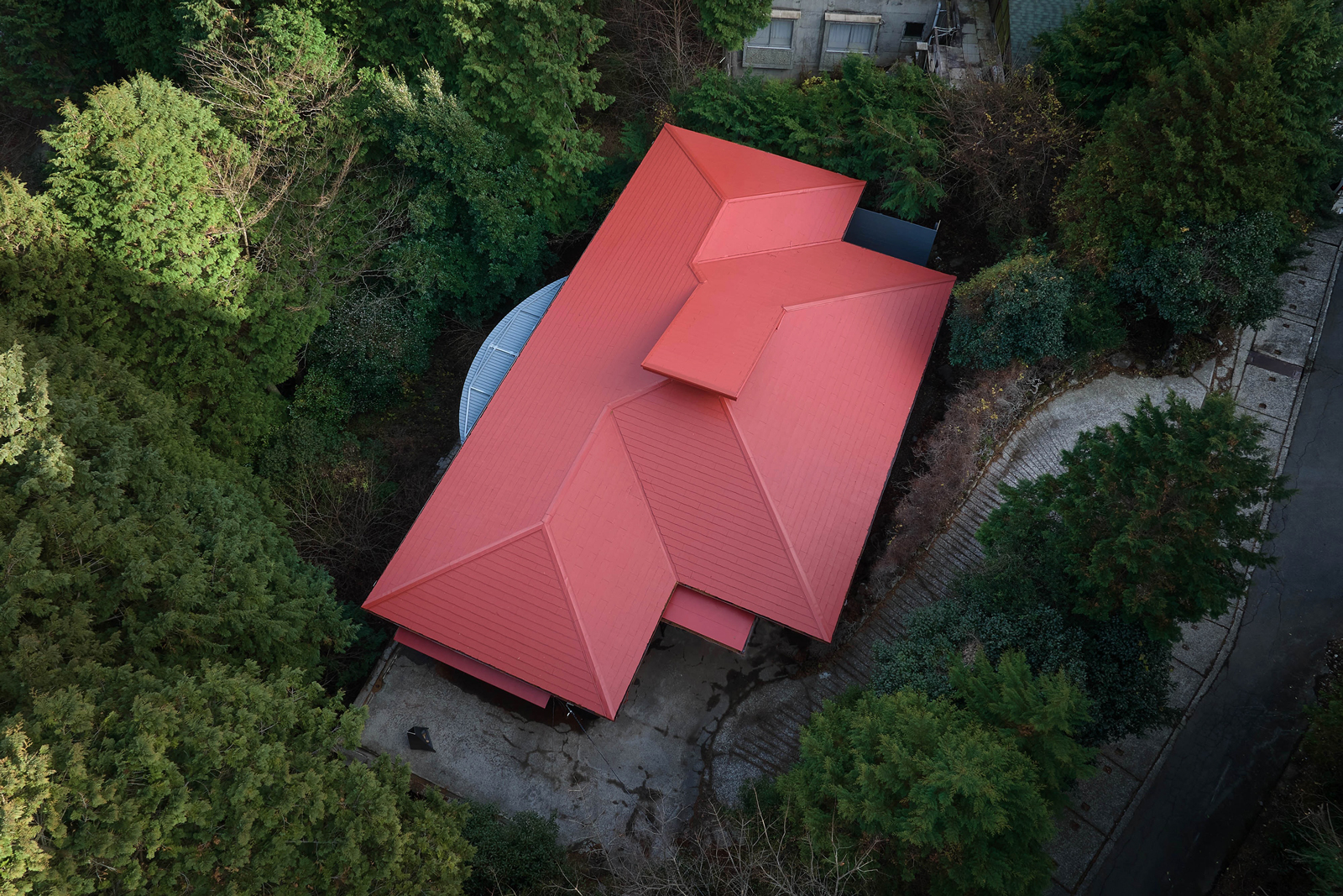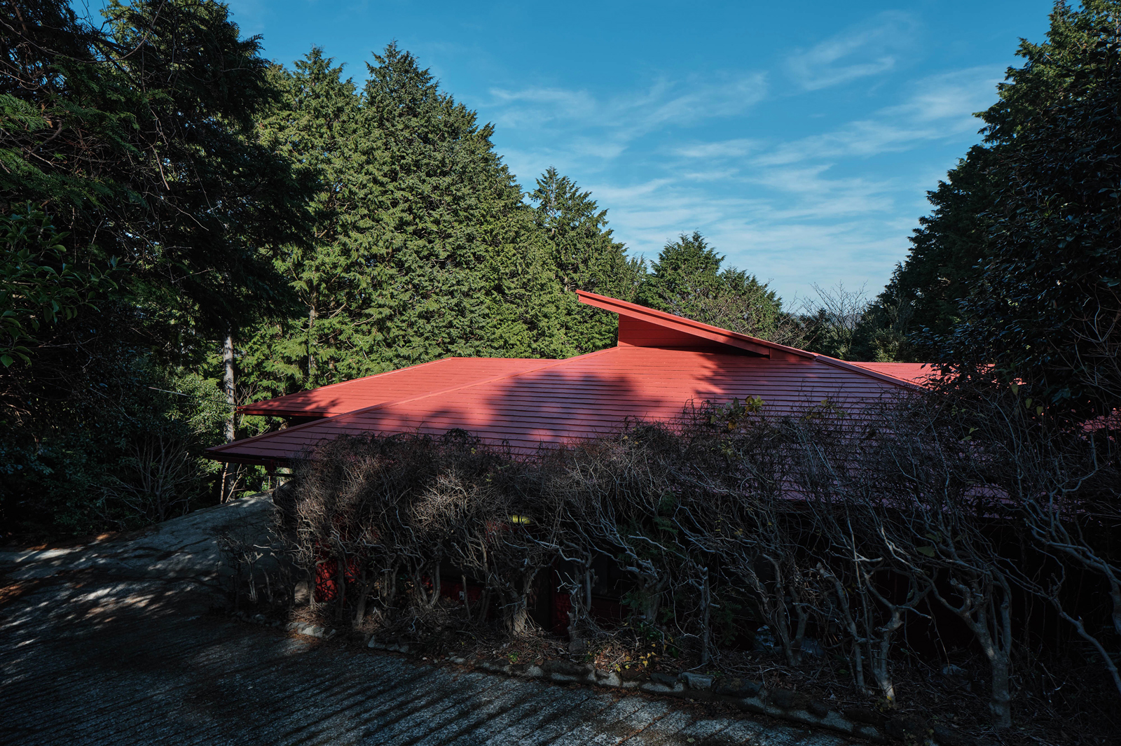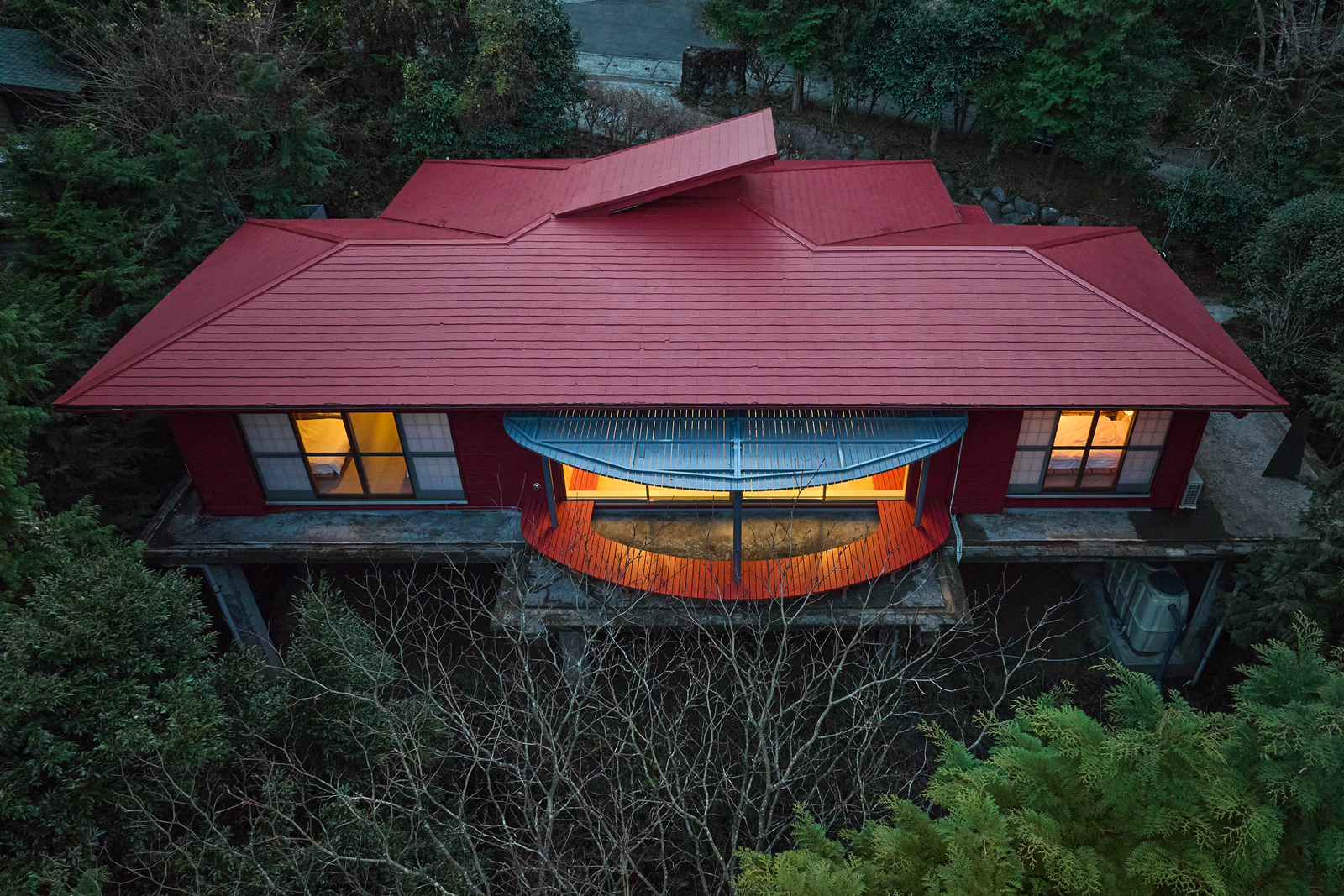 森に浮かぶ、弁柄色の平屋