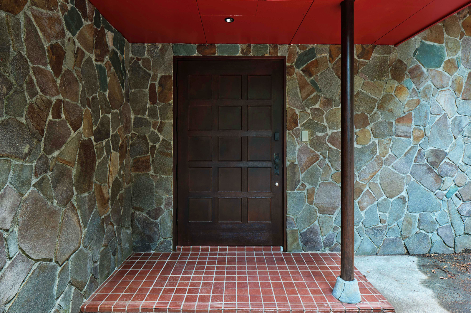 深い緑に対して、弁柄を基調とした色彩がよく映え、この家ならではの印象をつくっています。