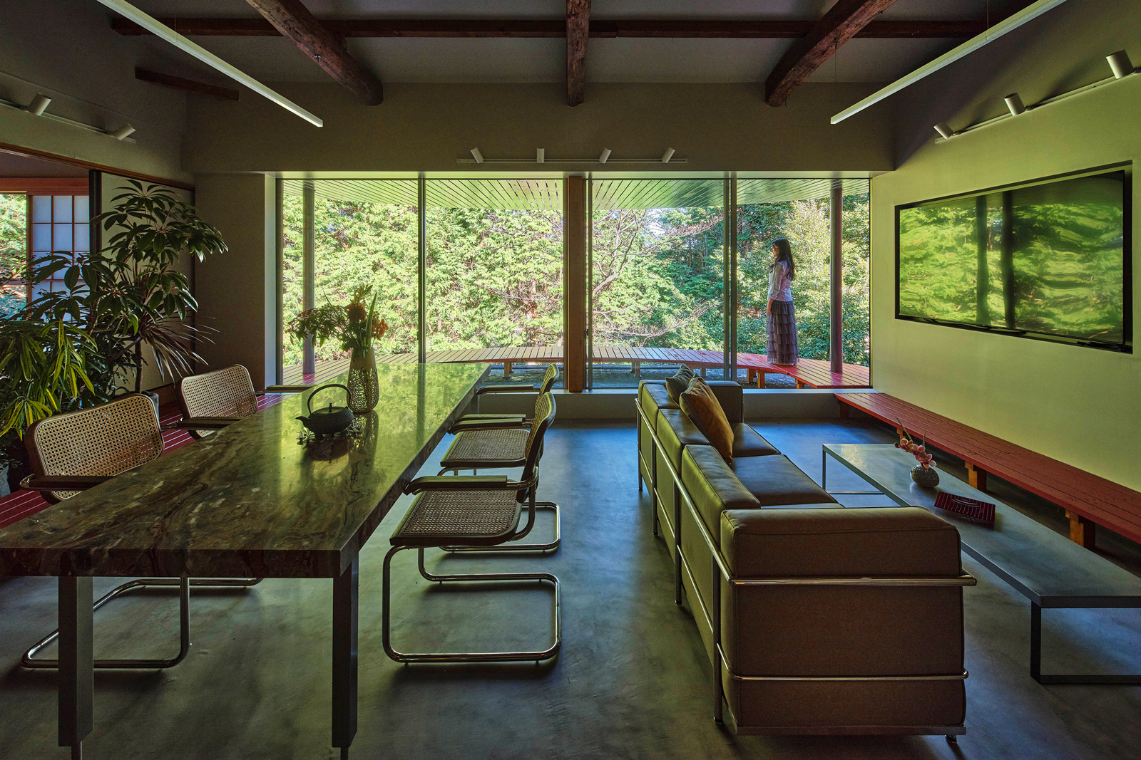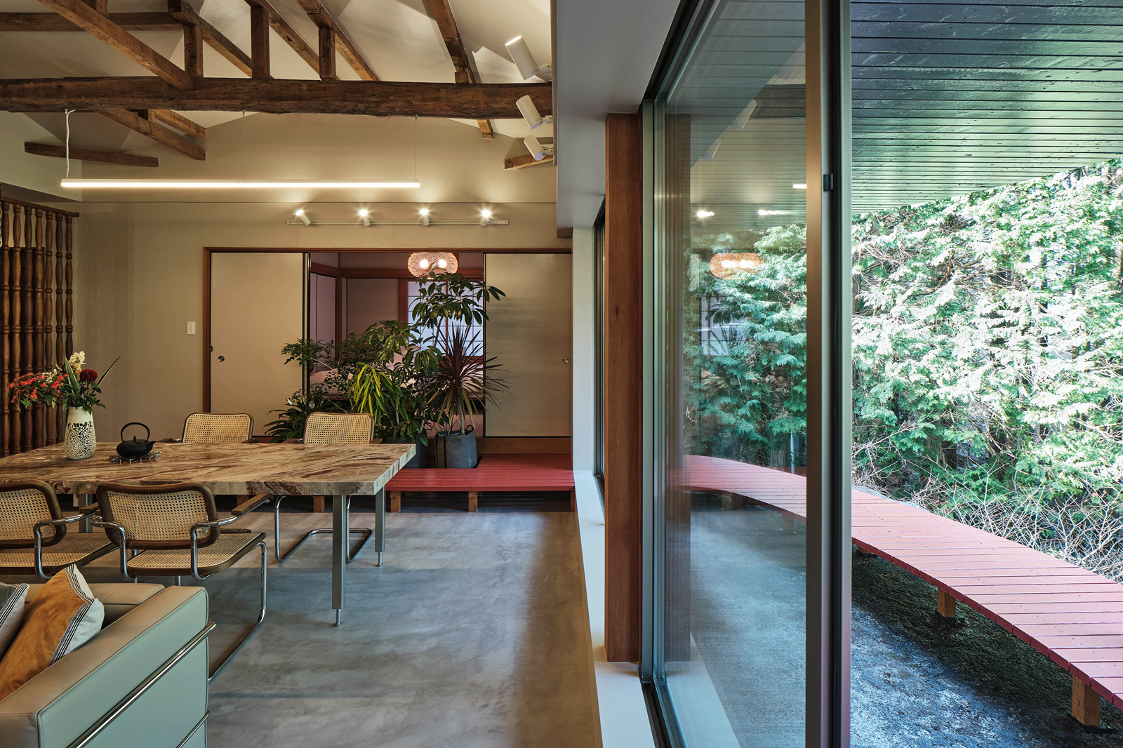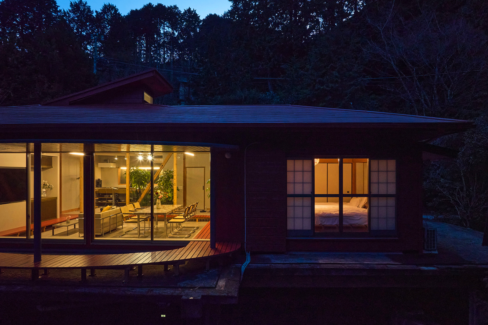 日本家屋のディテールを活かしながら、森の景色と響き合うよう、静かに再解釈されています。