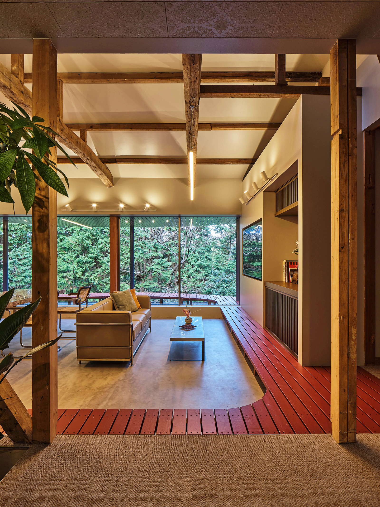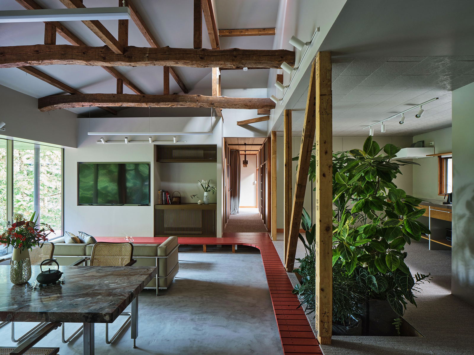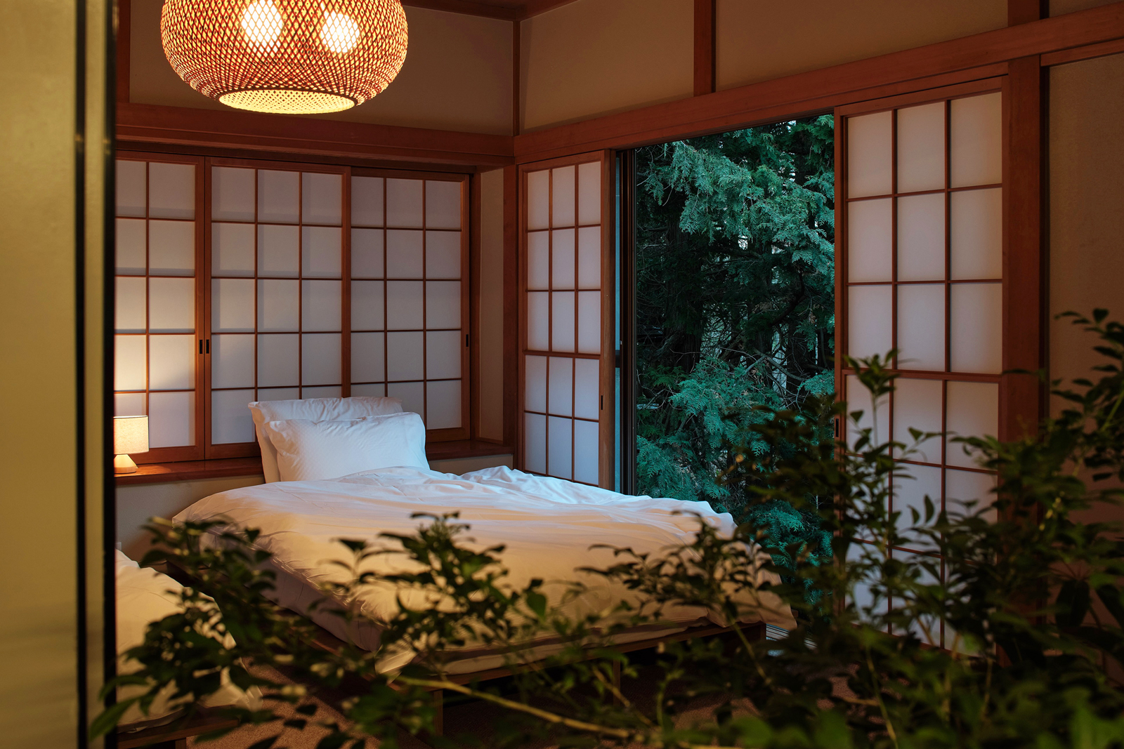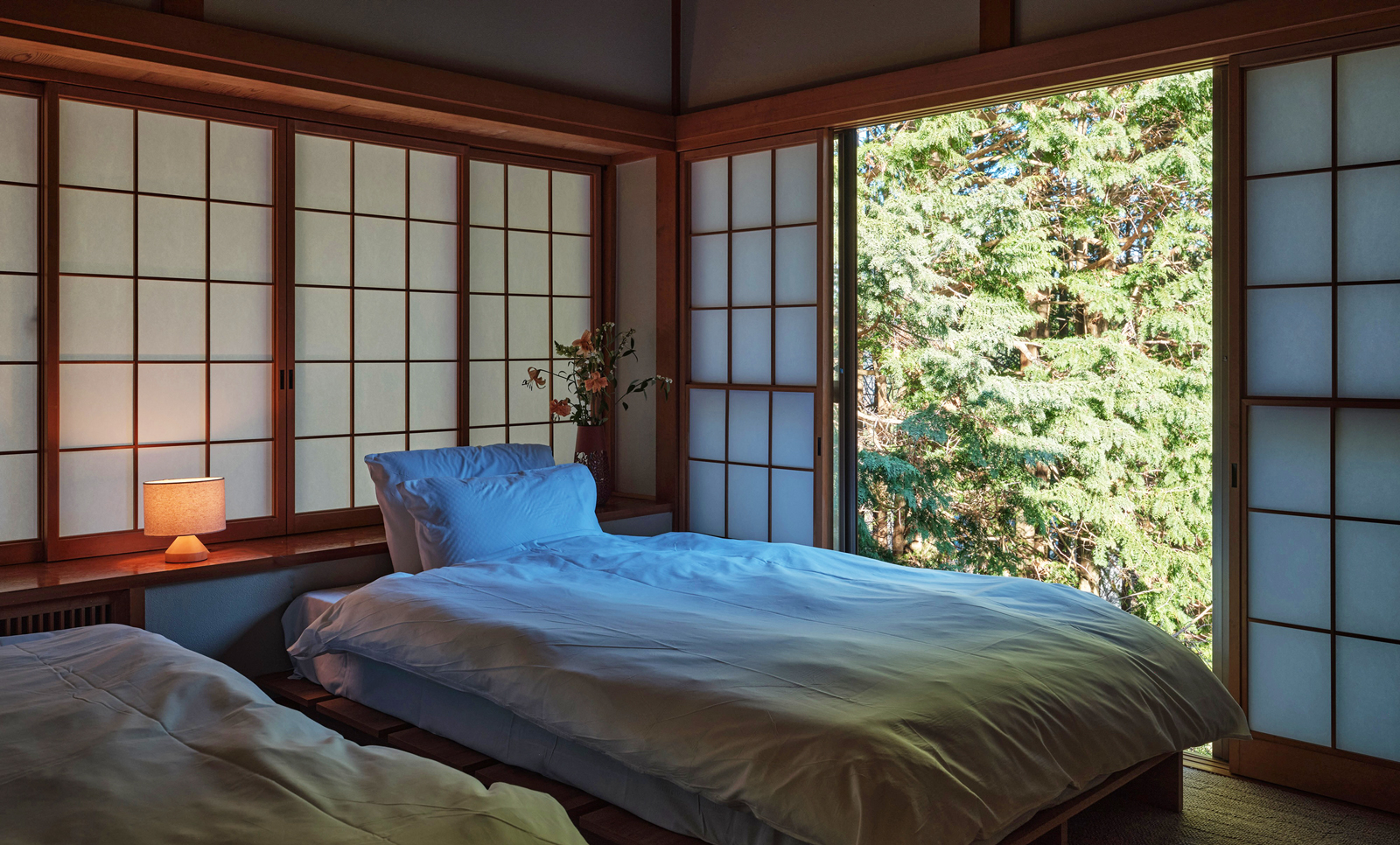 日本家屋のディテールを活かしながら、森の景色と響き合うよう、静かに再解釈されています。