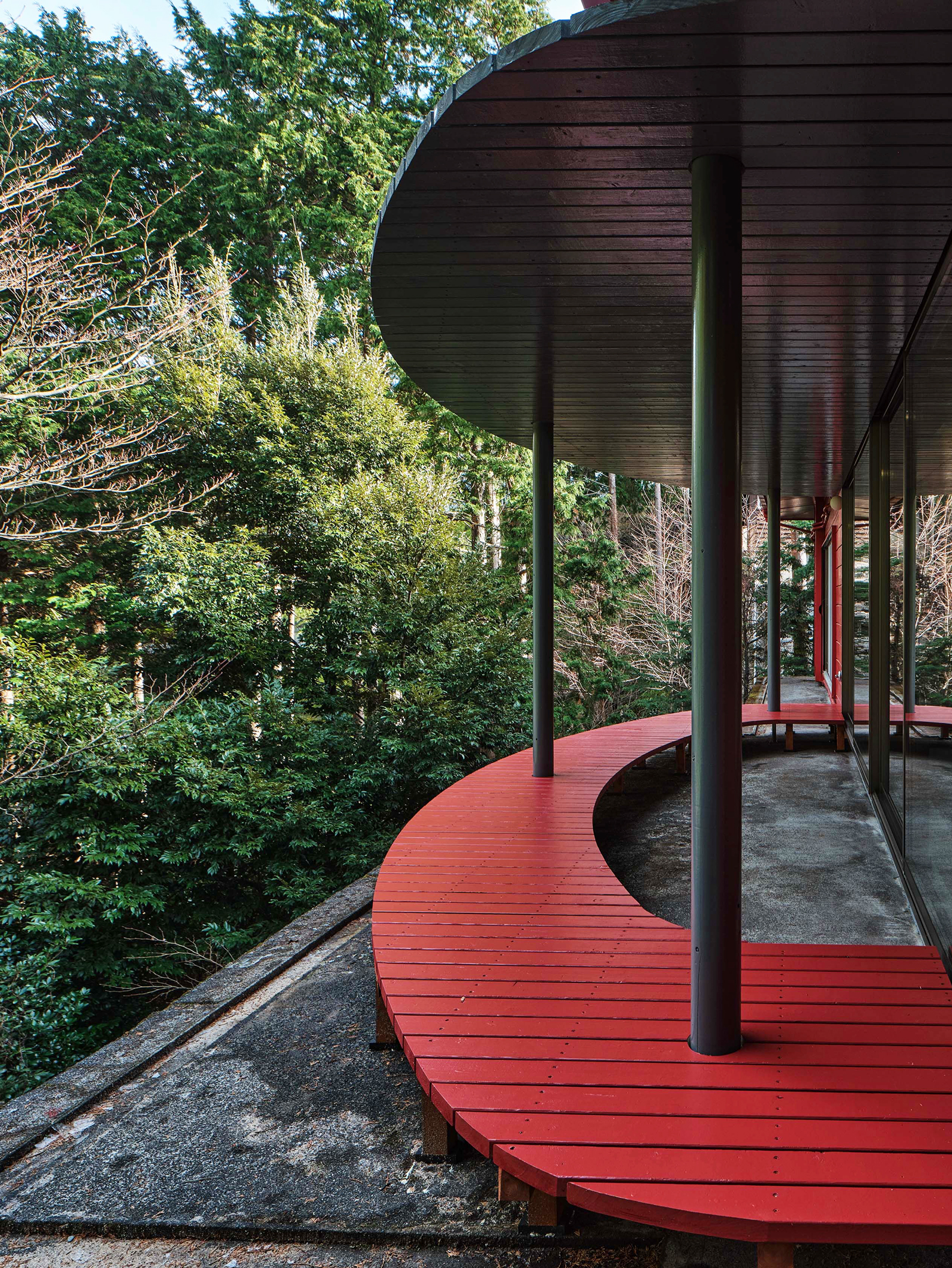 なかでも象徴的なのは、森に向かって弧を描くテラスです。