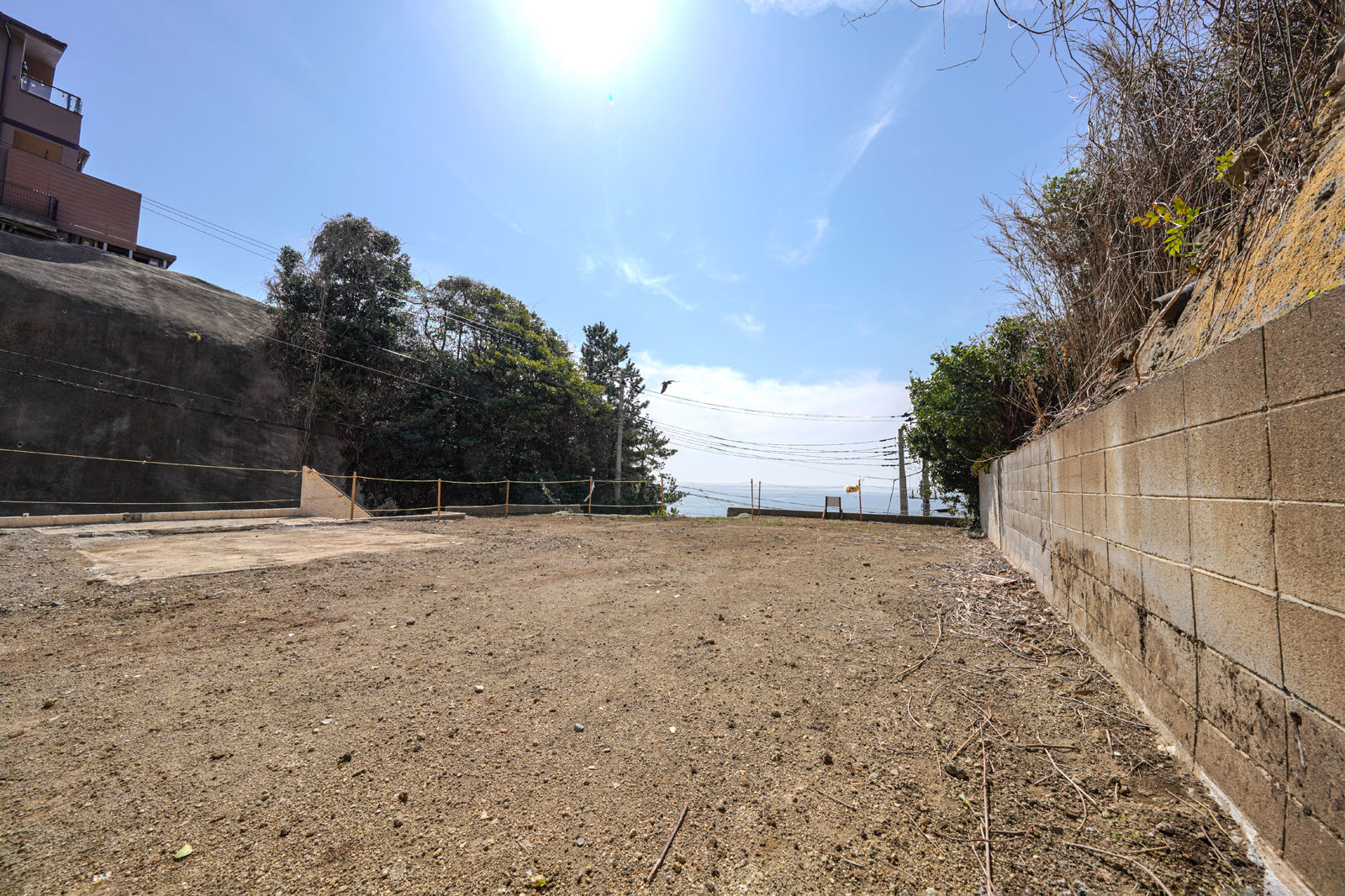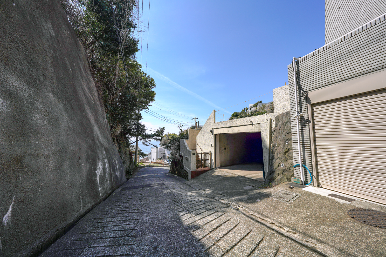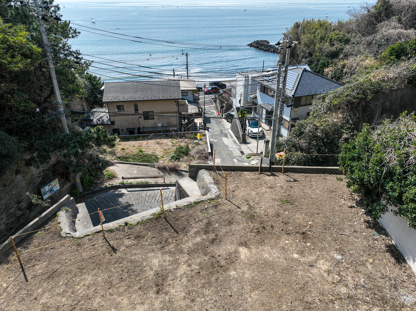 道から少し高く持ち上がった敷地、空へ向かって上るような階段のアプローチ、コーナーに位置することで得られる抜け、そして将来的にも保たれやすい海側の眺望。これらの条件が重なり、単なる売地ではなく、建築によって風景をつくる楽しみを秘めた土地となっています。