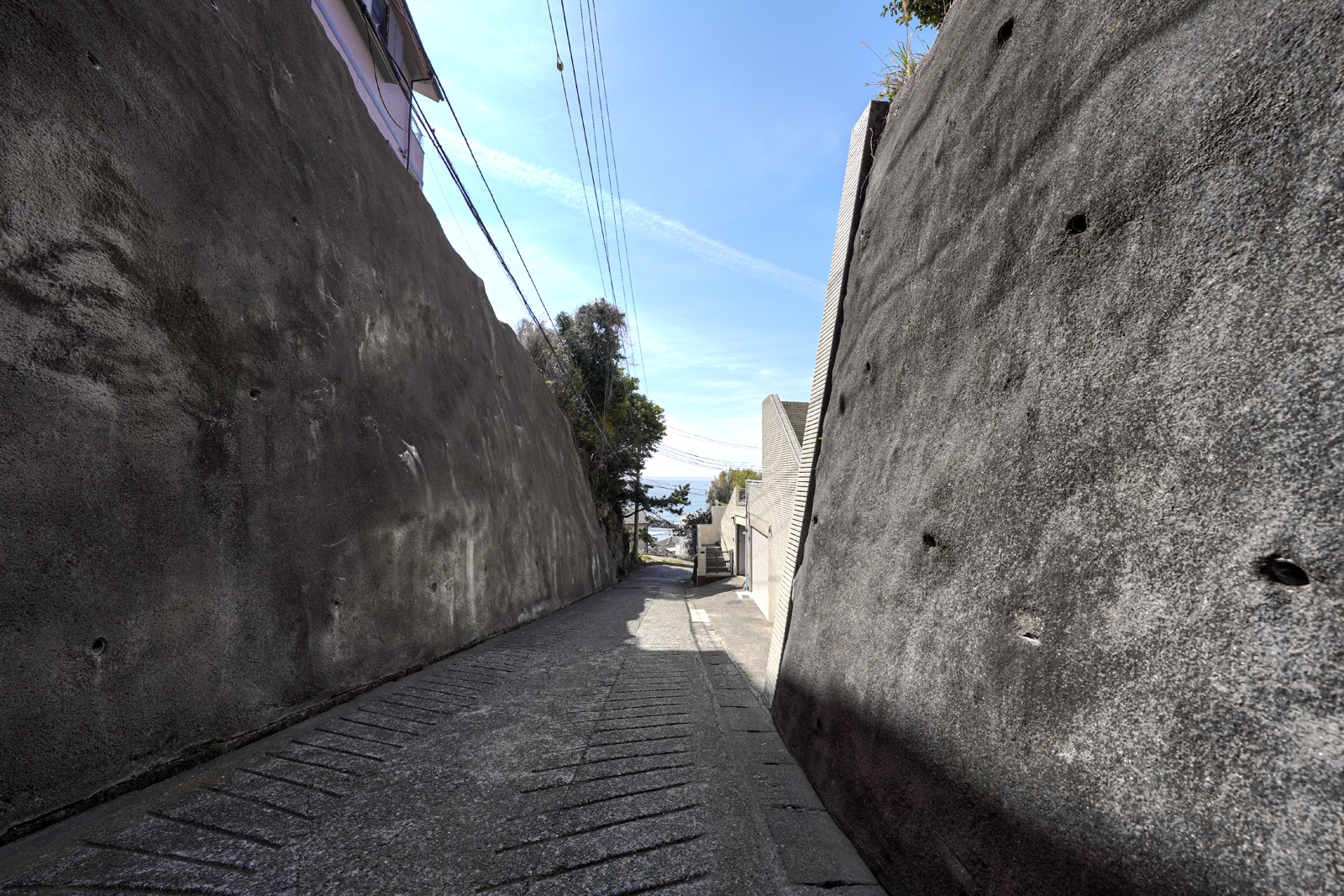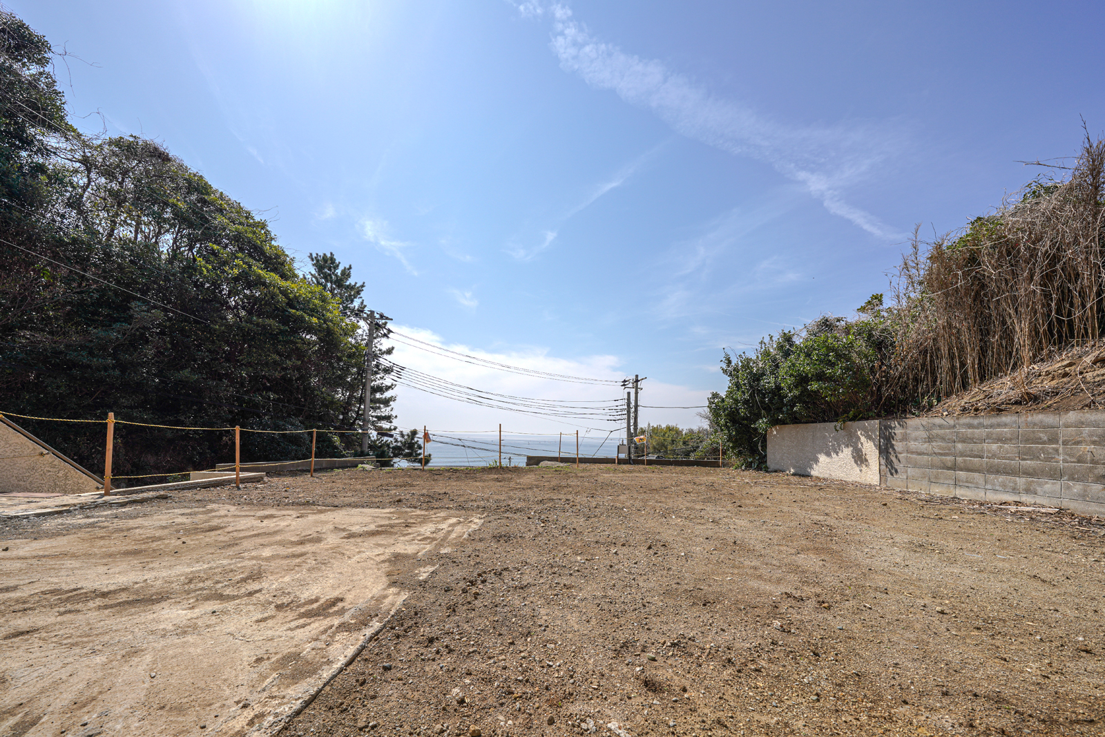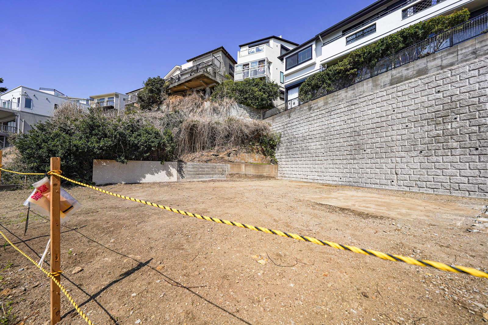 道から少し高く持ち上がった敷地、空へ向かって上るような階段のアプローチ、コーナーに位置することで得られる抜け、そして将来的にも保たれやすい海側の眺望。これらの条件が重なり、単なる売地ではなく、建築によって風景をつくる楽しみを秘めた土地となっています。